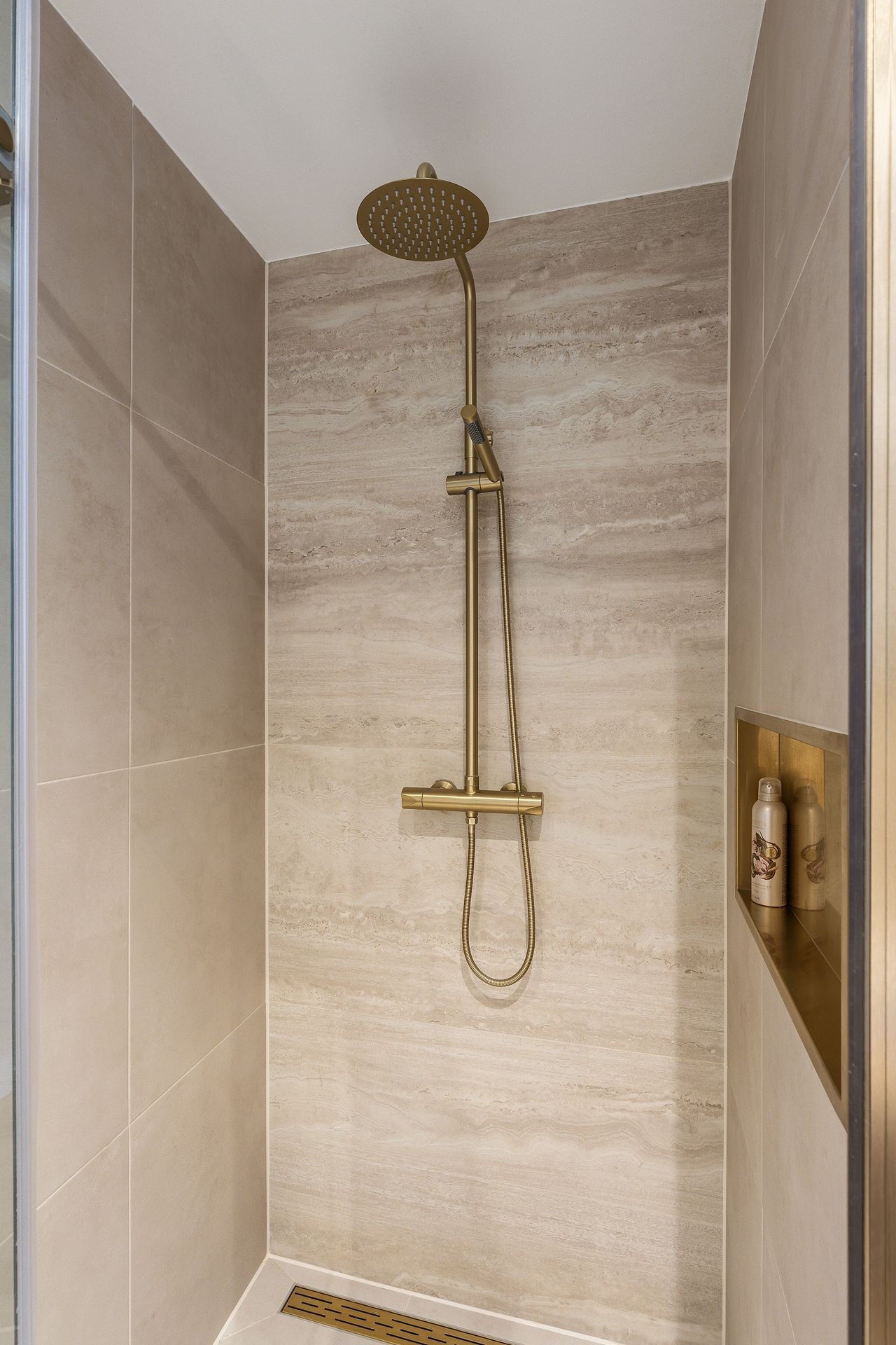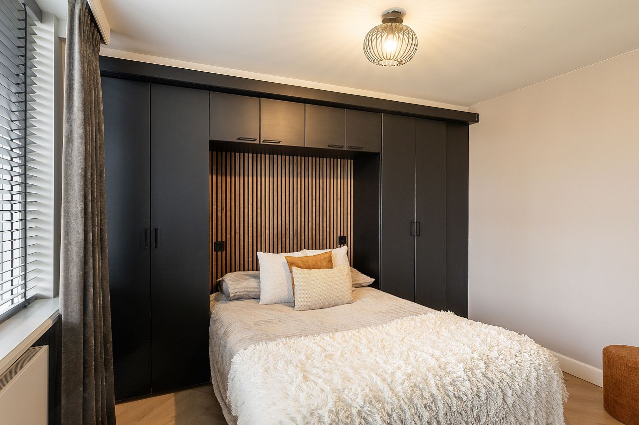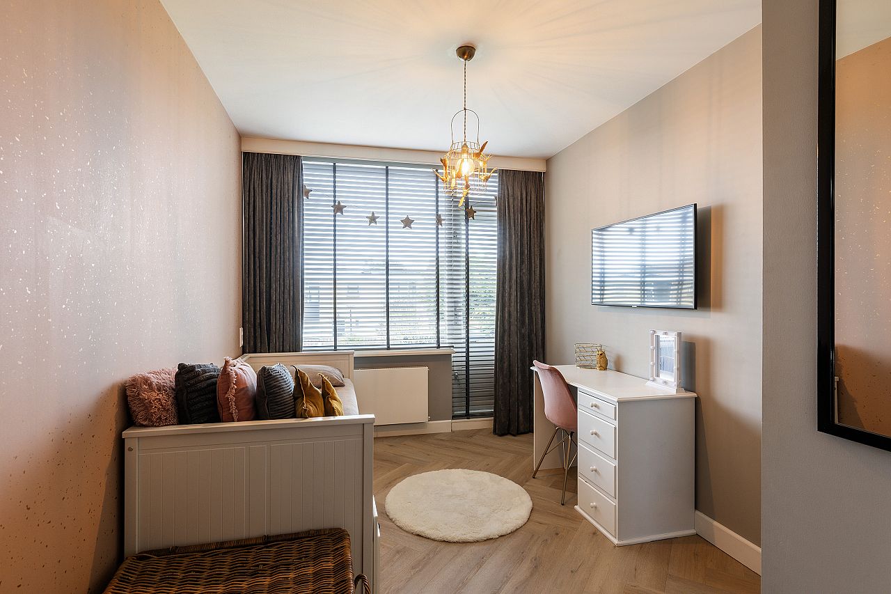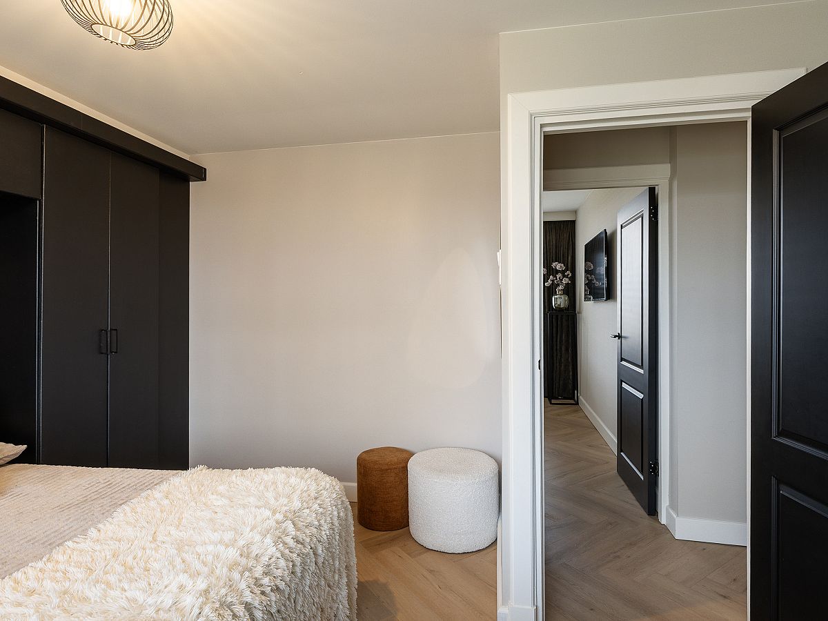 Overloop; achterslaapkamer met deur naar "balkon" (wegens ontbreken van hek, geen officieel balkon); 2e slaapkamer en toegang tot balkon, over de gehele breedte van de woning; voorslaapkamer; vernieuwde badkamer (2026) in lichte kleurstelling en voorzien inloopdouche, wastafelmeubel en 2e toilet.