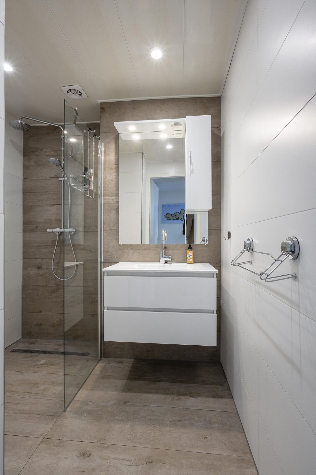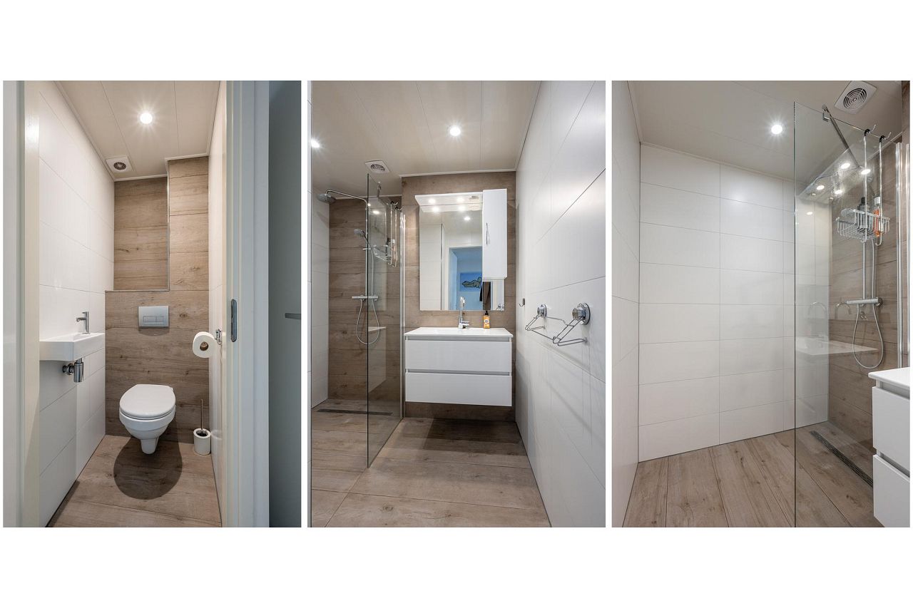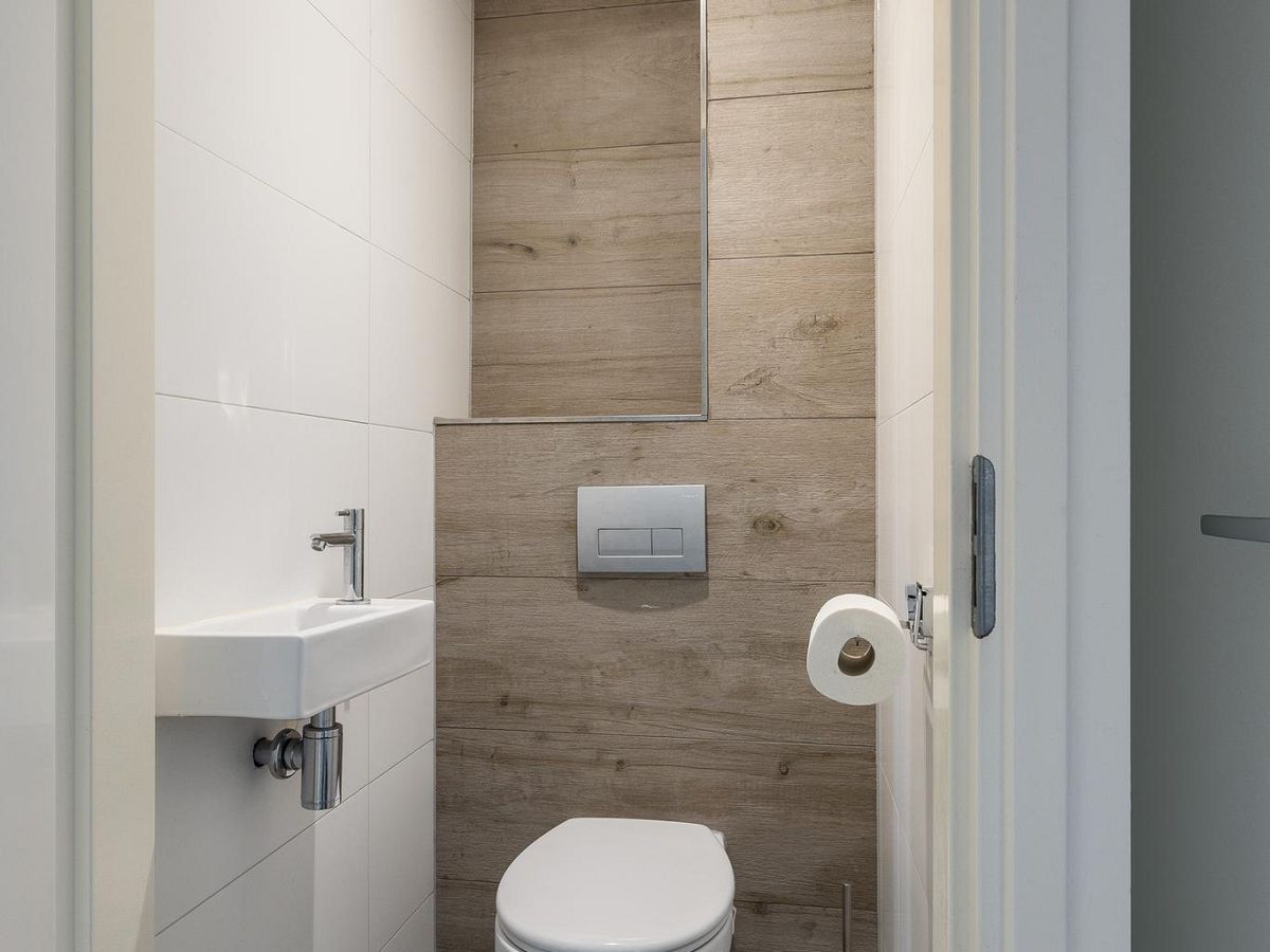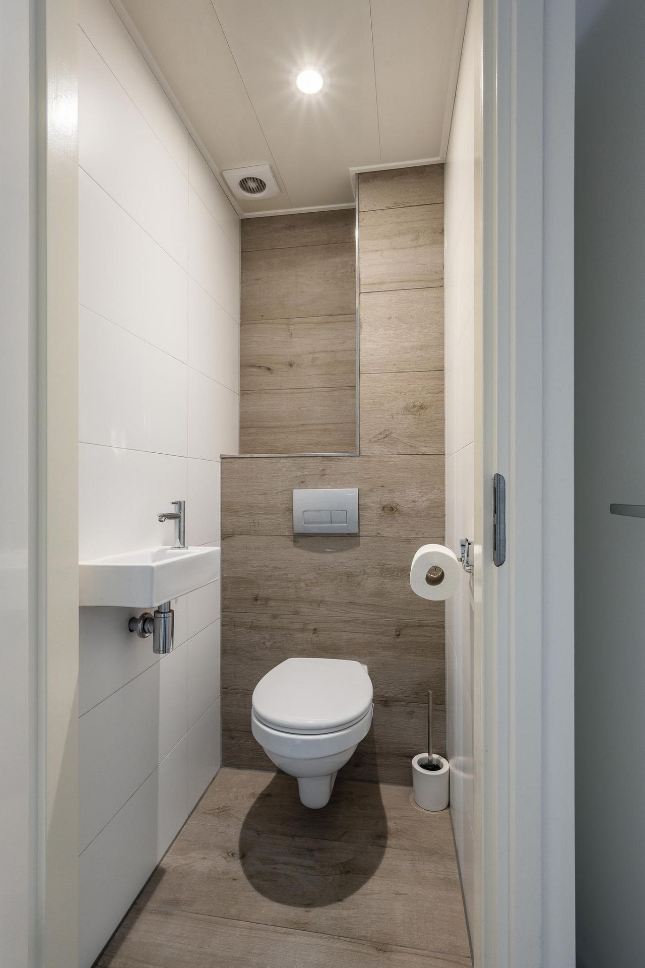 Apart toilet met hangend closet, fonteintje en sfeernis. Badkamer en toilet zijn beide volledig betegeld met luxe witte en houtlooktegels.