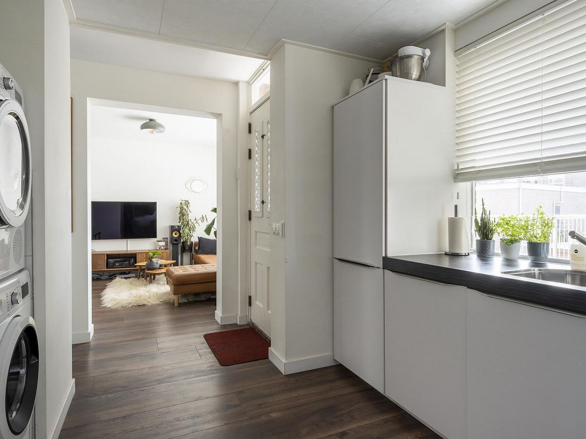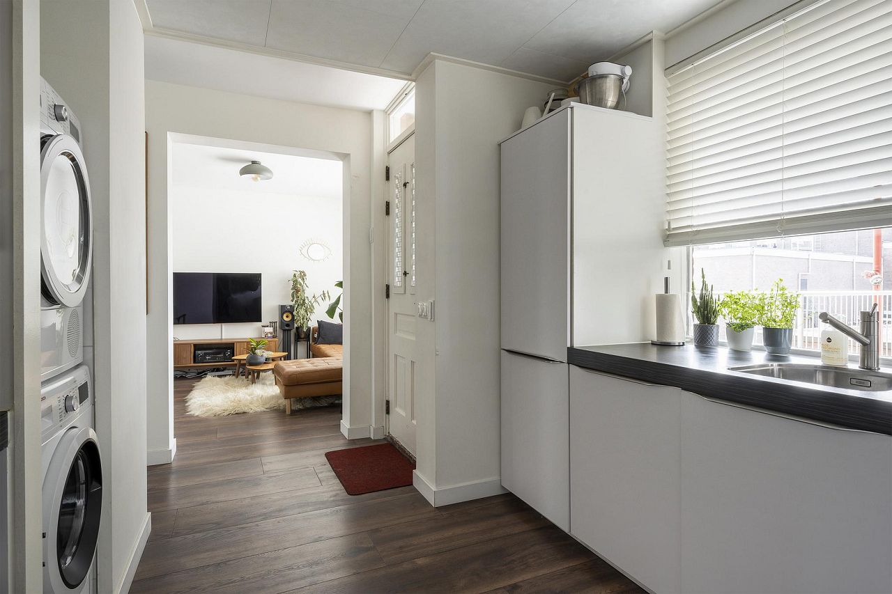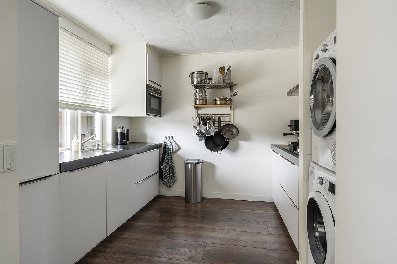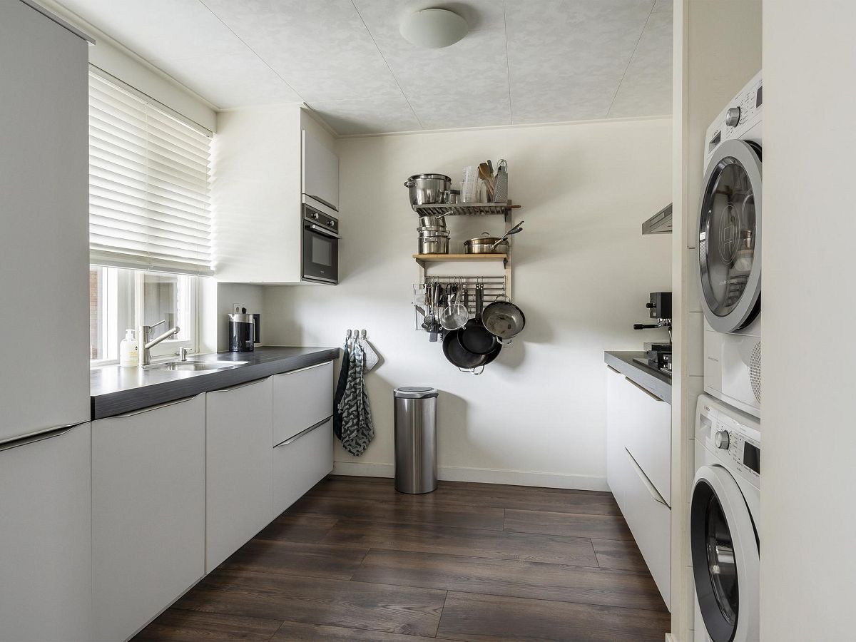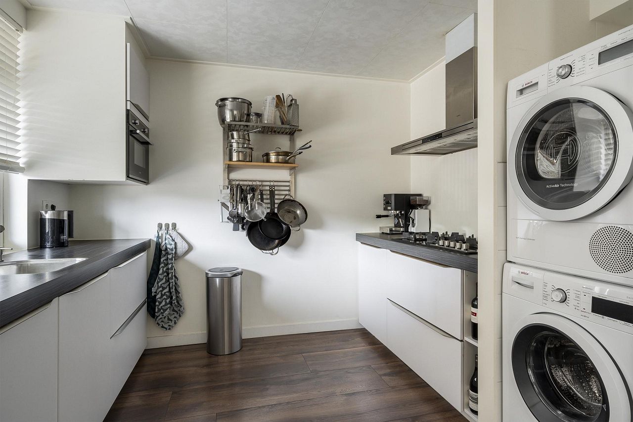De woonkamer staat in open verbinding met de ruime keuken van bijna 9 m2, met veel kast- en werkruimte, witte hoogglans fronts en een donkergekleurd aanrechtblad. In de keuken staan de volgende inbouwapparatuur: koelkast, 3-laden vrieskast, combi-oven/magnetron en de blikvanger: een prachtige Boretti gaskookplaat met 5 pitten (waarvan 1 wokbrander) met daarboven een luxe extra brede rvs afzuigschouw. In een handige, aparte nis is de wasmachineaansluiting voorzien, hier is eveneens plaats voor een droger.