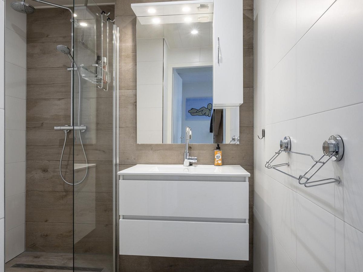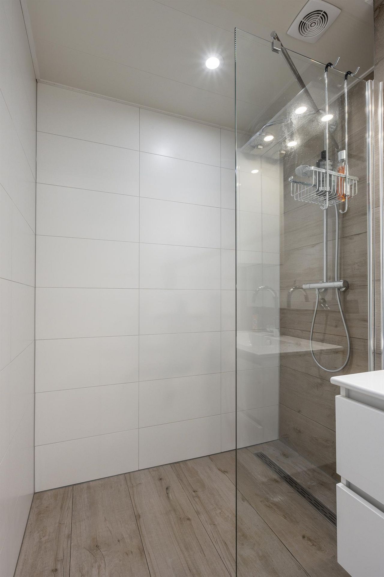 Badkamer van 3,8 m2 met design wastafelmeubel, door glazen wand afgescheiden inloopdouche met watergoot, regendouche en aparte handdouche.