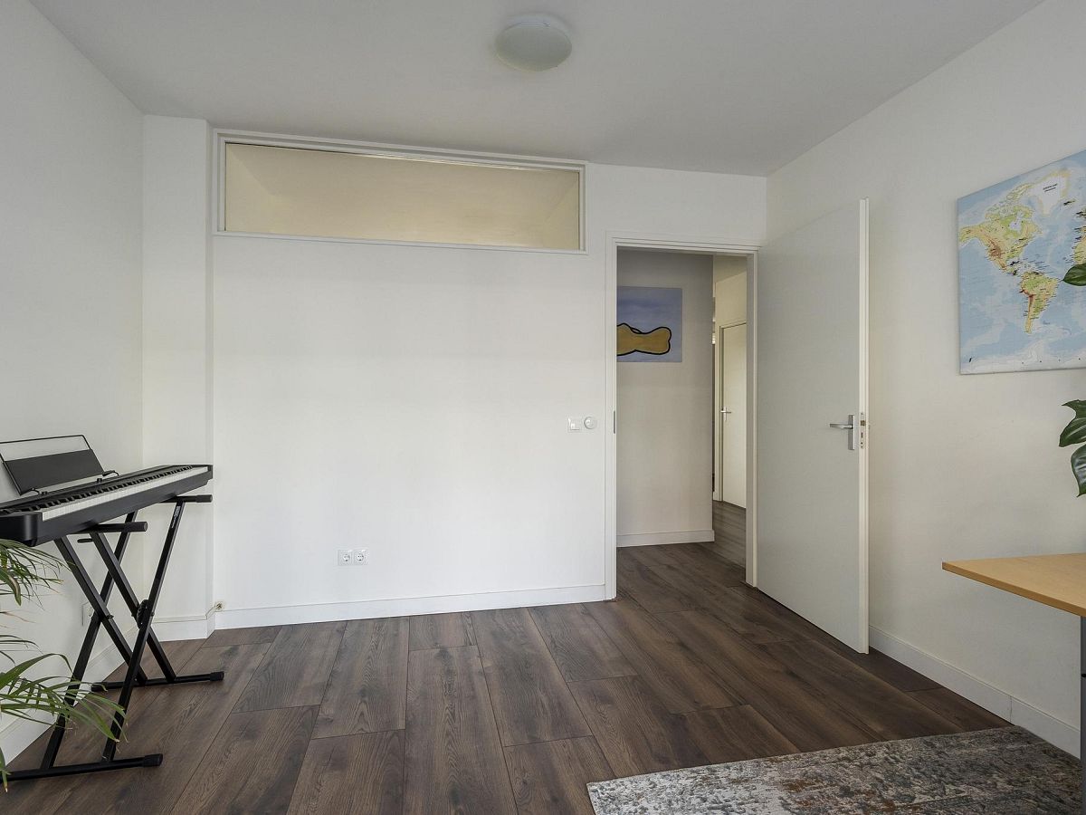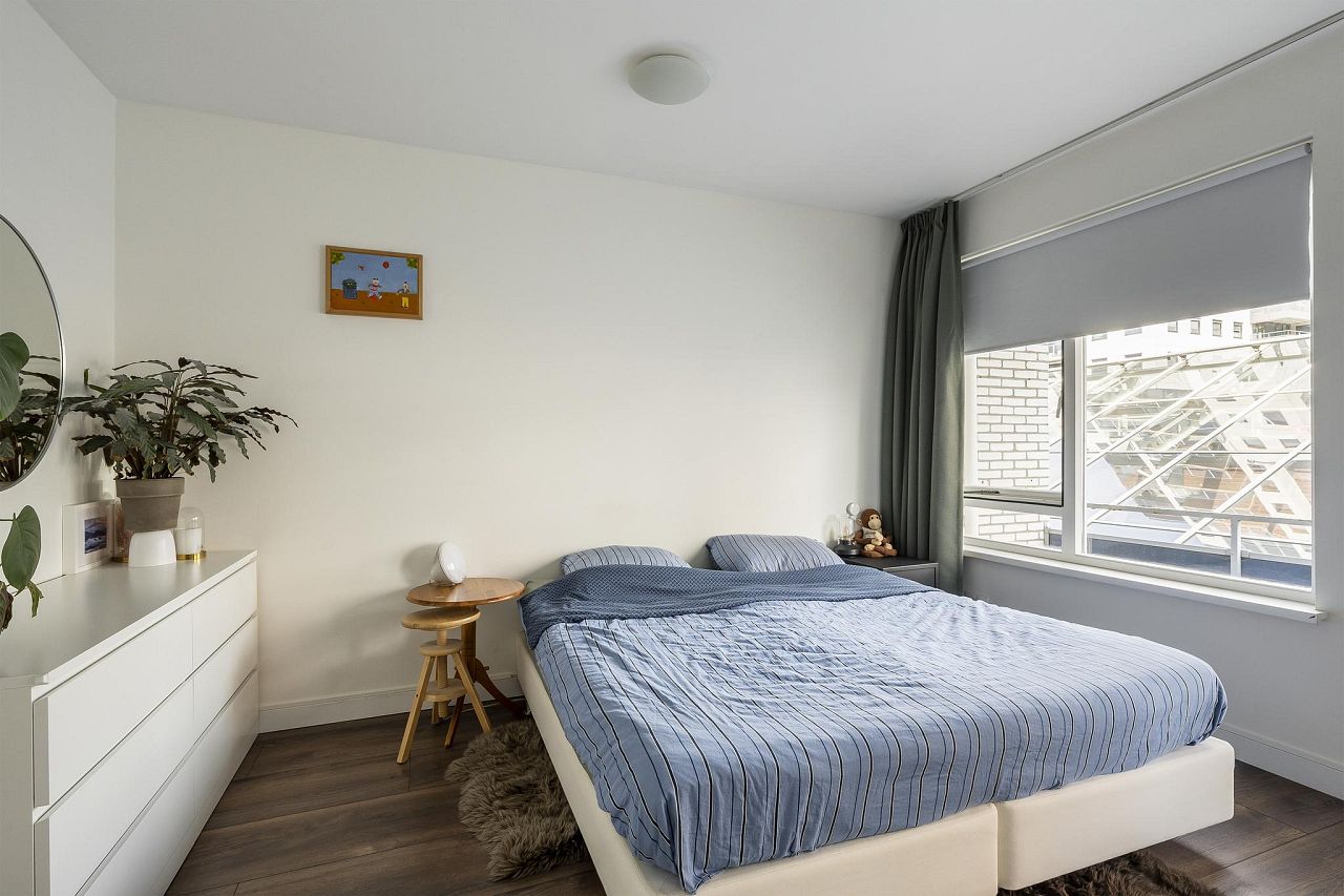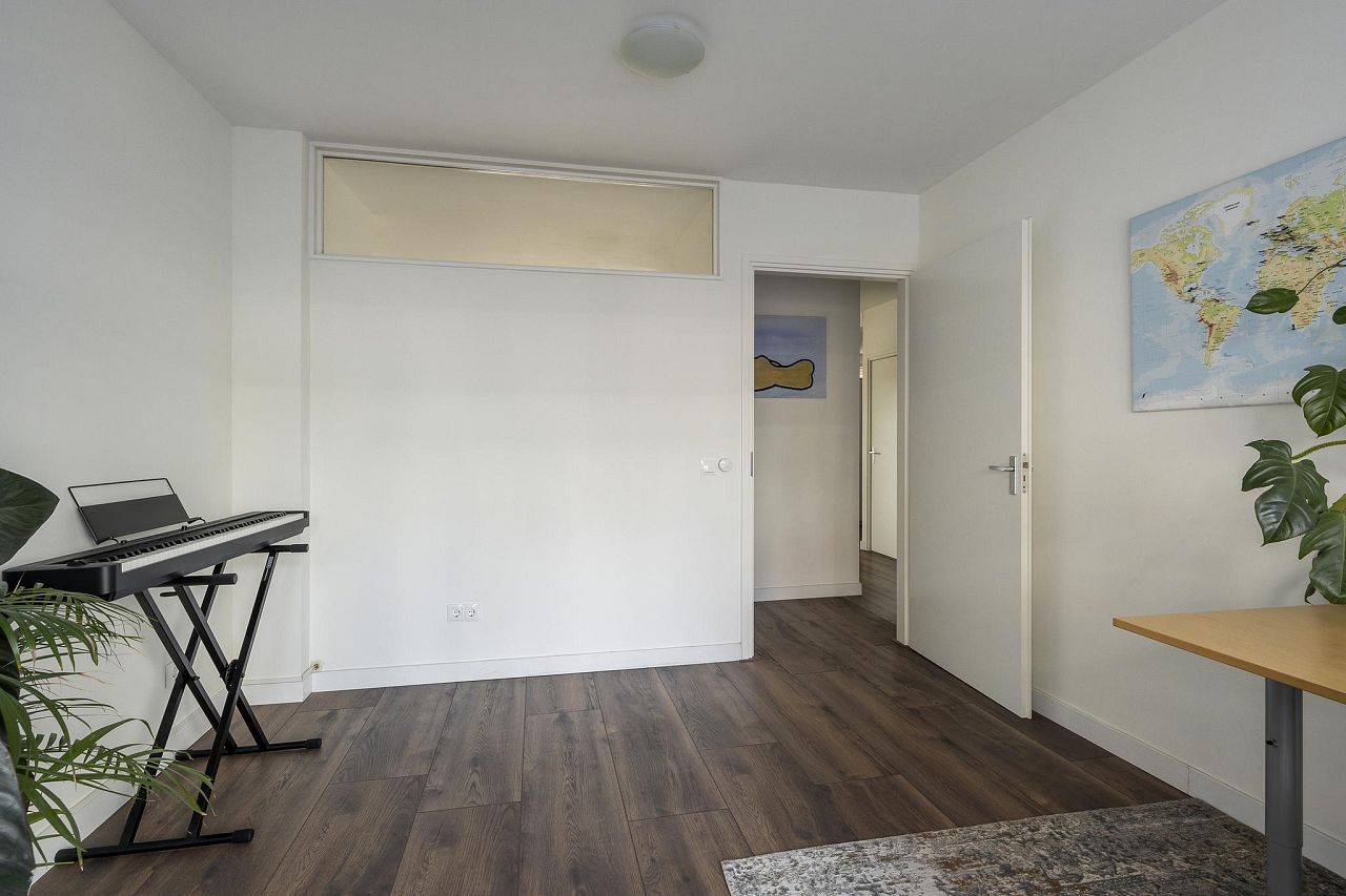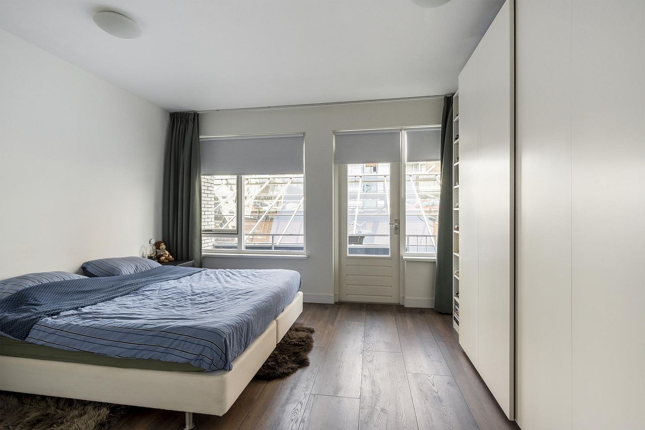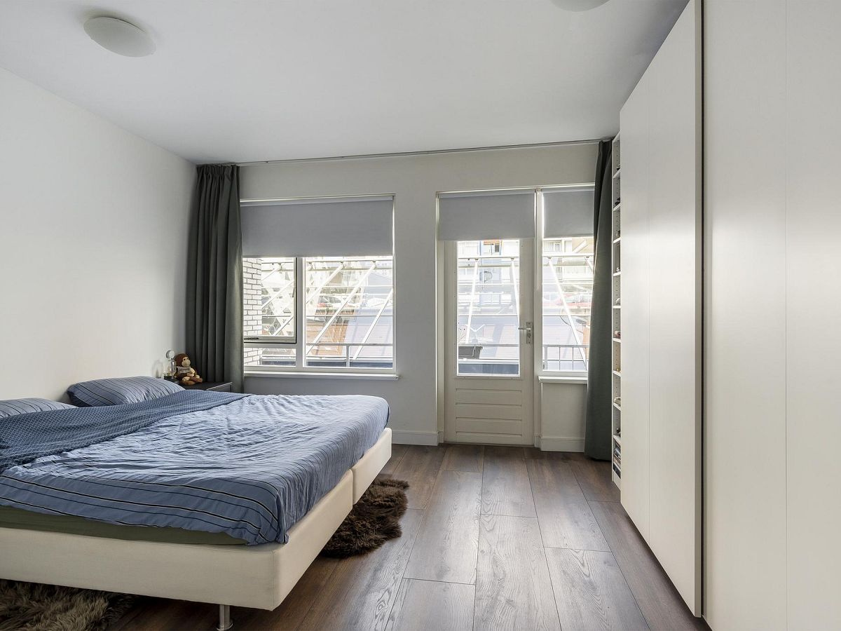 Aan de achterzijde van de woning bevinden zich de twee ruime slaapkamers van bijna 17 m2 – met toegang tot het balkon en eveneens te gebruiken als zitkamer – en bijna 14 m2.