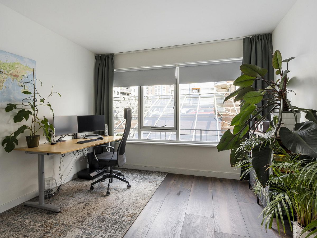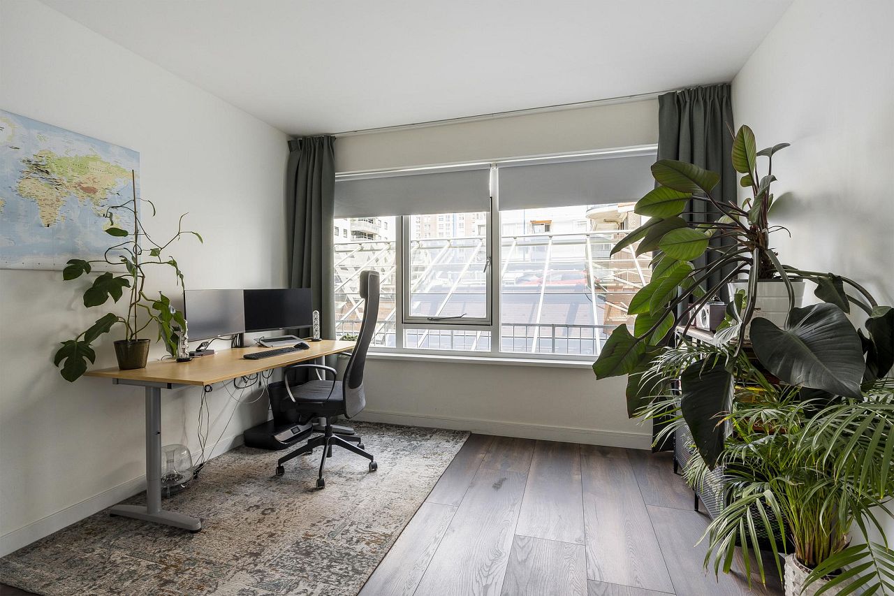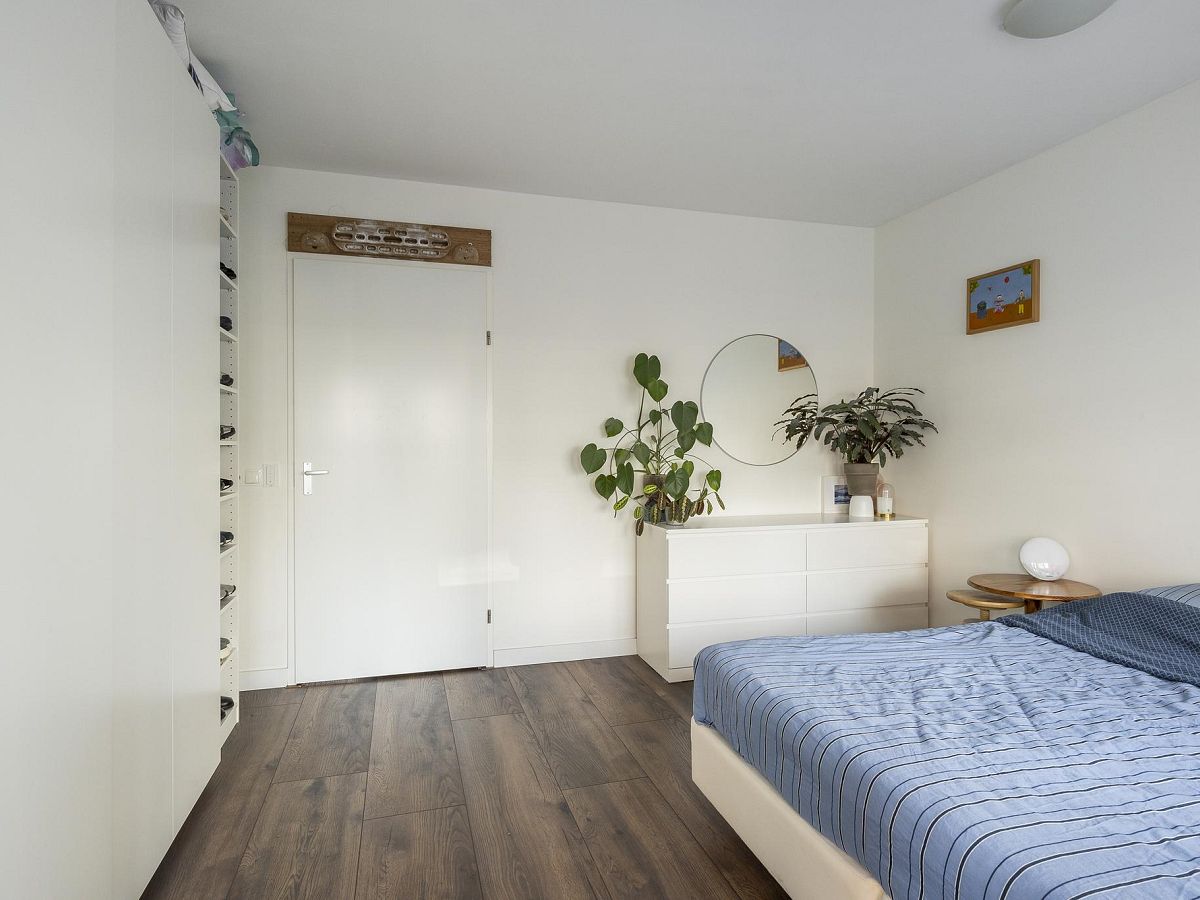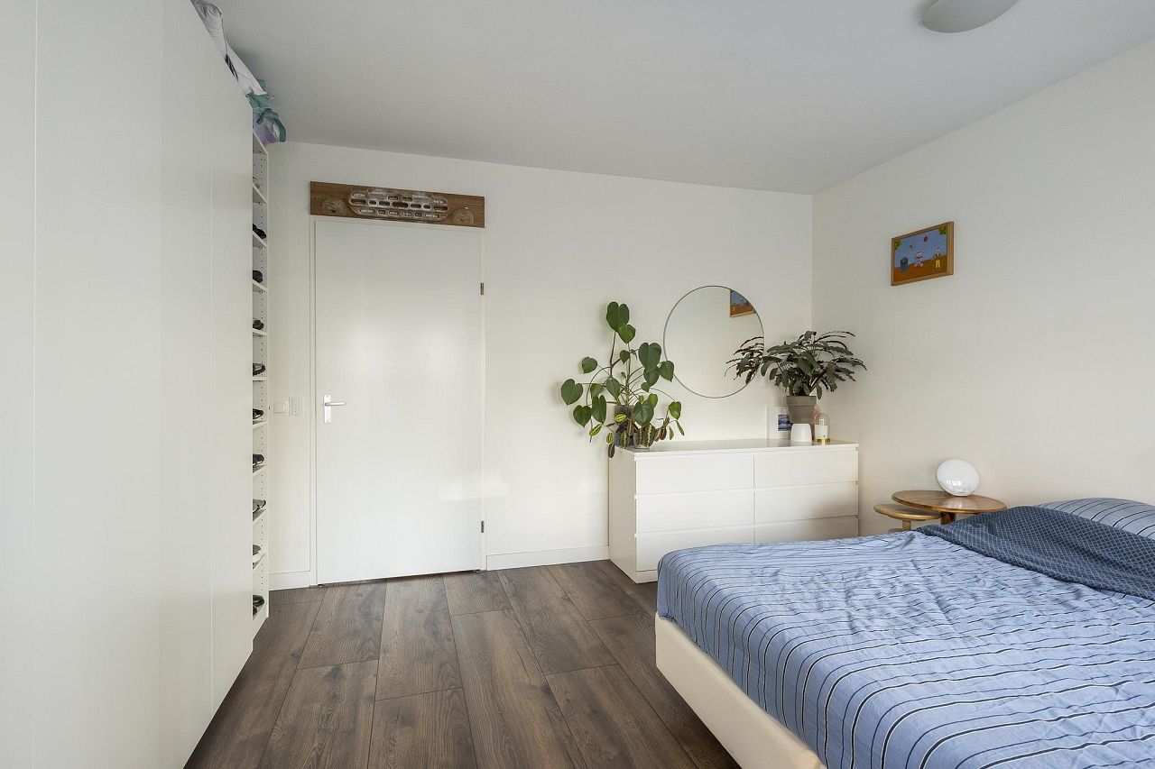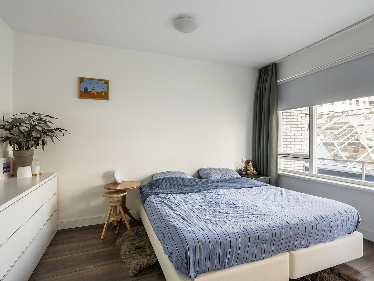 Aan de achterzijde van de woning bevinden zich de twee ruime slaapkamers van bijna 17 m2 – met toegang tot het balkon en eveneens te gebruiken als zitkamer – en bijna 14 m2.