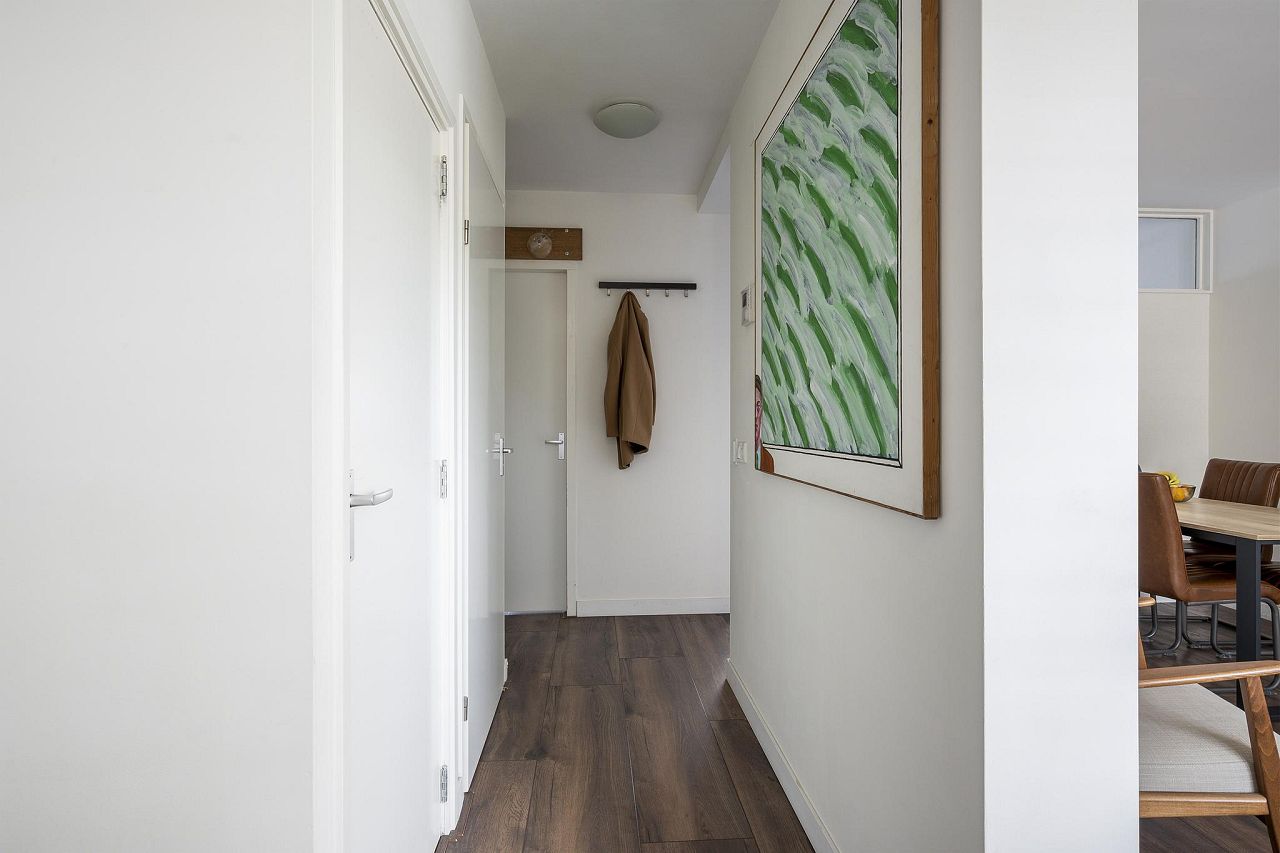 Nette, afgesloten entree met brievenbussen en luxe bellentableau, toegang naar kelder, trappenhuis en lift. Op de eerste verdieping ligt de woning op een gunstige plek met veel ruimte voor de deur, wat een prettig open gevoel geeft.