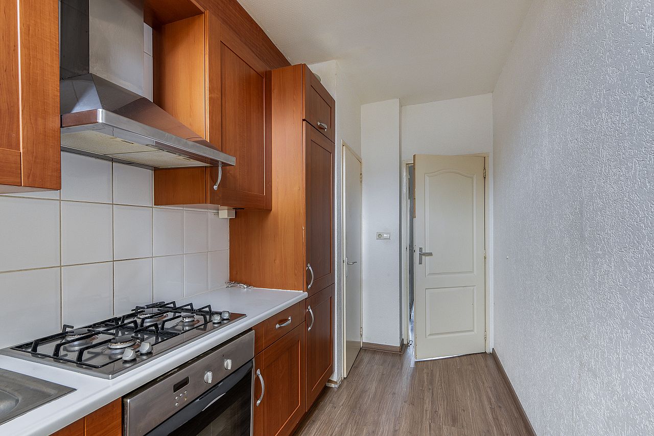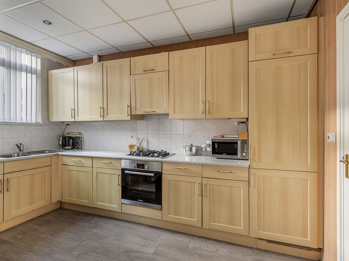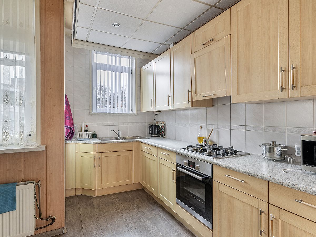 Overloop; voorraadkast; geheel betegelde toiletruimte; L-woonkamer voorzien van laminaatvloer, systeemplafond en toegang naar de ruime open keuken welke is voorzien van 4 pits gaskookplaat, afzuigkap, koel/vriescombinatie, oven en vaatwasser; toegang tot het voormalig balkon, welke nu overdekt is.