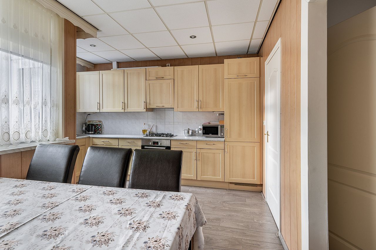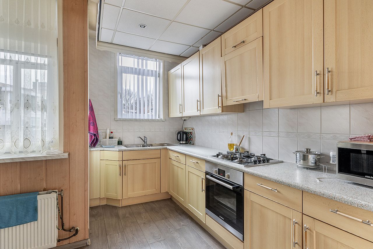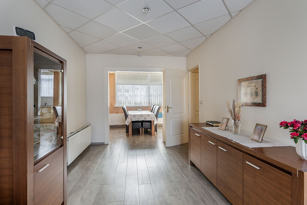 Overloop; voorraadkast; geheel betegelde toiletruimte; L-woonkamer voorzien van laminaatvloer, systeemplafond en toegang naar de ruime open keuken welke is voorzien van 4 pits gaskookplaat, afzuigkap, koel/vriescombinatie, oven en vaatwasser; toegang tot het voormalig balkon, welke nu overdekt is.