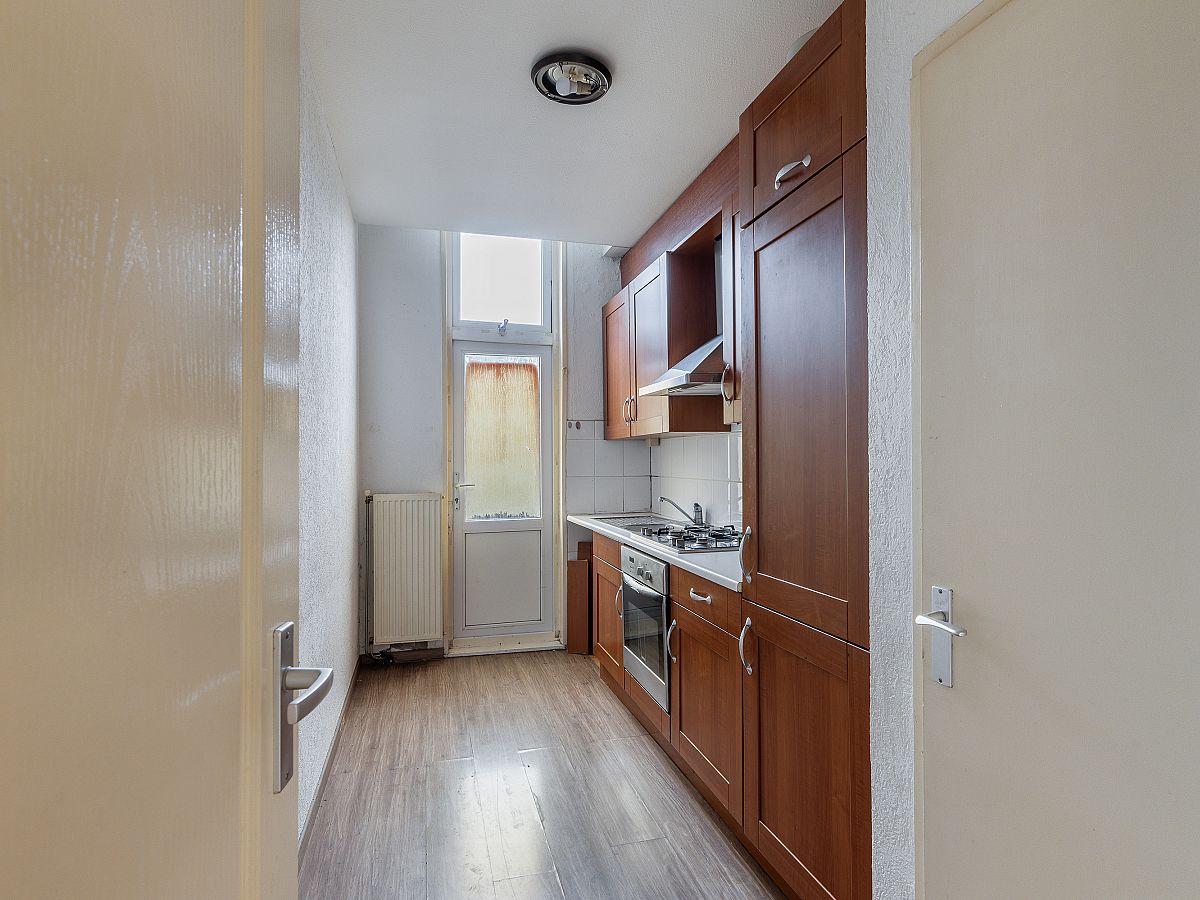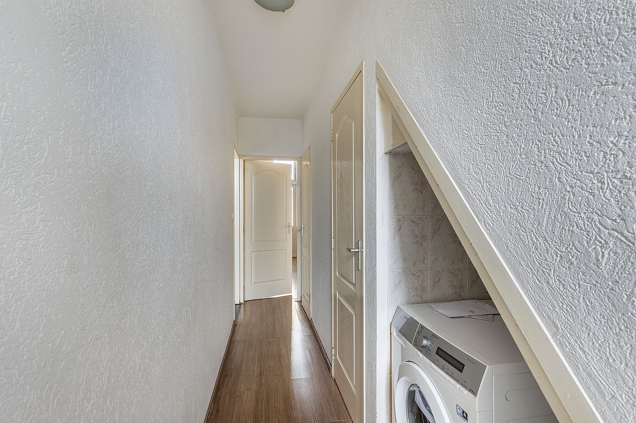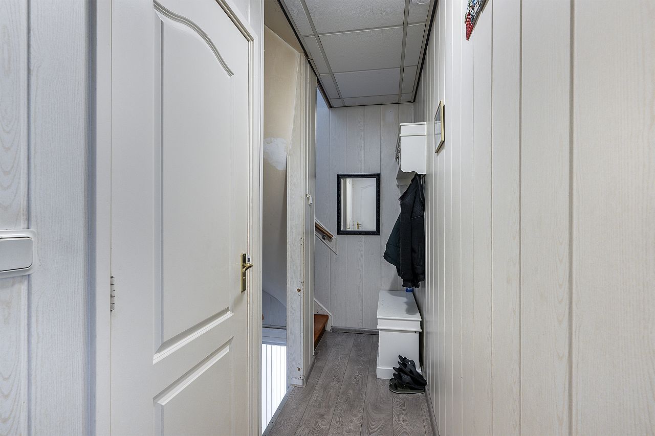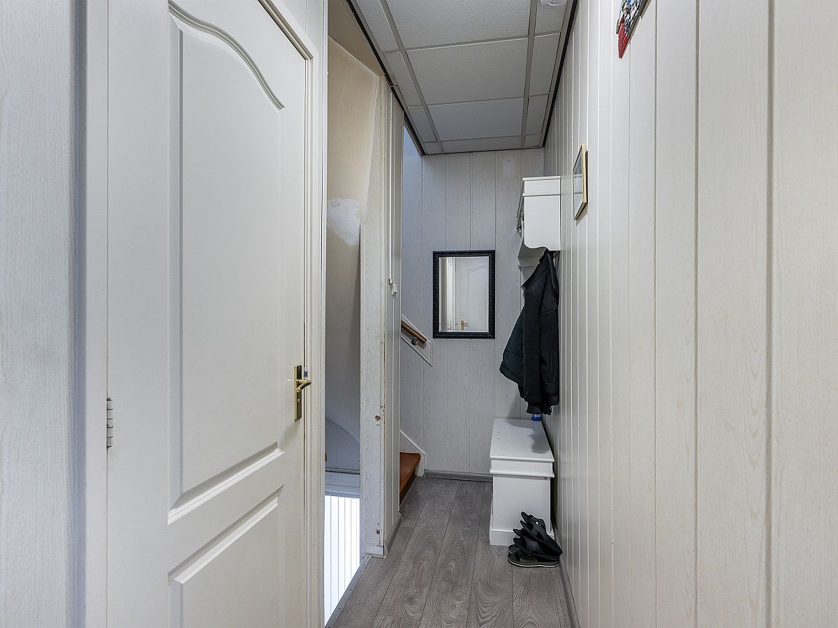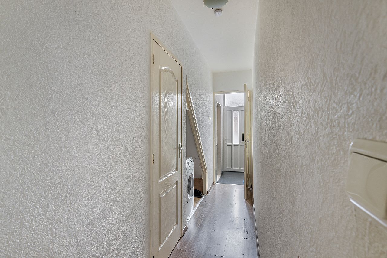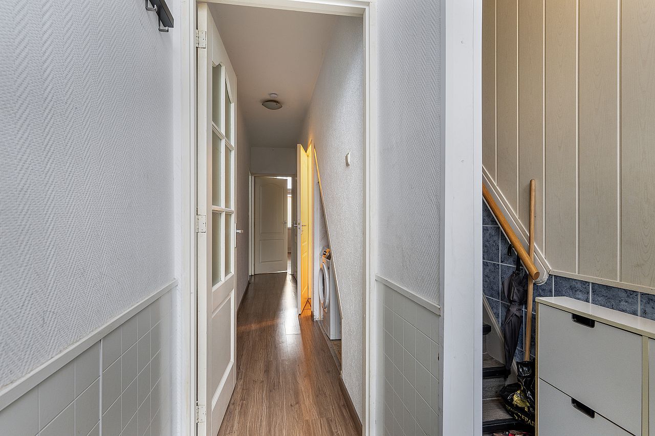 Entree/ gang met toegang tot zowel boven als beneden; 1 meterkast (vernieuwd). Beneden bevindt zich een gang met mogelijkheid tot aansluiting van de wasmachine; geheel betegelde toiletruimte met fonteintje; gedateerde badkamer met douche en wastafelmeubel; eenvoudig keukenblok met houtlook front en wit aanrechtblad en voorzien van 4 pits gasfornuis, koel-vriescombinatie, aansluiting vaatwasser en afzuigkap; c.v. combiketel 2021; toegang tot de tuin. Woonkamer voorzien van zwarte laminaatvloer en systeemplafond; 1 achterslaapkamer.