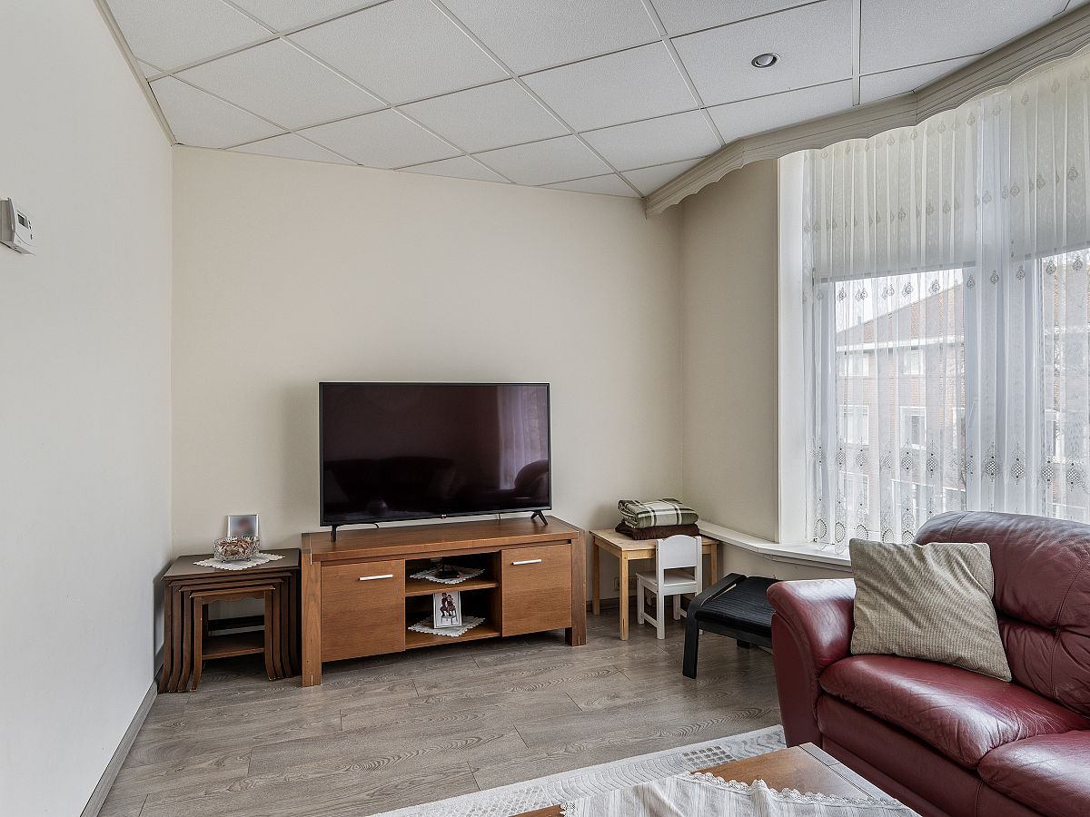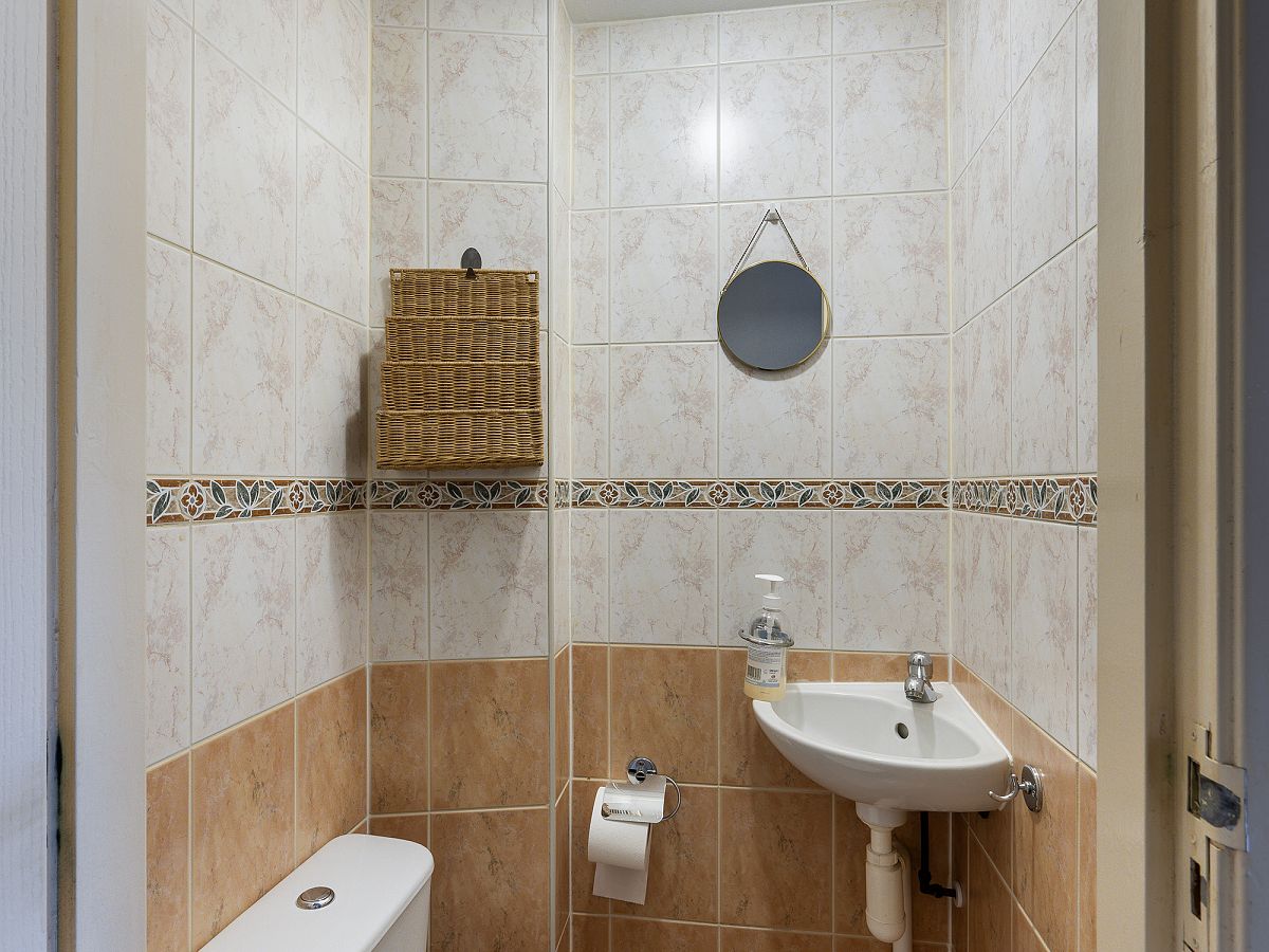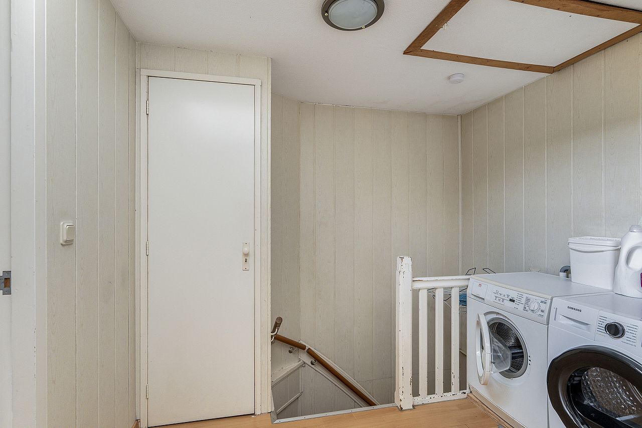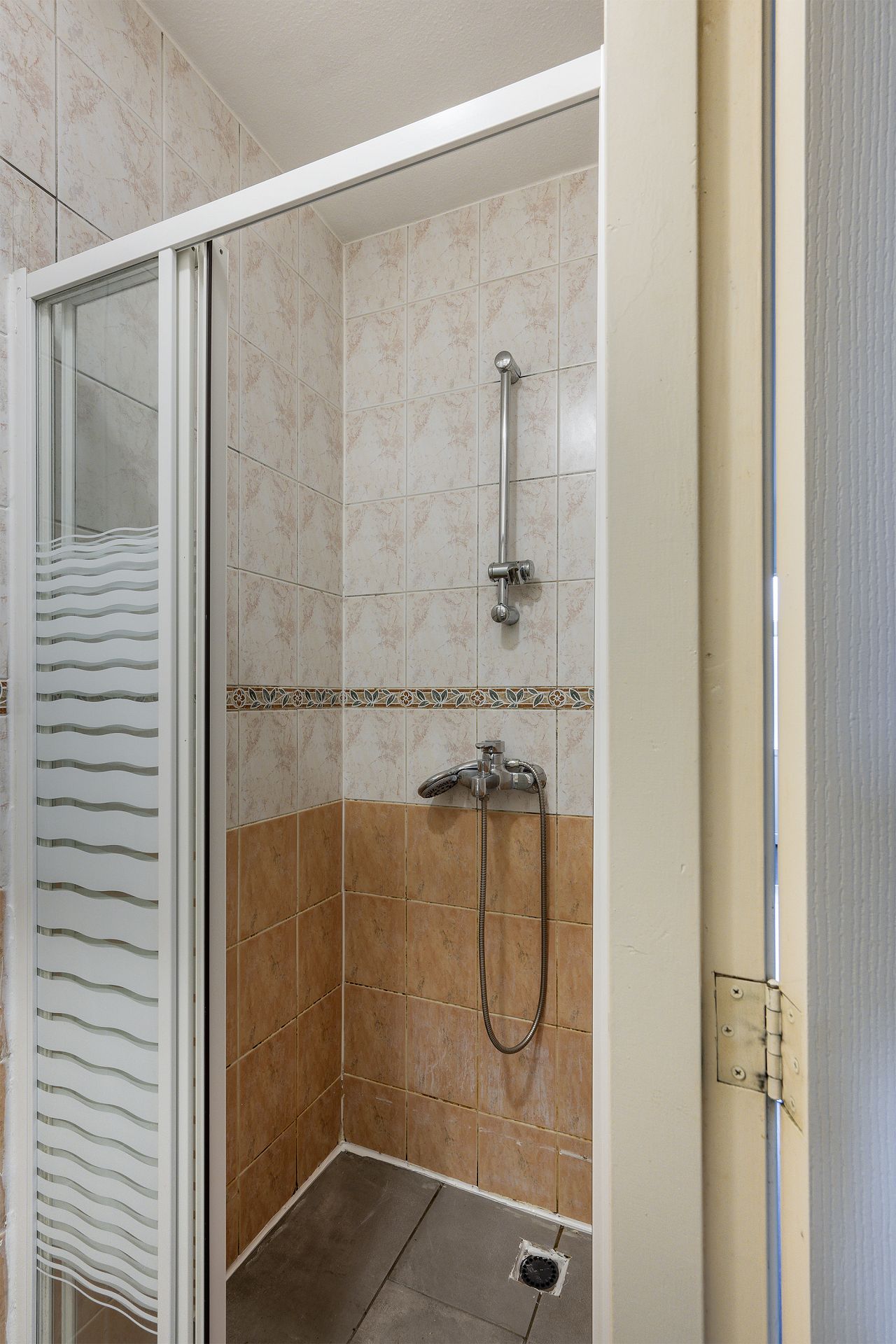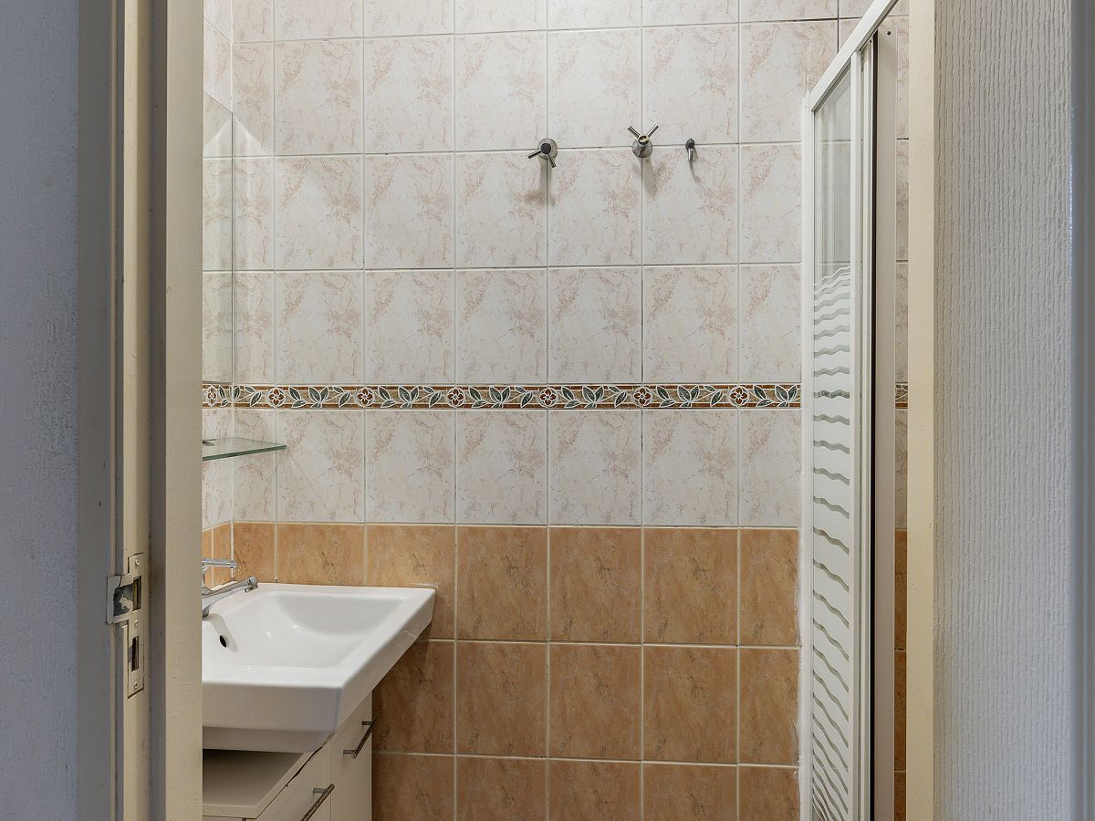 Entree/ gang met toegang tot zowel boven als beneden; 1 meterkast (vernieuwd). Beneden bevindt zich een gang met mogelijkheid tot aansluiting van de wasmachine; geheel betegelde toiletruimte met fonteintje; gedateerde badkamer met douche en wastafelmeubel; eenvoudig keukenblok met houtlook front en wit aanrechtblad en voorzien van 4 pits gasfornuis, koel-vriescombinatie, aansluiting vaatwasser en afzuigkap; c.v. combiketel 2021; toegang tot de tuin. Woonkamer voorzien van zwarte laminaatvloer en systeemplafond; 1 achterslaapkamer.