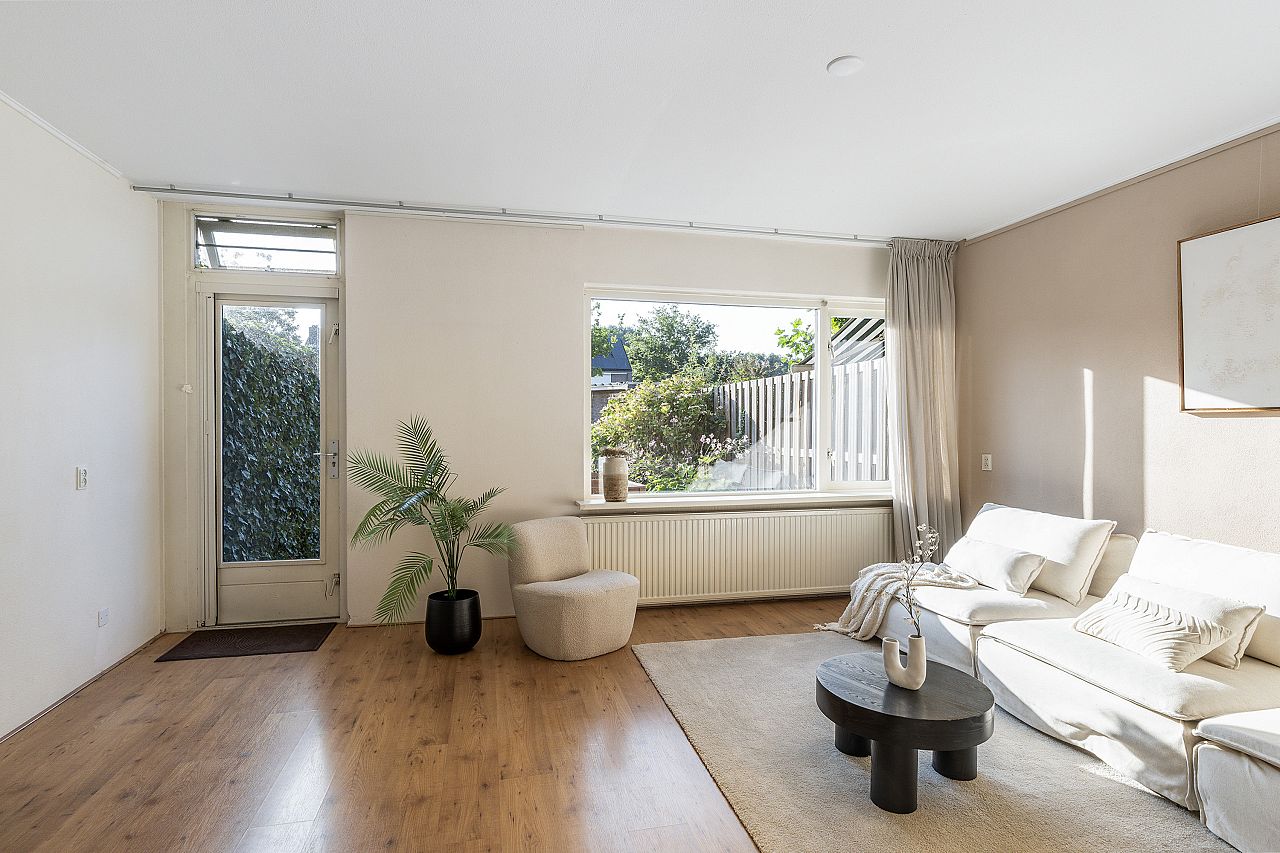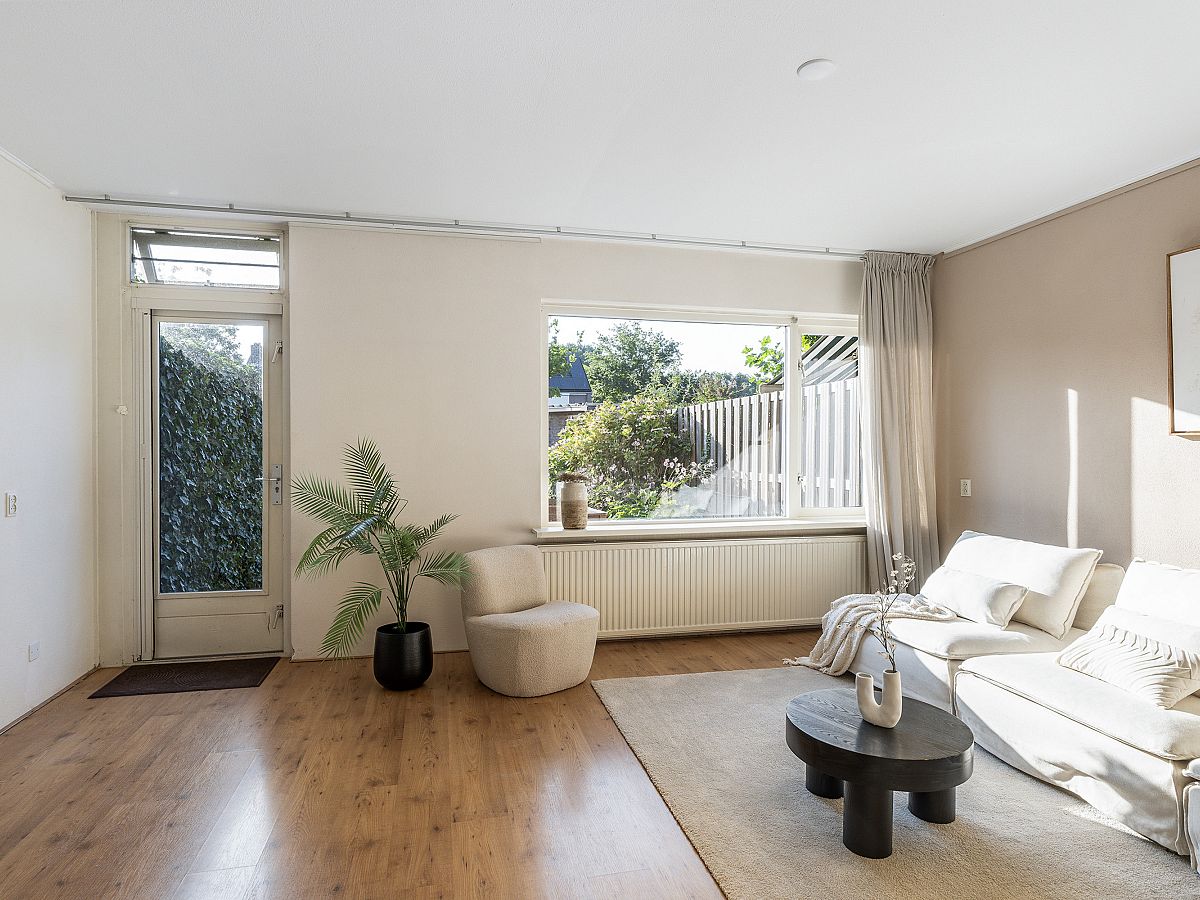 De ruime en lichte woonkamer heeft een lichte houtlook laminaatvloer. Vanuit hier komt u in de diepe zonnige tuin en een grote gemetselde schuur met elektra.
