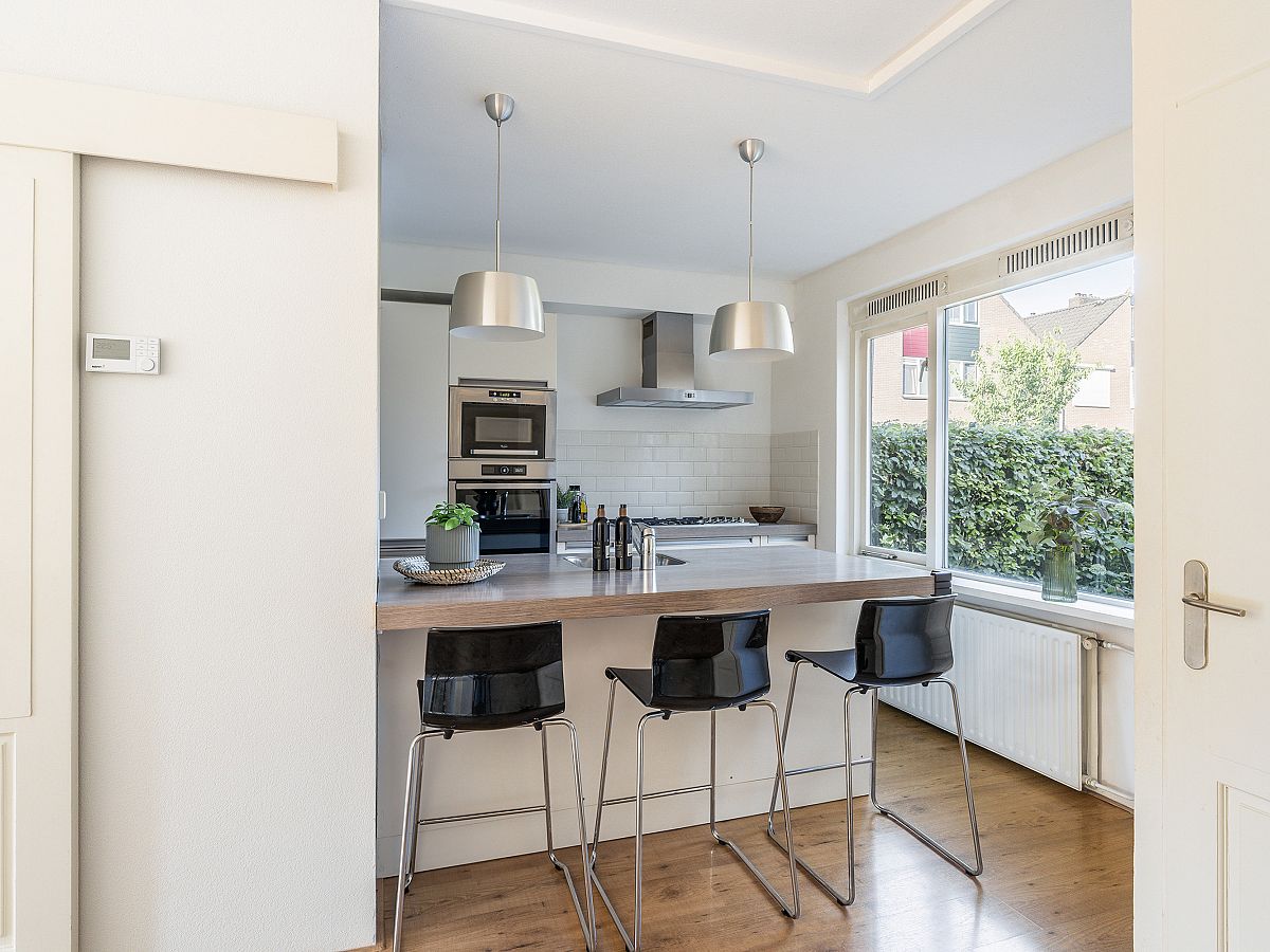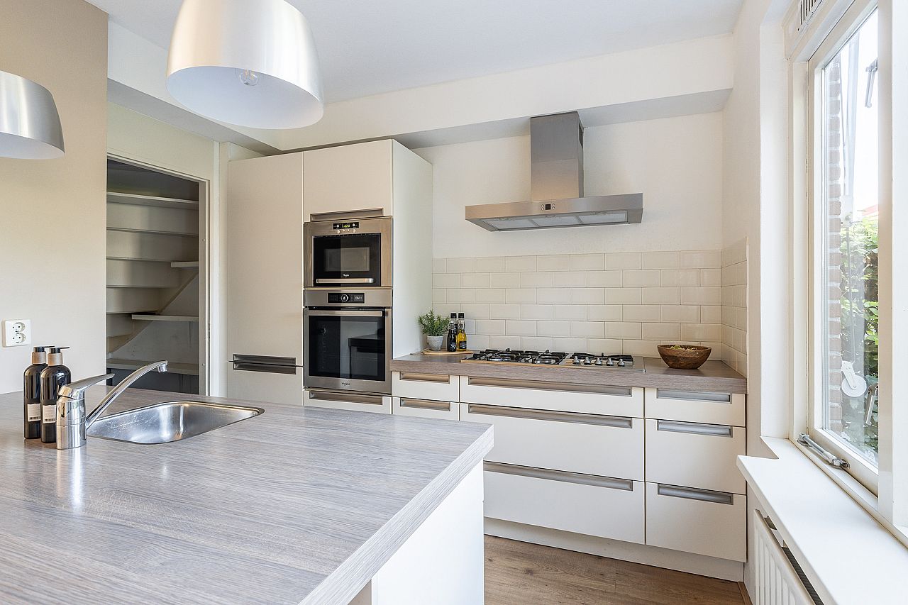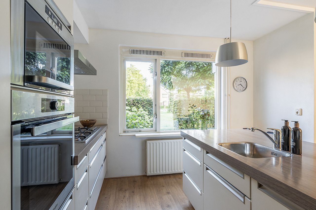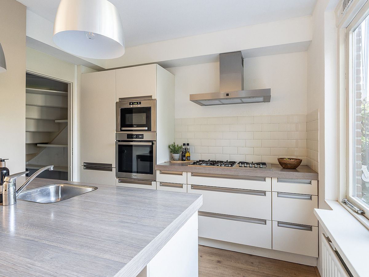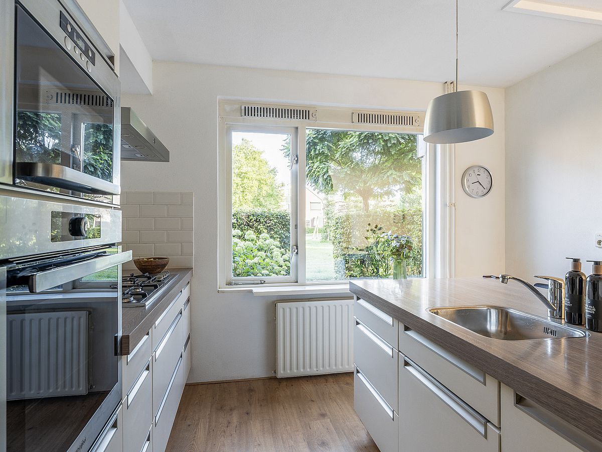 Aan de voorzijde van de woning ligt de moderne, lichte keuken met spoeleiland. De keuken is voorzien van bar en inclusief vaatwasser, 5-pits gaskookplaat, afzuigkap, oven, magnetron, koel-vriescombinatie en close-in-boiler; diepe trapkast voor de voorraad.
