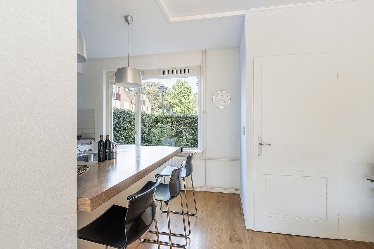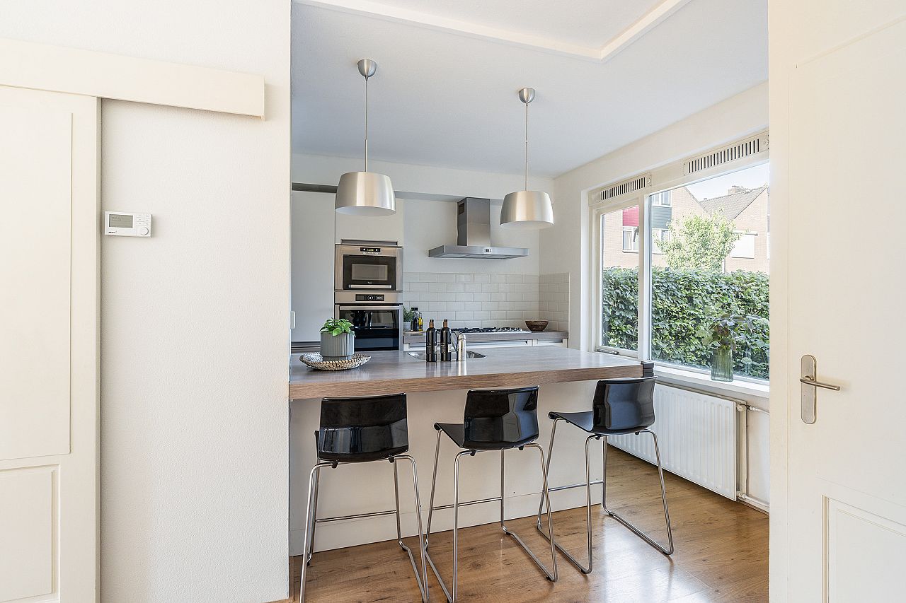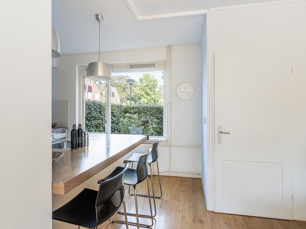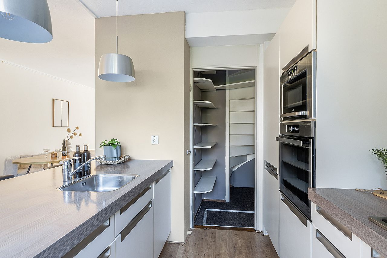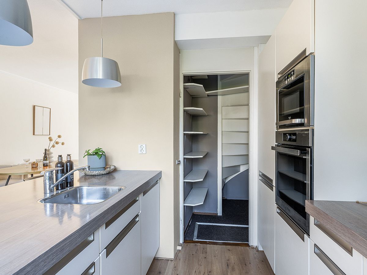 Aan de voorzijde van de woning ligt de moderne, lichte keuken met spoeleiland. De keuken is voorzien van bar en inclusief vaatwasser, 5-pits gaskookplaat, afzuigkap, oven, magnetron, koel-vriescombinatie en close-in-boiler; diepe trapkast voor de voorraad.