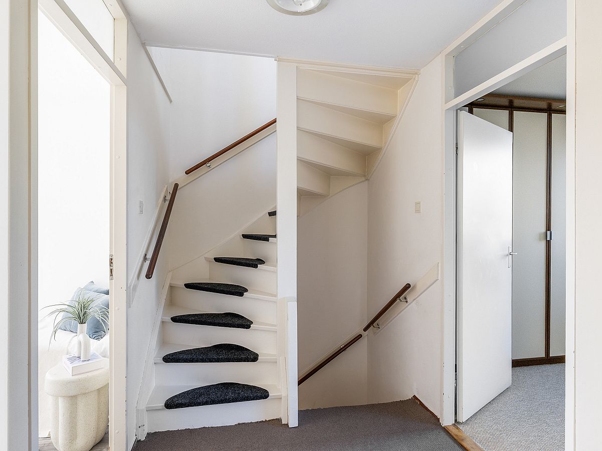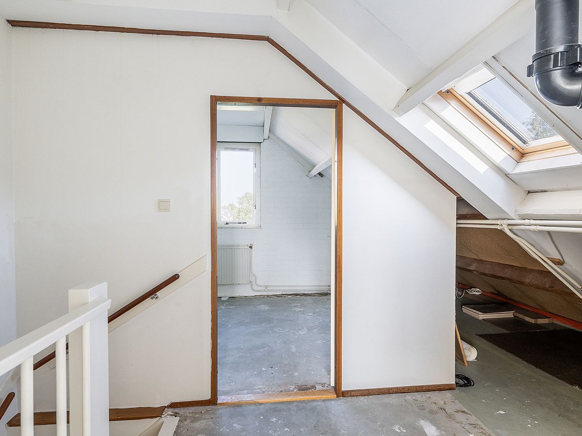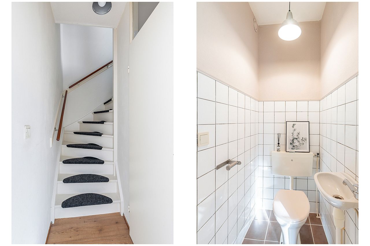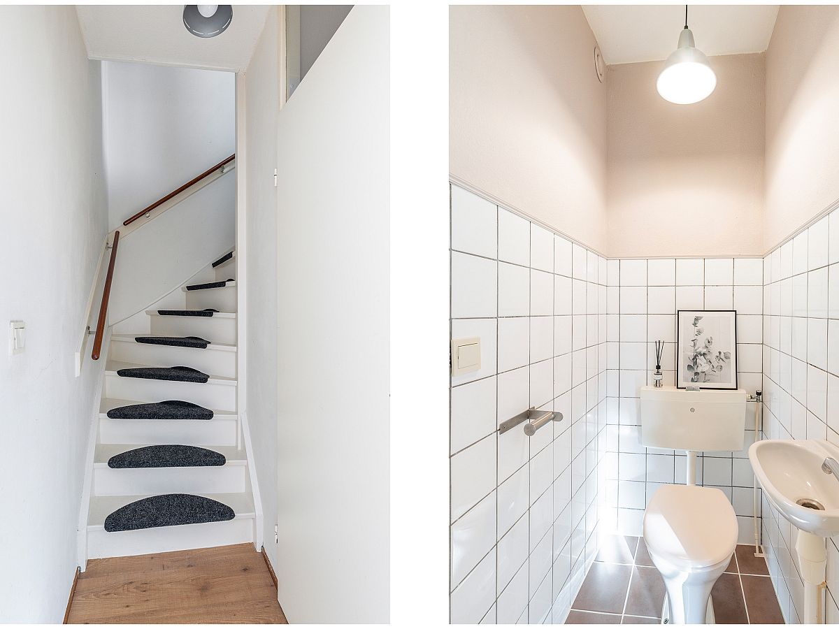 In de tussenhal bevindt zich de trapopgang en de toiletruimte met toilet en fonteintje.