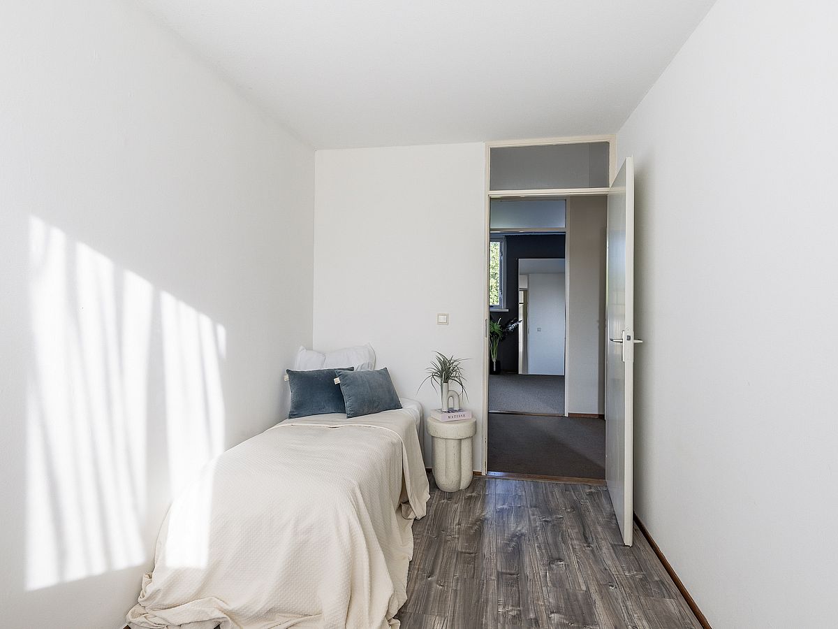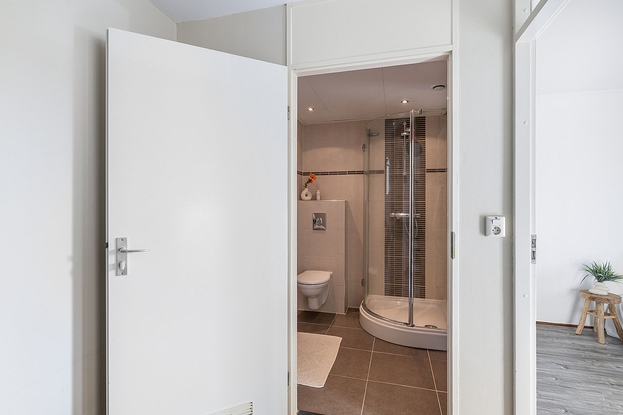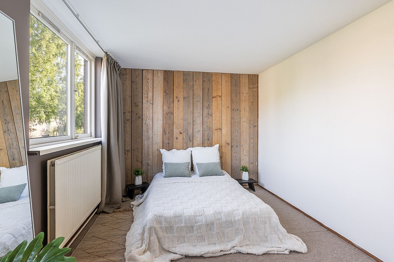Ruime overloop; royale voorslaapkamer voorzien speelse houten achterwand, vaste kastenwand en verhuisraam ; lichte badkamer met douchehoek, wandclosetcombinatie, wastafel en mechanische ventilatie; 2 slaapkamers aan de achterzijde voorzien van laminaatvloer, hardhouten kozijnen en dubbel glas.