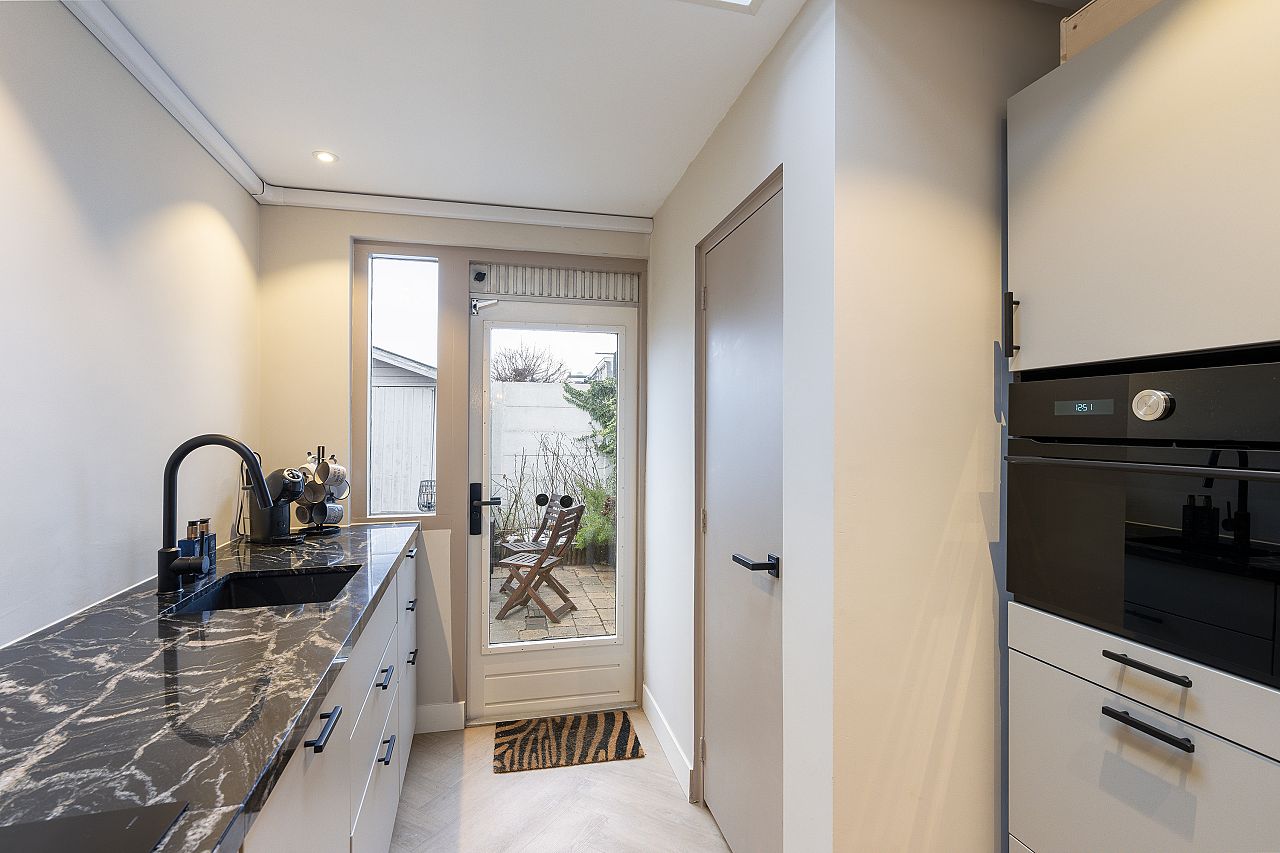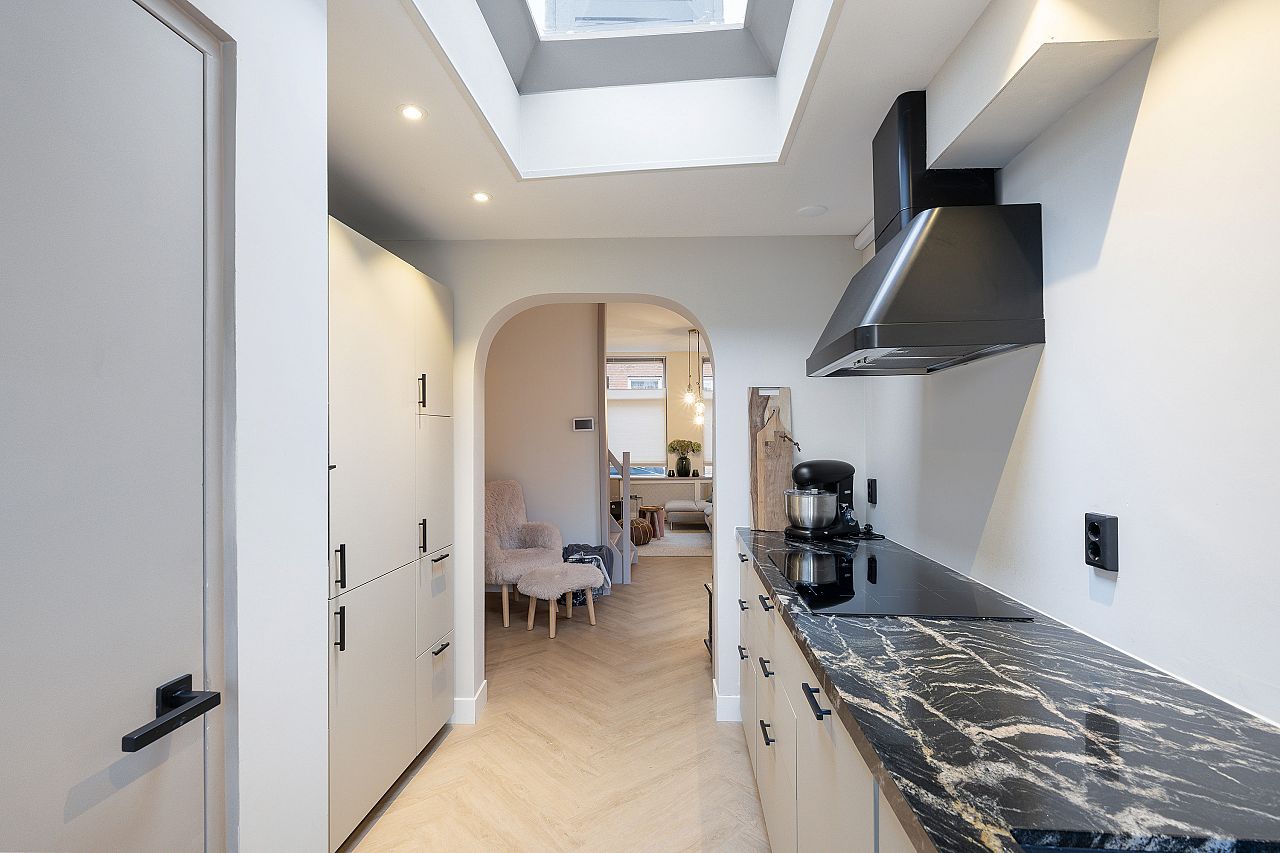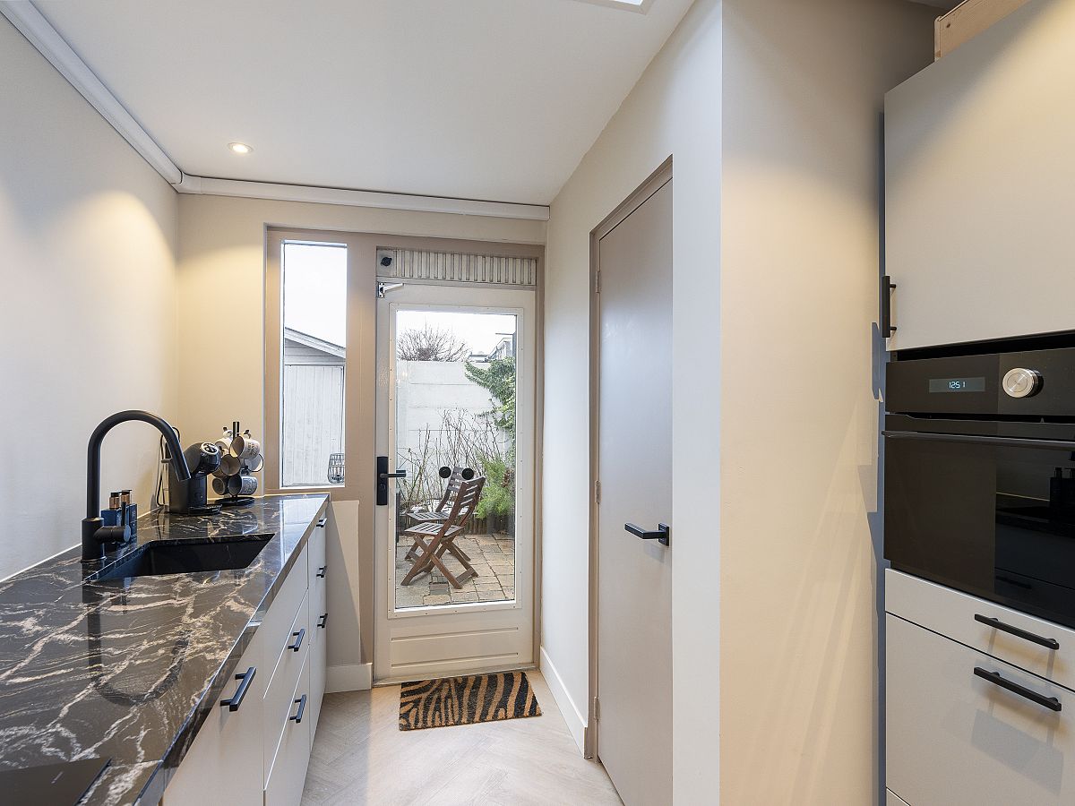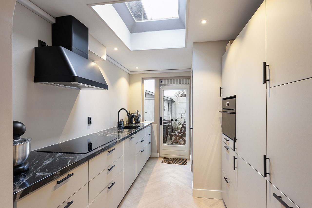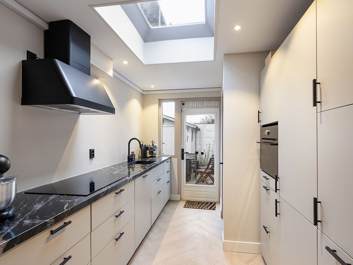De keuken is aan de achterzijde gelegen en heeft veel lichtinval door de dakkoepel. Uiteraard is deze moderne keuken voorzien van diverse inbouwapparatuur zoals een inductiekookplaat, afzuigkap, combi-magnetron, vaatwasser, koelkast en vriezer. Via de keuken kom je in de achtertuin.