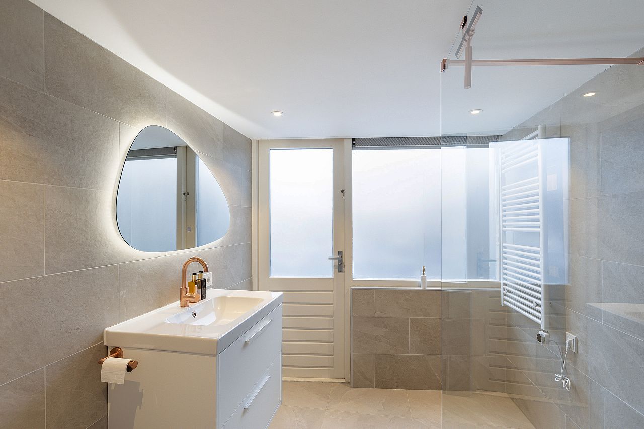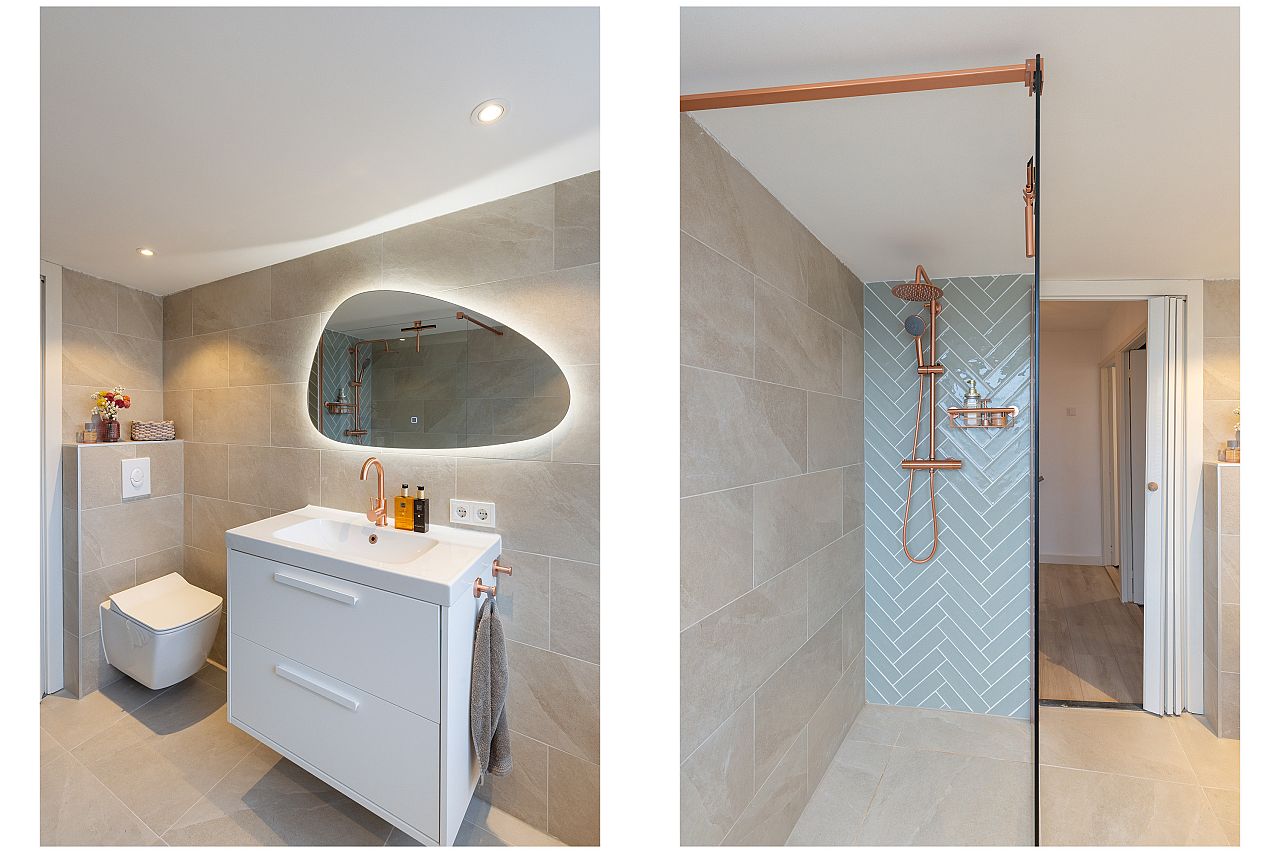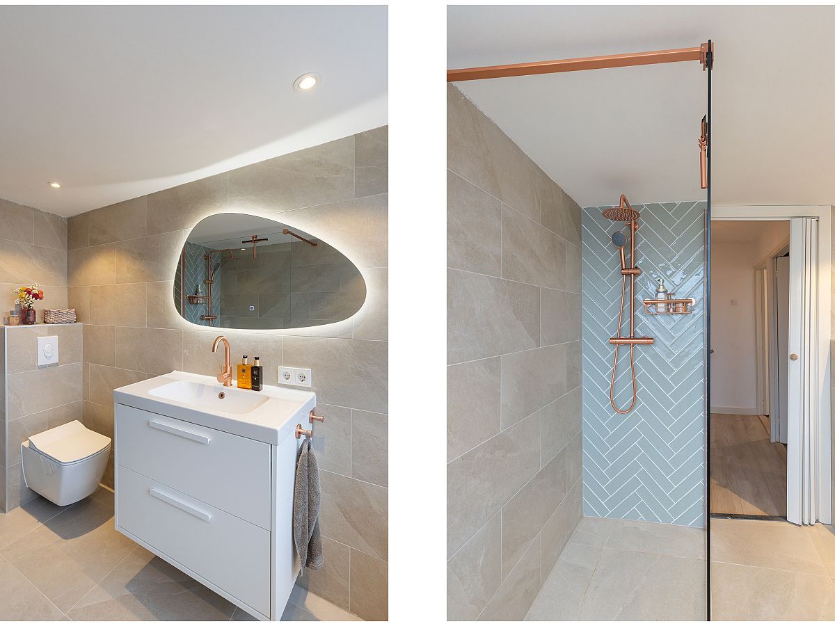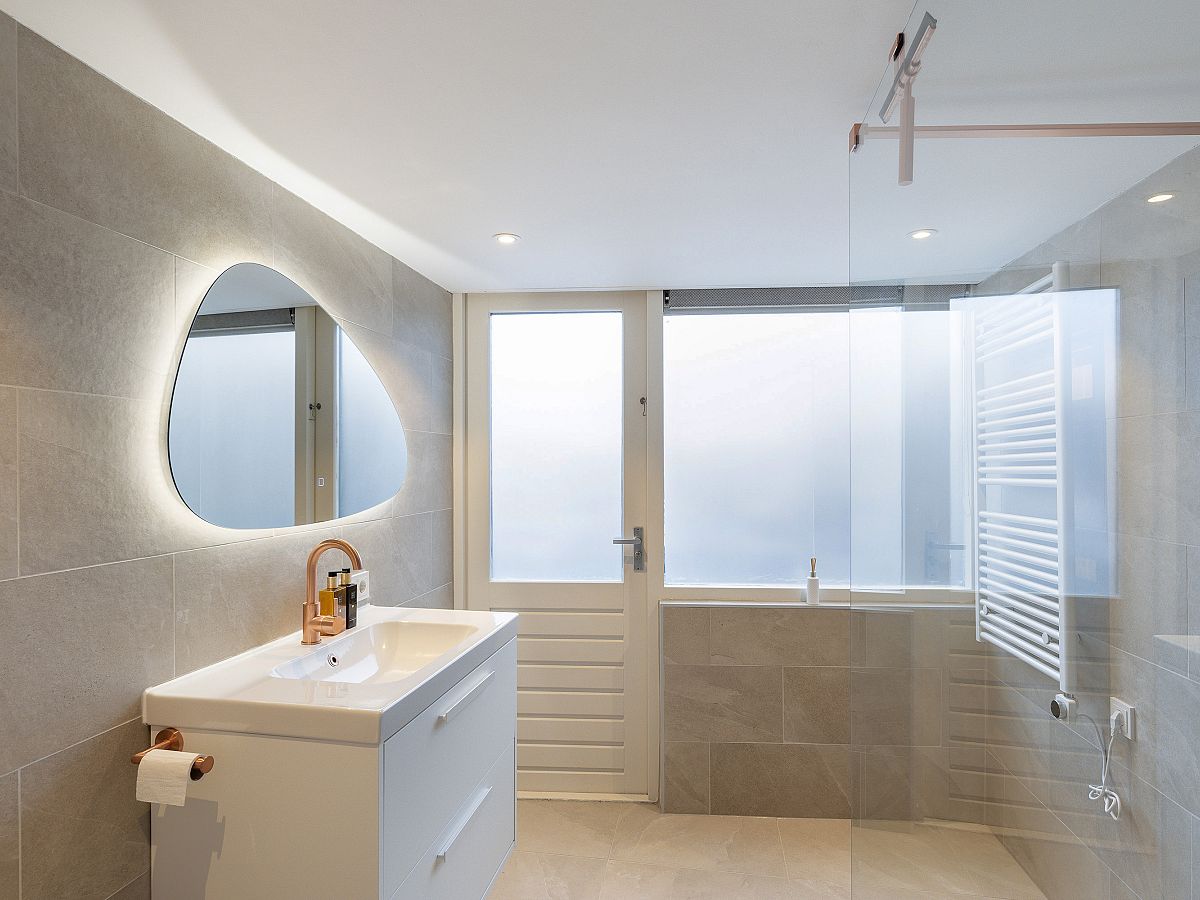 De badkamer is ruim, betegeld met mooie zandkleurige tegels en voorzien van een ruime inloopdouche, wastafelmeubel en 2e toilet. Er is een deur naar het dakterras.