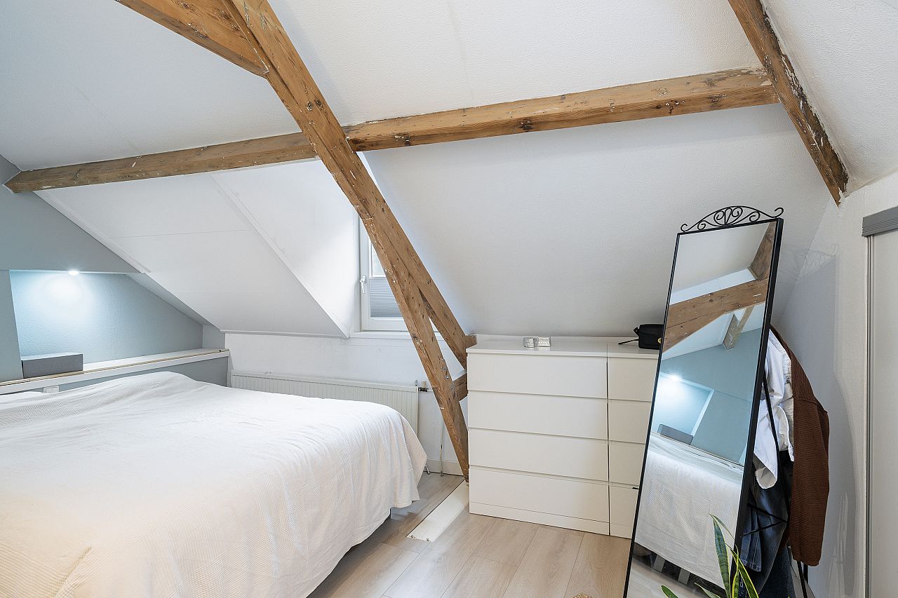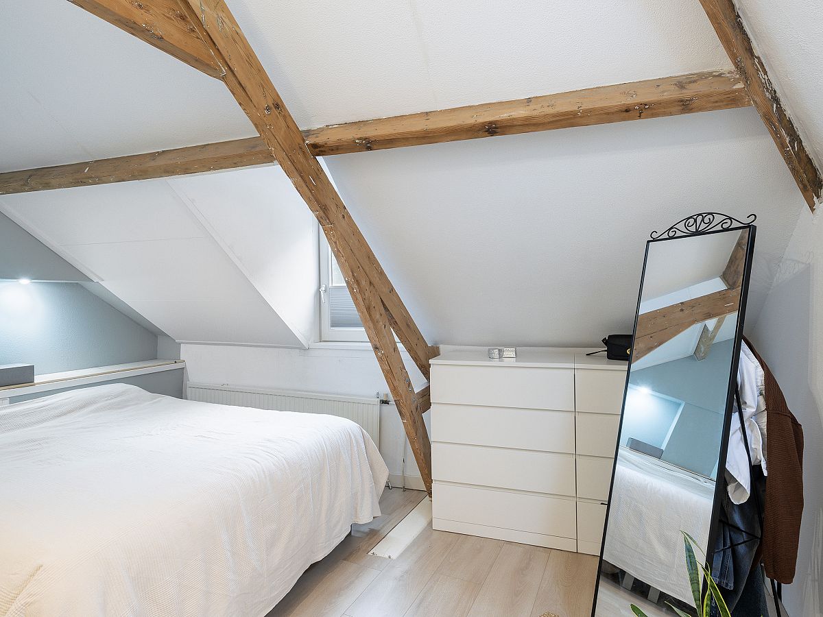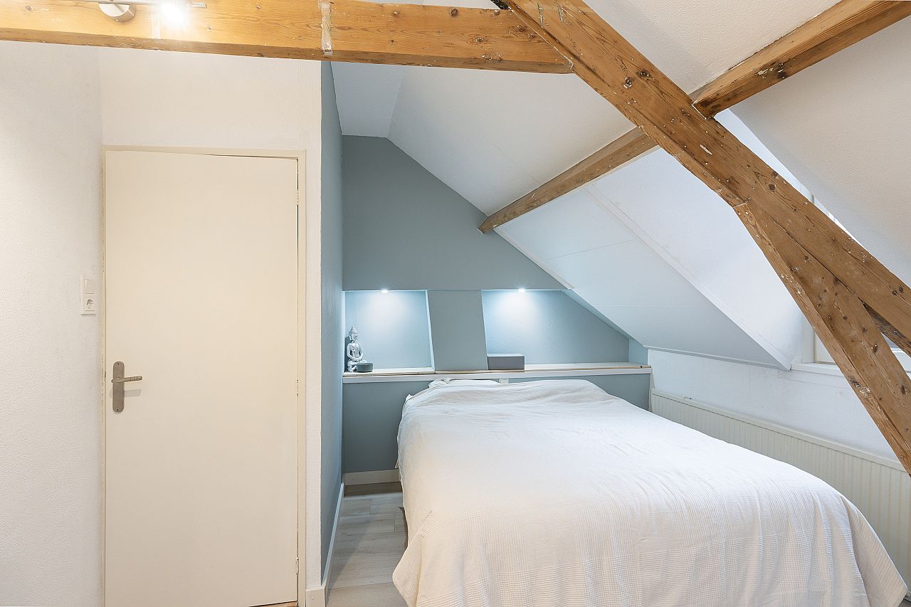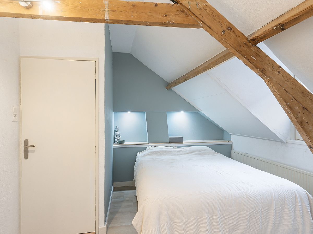Slaapkamer aan de voorzijde waarbij de schitterende balken aan de schuine kap direct de aandacht trekken. Achter het bed zijn nisjes gemaakt, er is een dakkapel, dakraam en bergruimte.