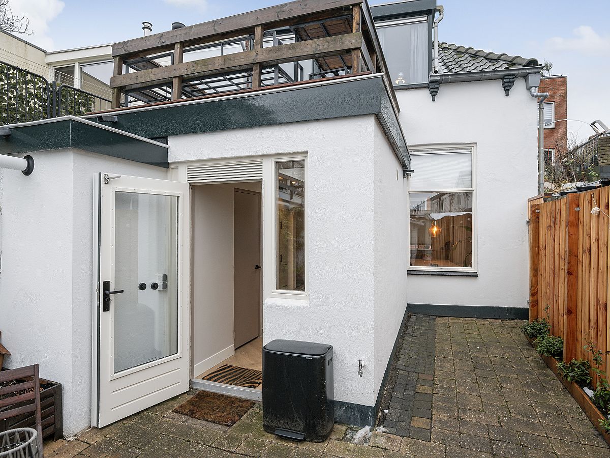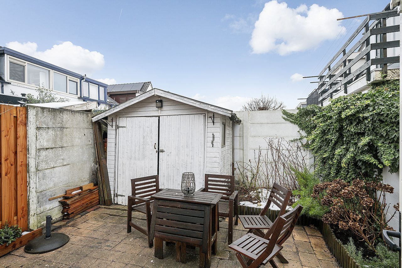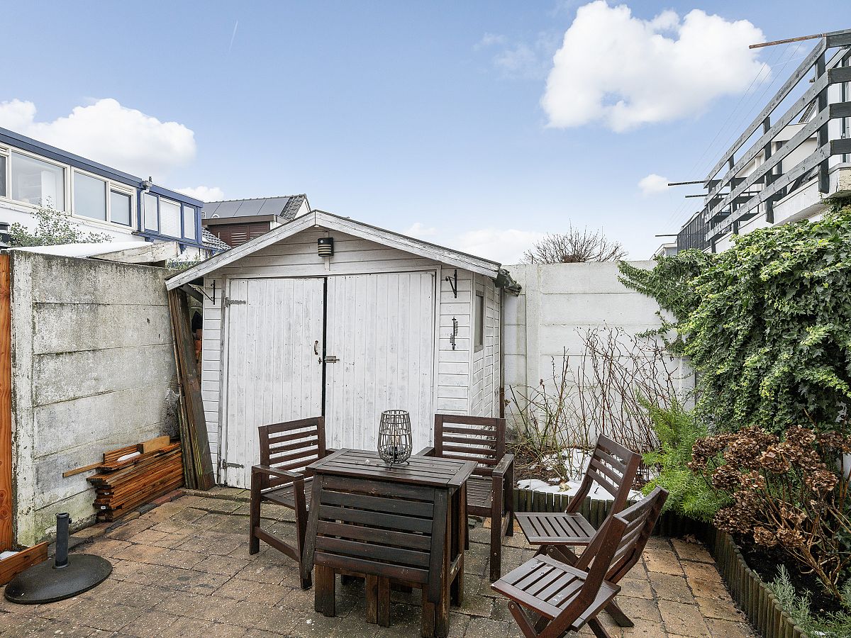 Achtertuin met houten berging en achterom. In de ochtend kun je hier heerlijk in het zonnetje zitten, 's middags staat de zon op het dakterras.