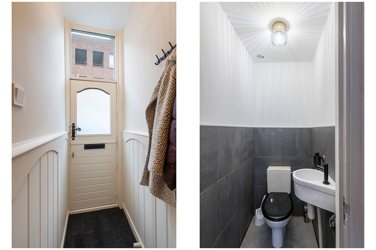 Entree/gang met lambrisering en visgraat PVC vloer. Half betegelde toiletruimte met staand closet en handwasbakje.