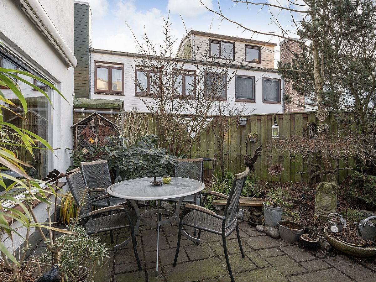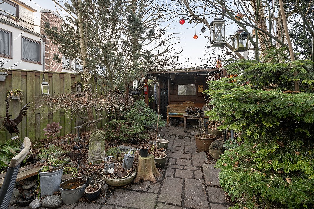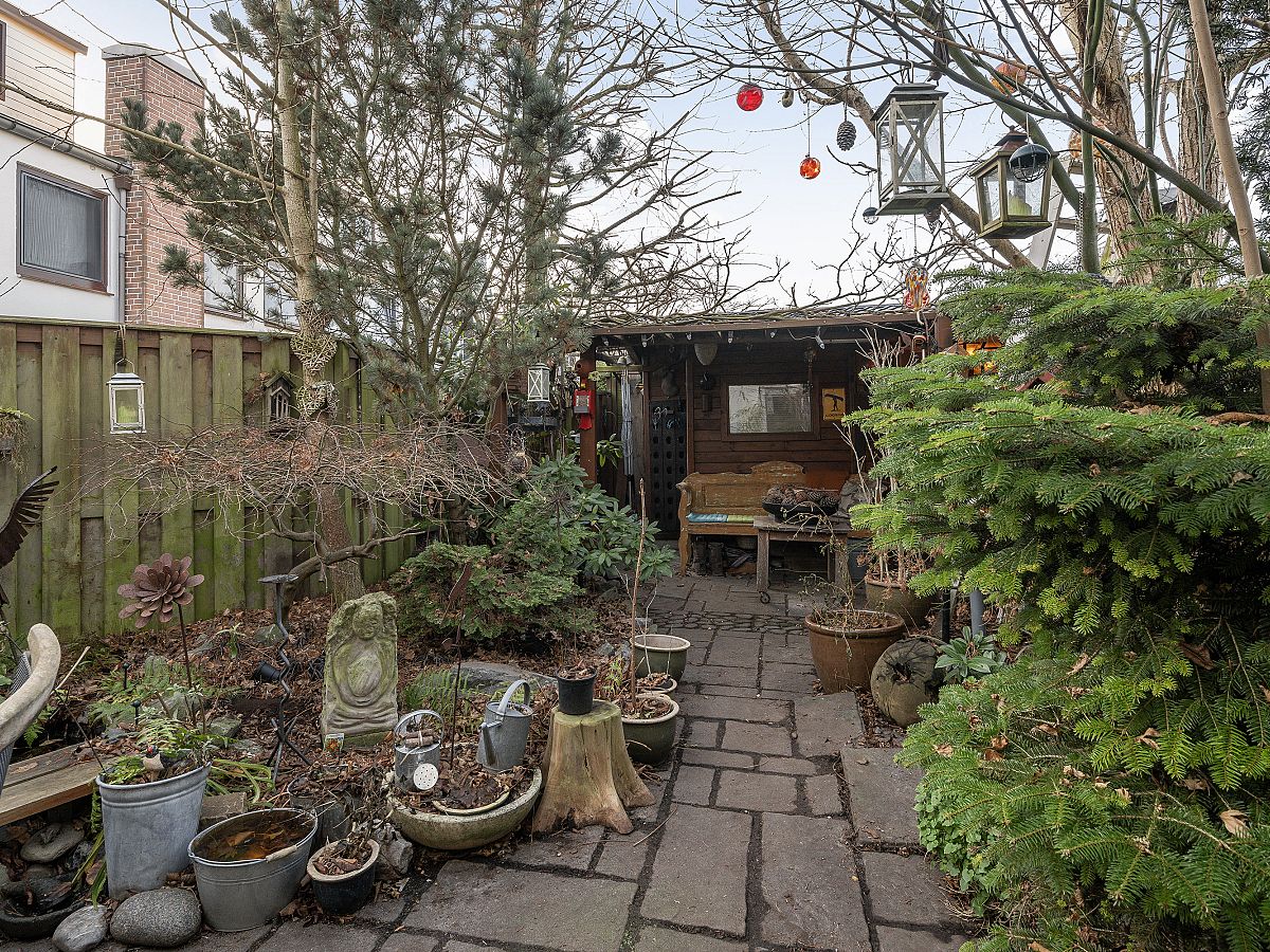 de groene en sfeervolle achtertuin is op het zuiden gelegen, voorzien van elektrische zonwering, achterin de tuin een schuur met overkapping; zijuitgang naar de steeg.