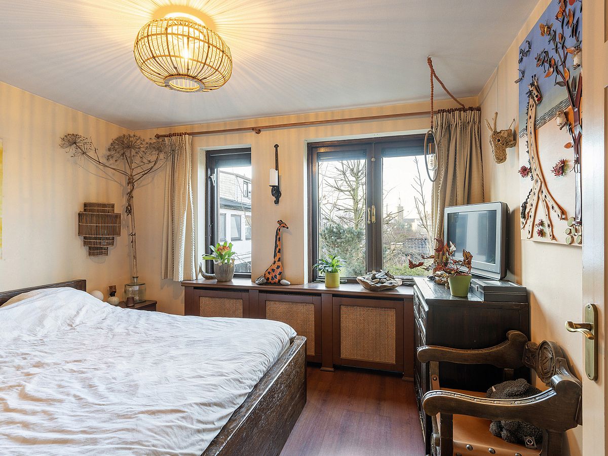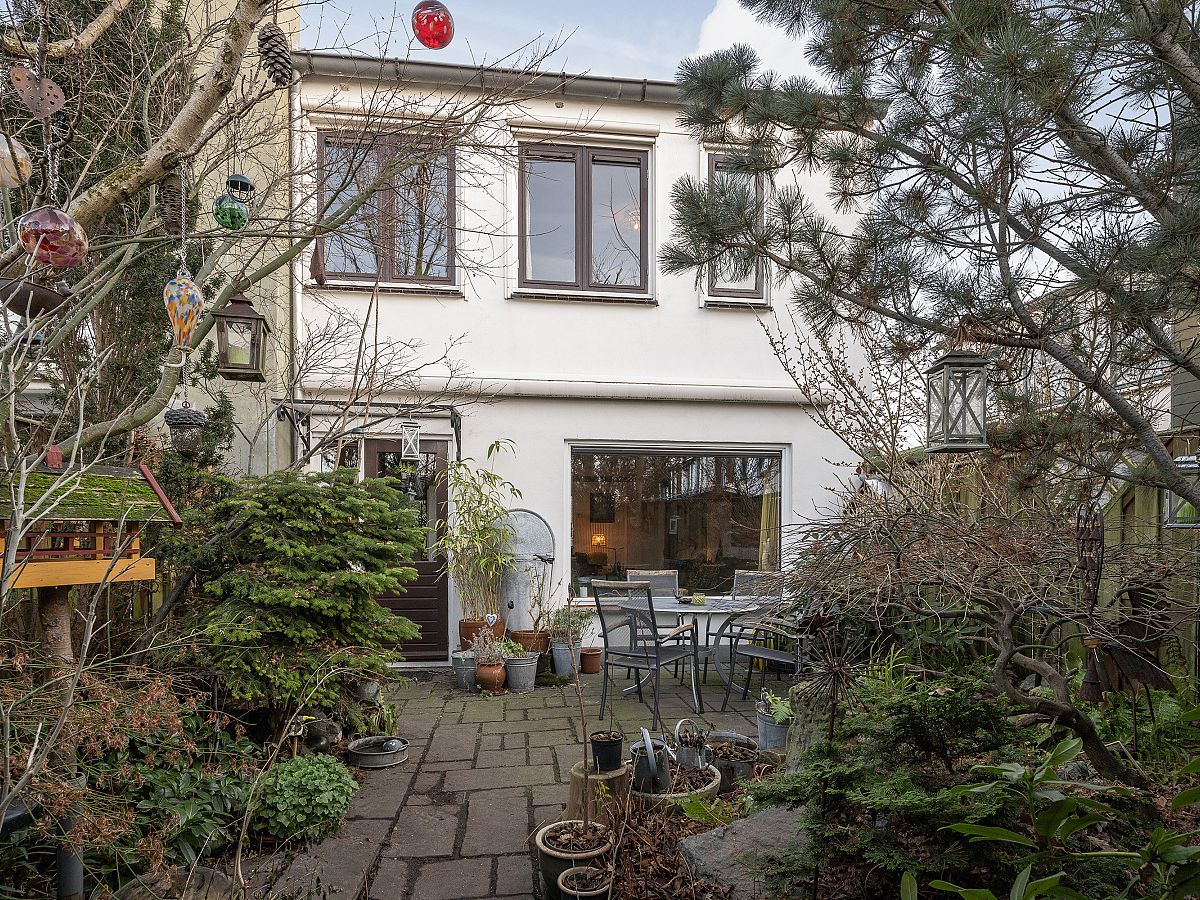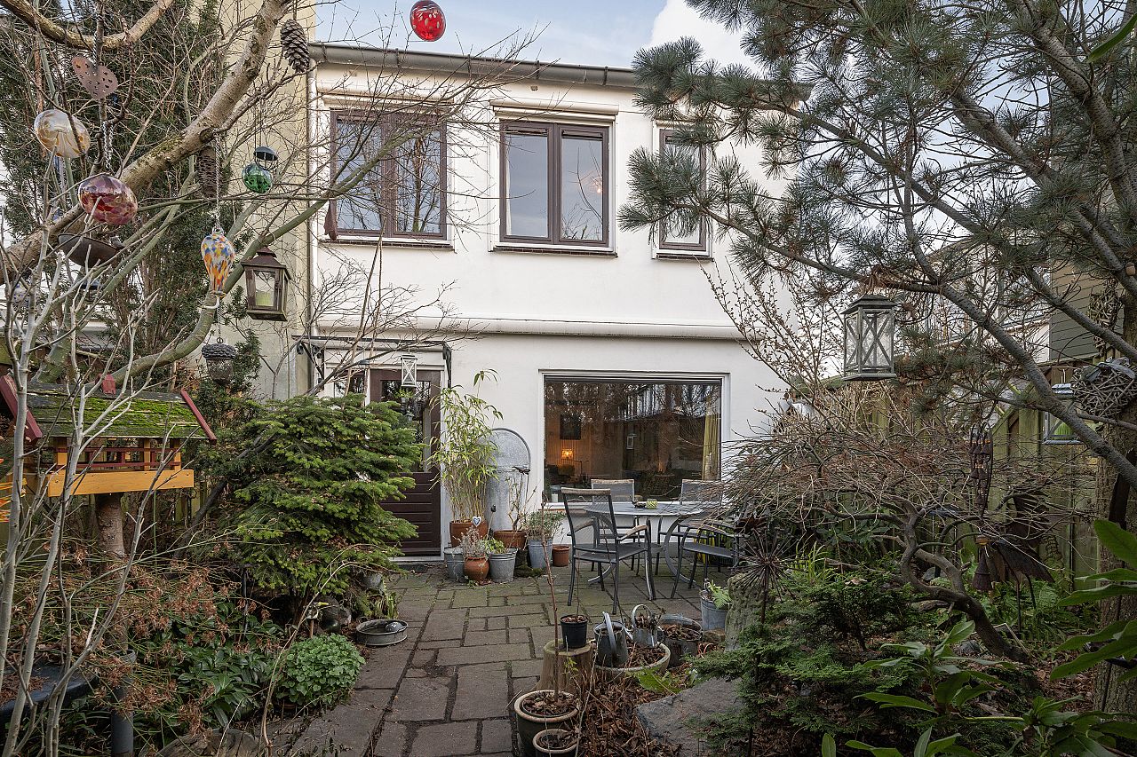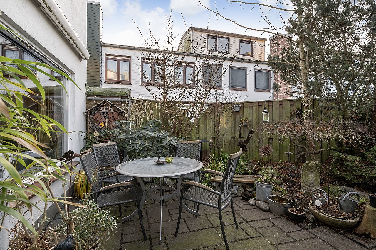de groene en sfeervolle achtertuin is op het zuiden gelegen, voorzien van elektrische zonwering, achterin de tuin een schuur met overkapping; zijuitgang naar de steeg.