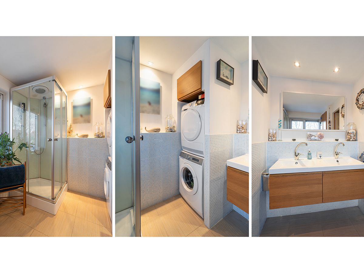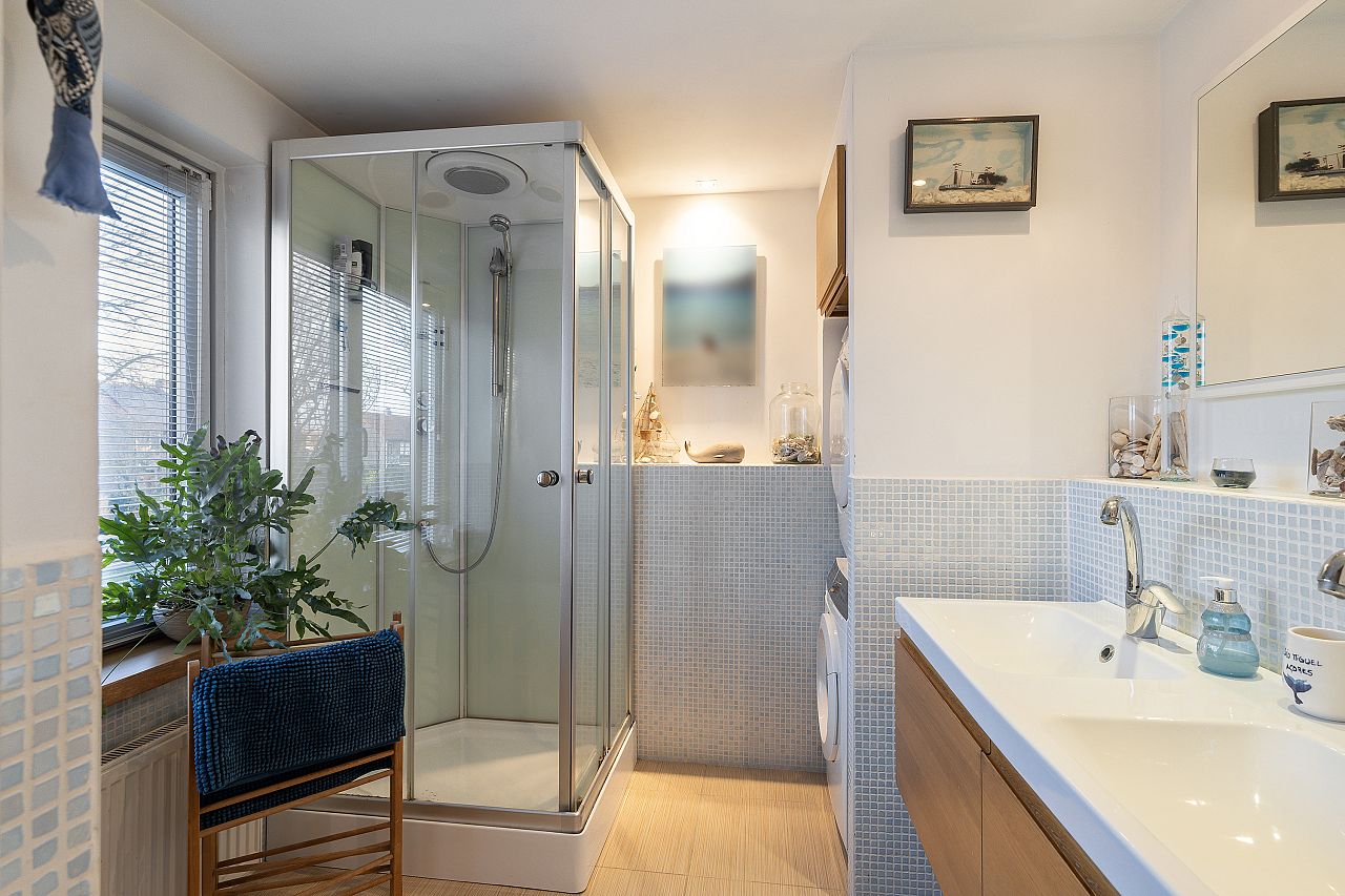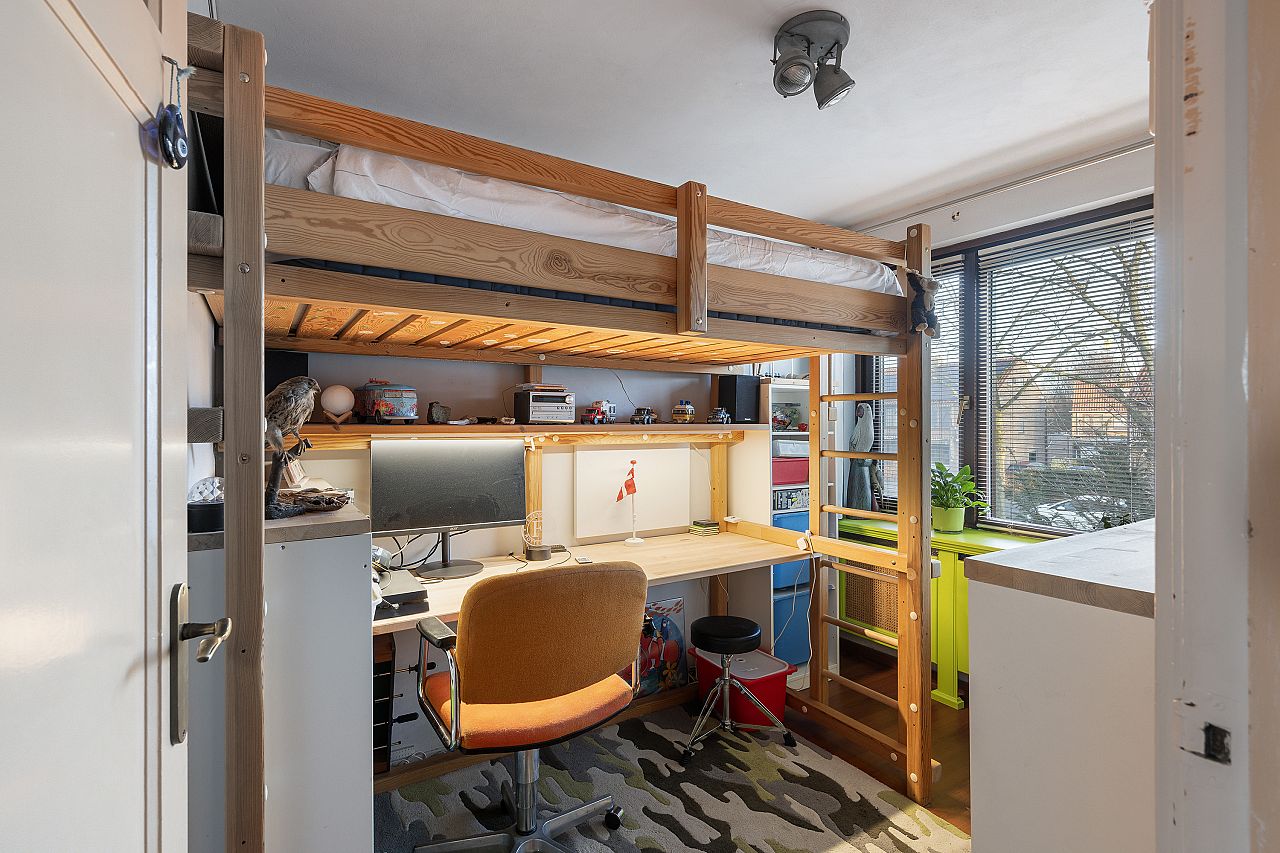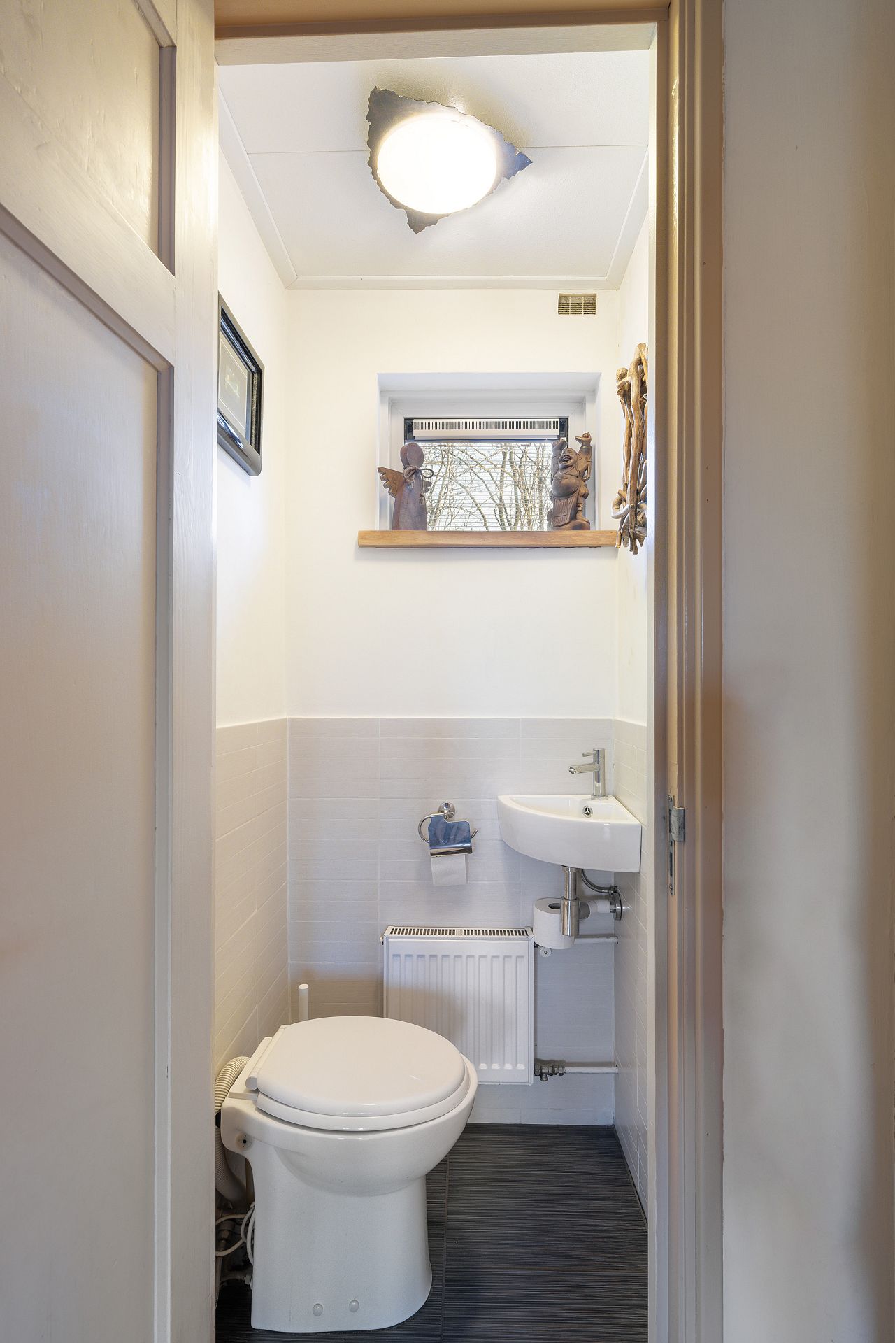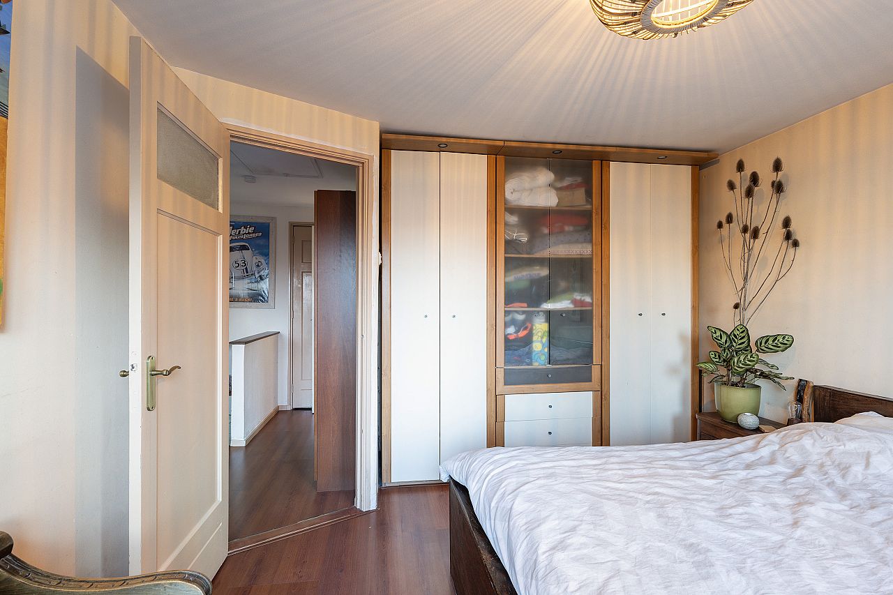 overloop met vaste kast alwaar de cv ketel (verouderd) en toegang tot 3 slaapkamers, allen voorzien van laminaatvloer de voorslaapkamer is voorzien van kunststof kozijnen en dubbele beglazing; de 2 achterslaapkamers hebben houten kozijnen met dubbele beglazing en zijn voorzien van screens; aparte toiletruimte (sanibroyeur); ruime badkamer in lichte kleurstelling en voorzien van hoekdouche, dubbele wastafelmeubel en opstelplaats voor de wasmachine en droger.