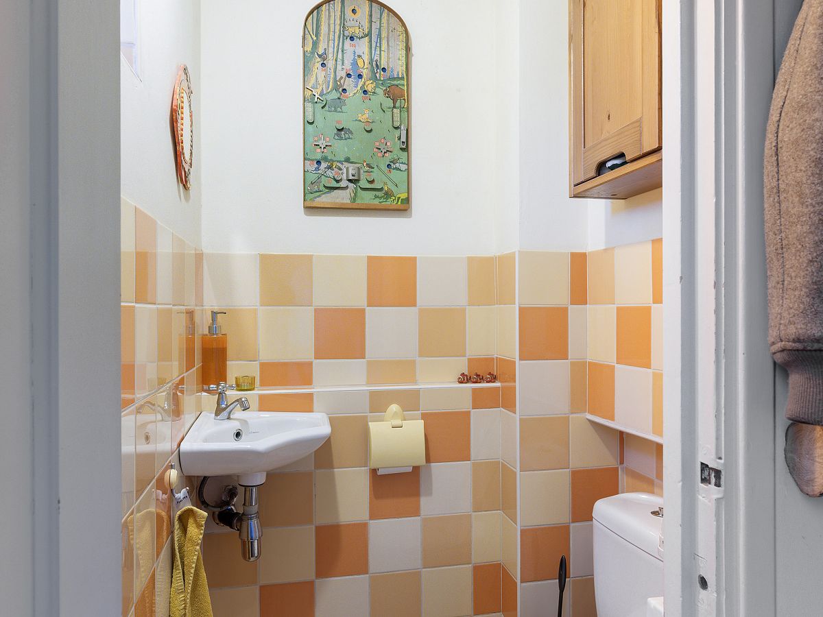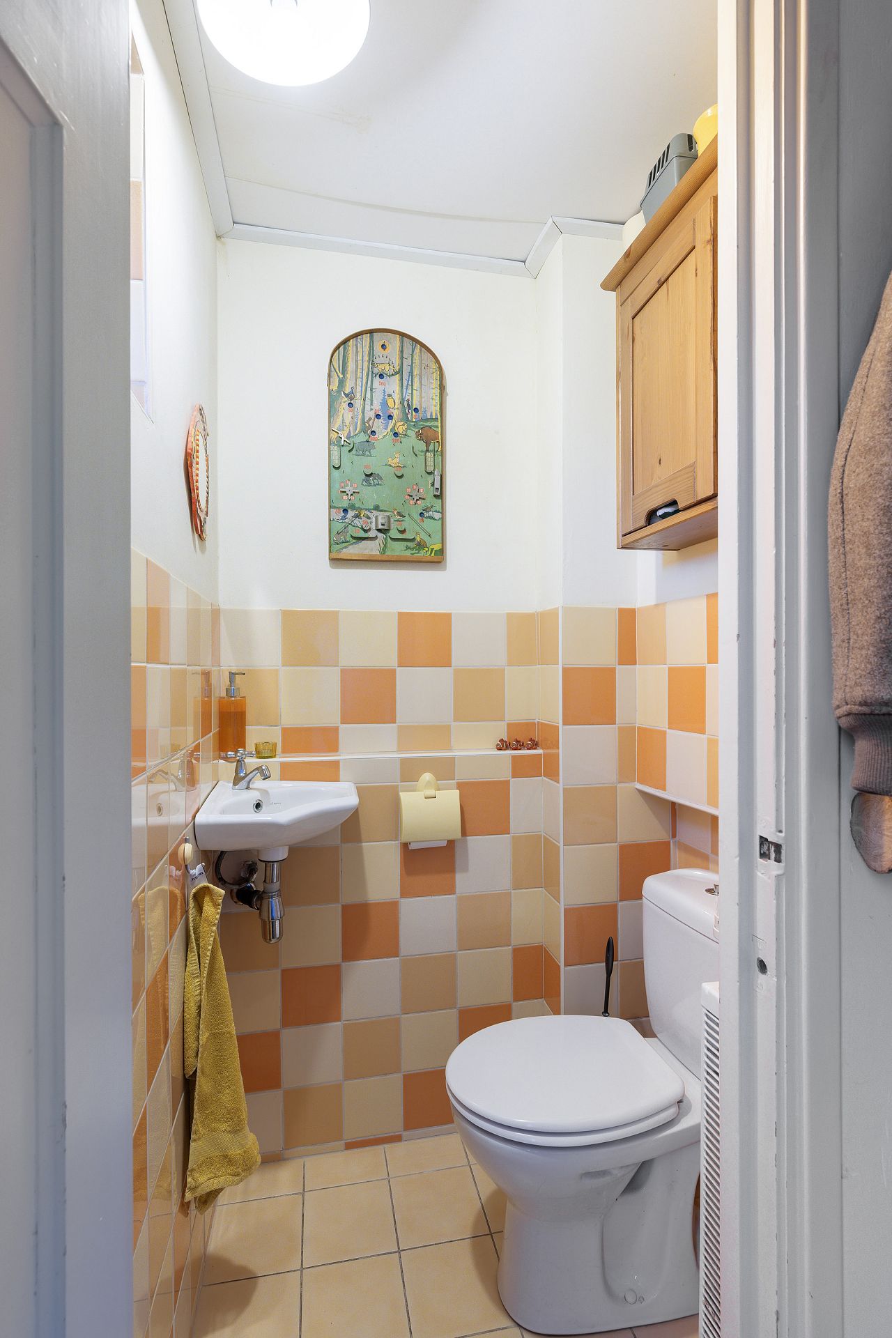 via de voortuin bereik je de entree van de woning; entree; tochtportaal; half betegelde toiletruimte met fonteintje; woonkamer met sfeervolle openhaard en laminaatvloer; meterkast ( 6 groepen en dubbele aardlekschakelaar); de eetkamer grenst aan de half open keuken; de keuken is eenvoudig met licht front en voorzien van 4-pitsgaskookplaat, afzuiging, magnetron, oven, vaatwasser en losse koel/vriescombinatie; toegang naar de achtertuin.