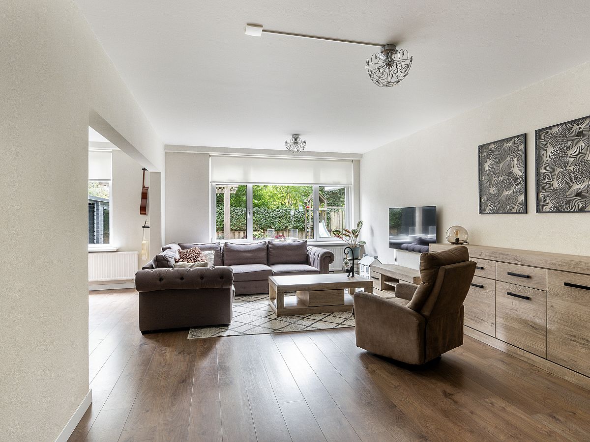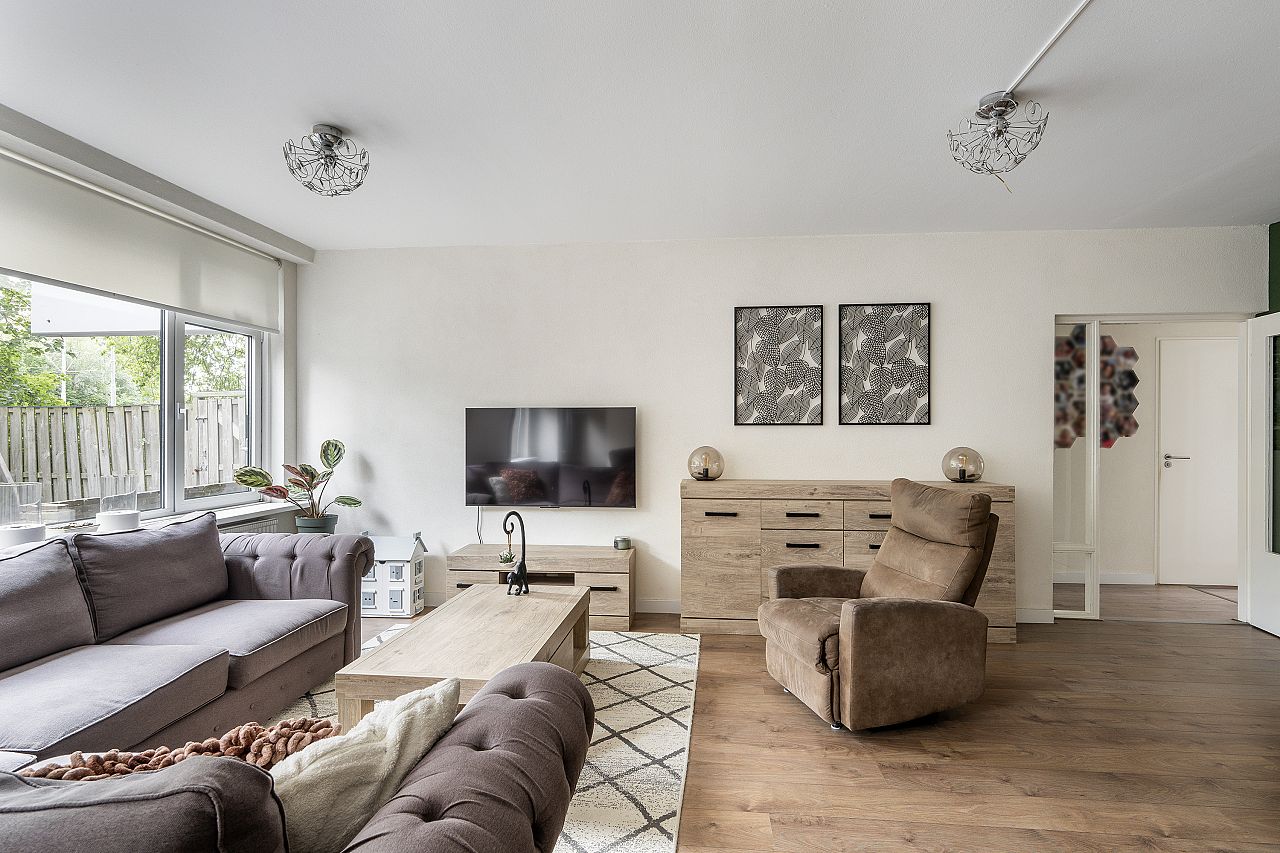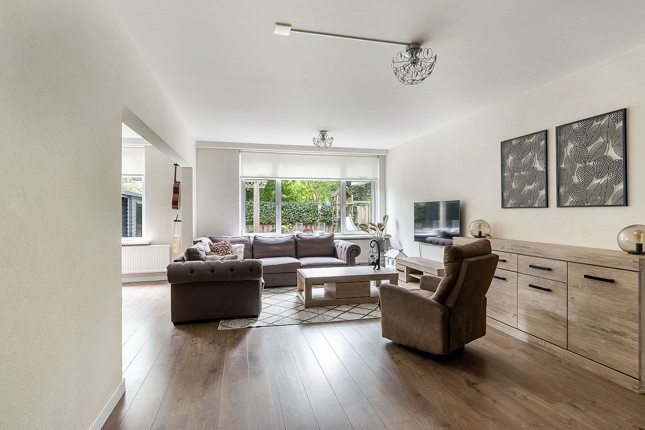 Ruime en lichte woonkamer met zicht op de groene tuin. Toegang tot de slaapkamer, grenzend aan de achtertuin.