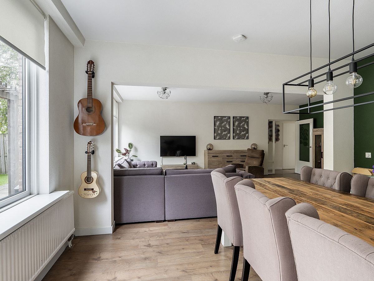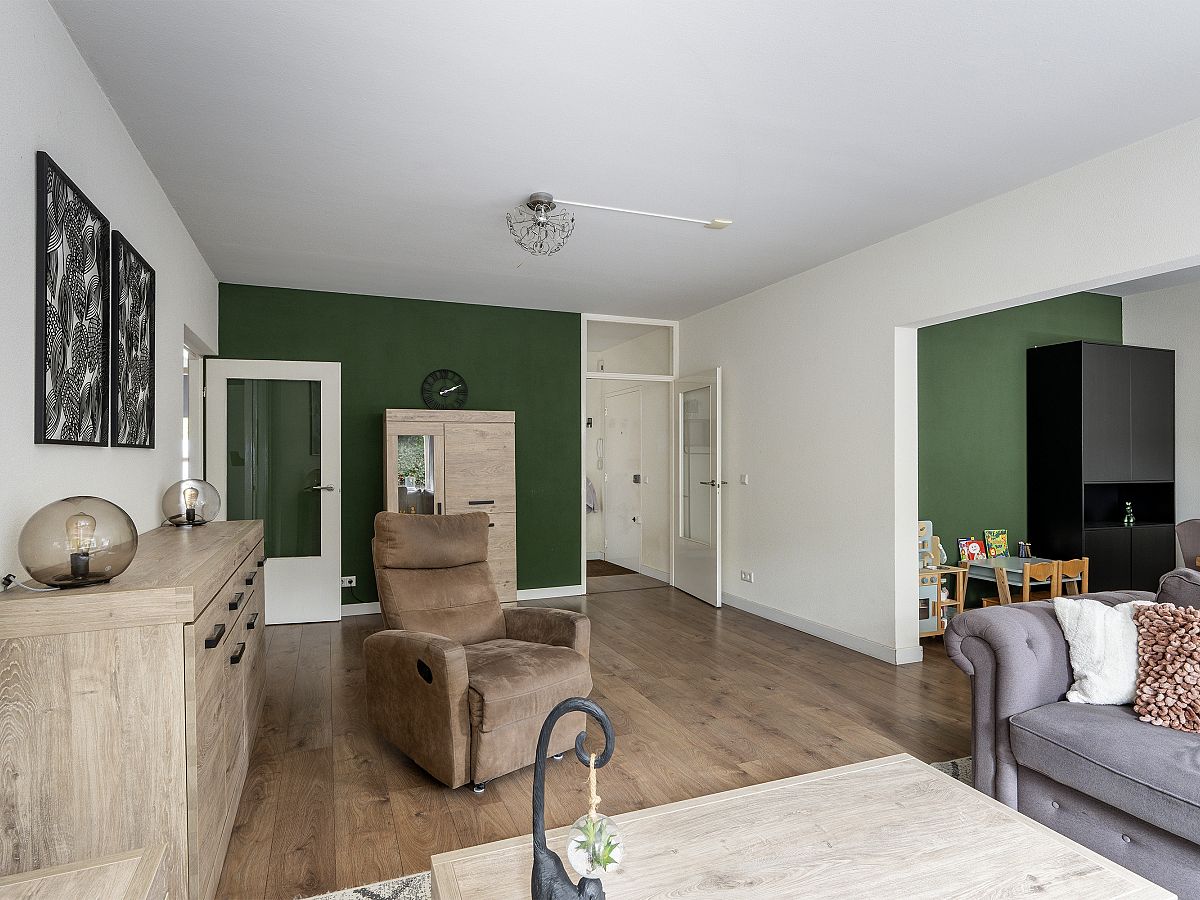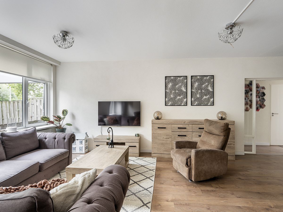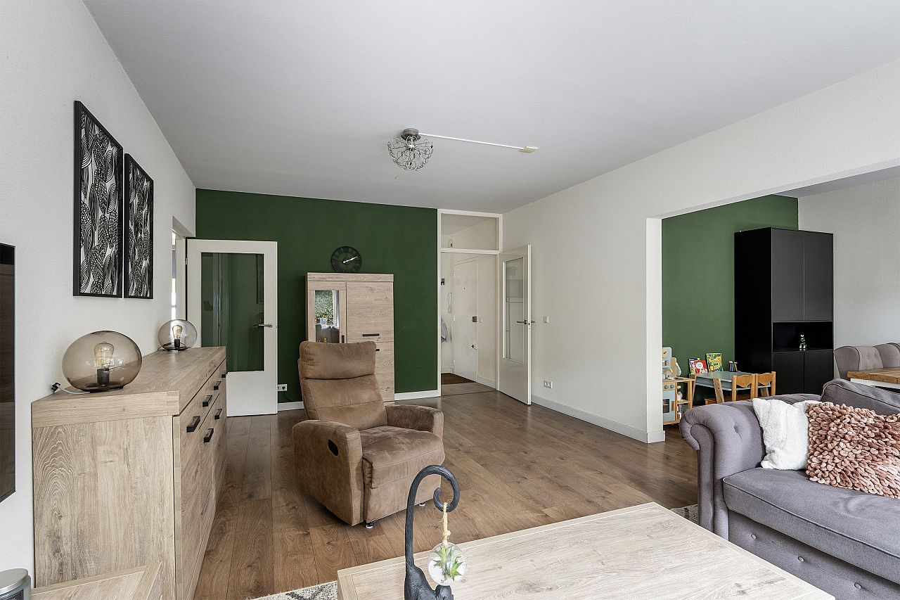 Ruime en lichte woonkamer met zicht op de groene tuin. Toegang tot de slaapkamer, grenzend aan de achtertuin.