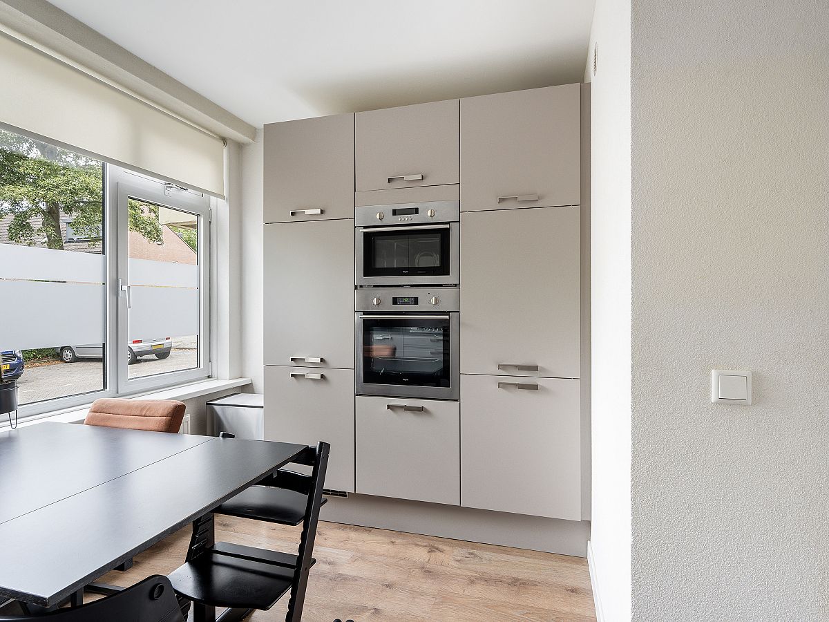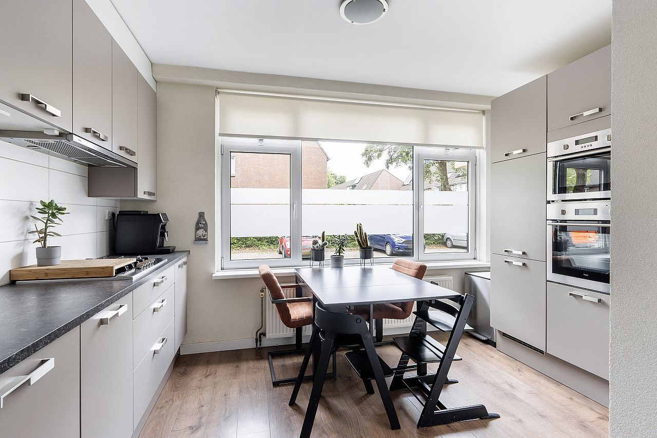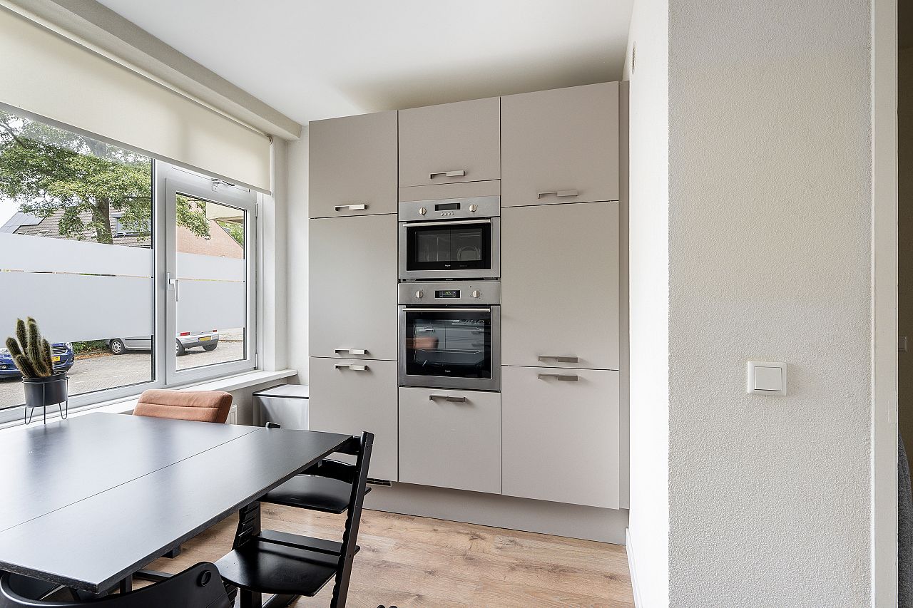De woonkeuken ligt aan de voorzijde van de woning en de keuken heeft een taupe frontinrichting met kunststof aanrechtblad en is uitgerust met een gaskookplaat, afzuigkap, koel/vriescombinatie, heteluchtoven, magnetron, aansluiting voor de wasmachine en is voorzien van aluminium kozijnen met dubbel glas. Opstelplaats c.v. ketel Remeha uit 2019.