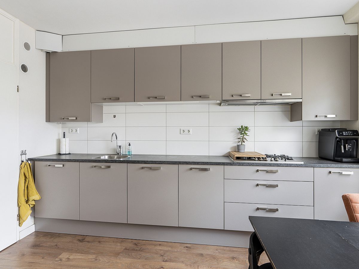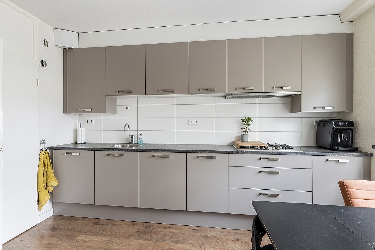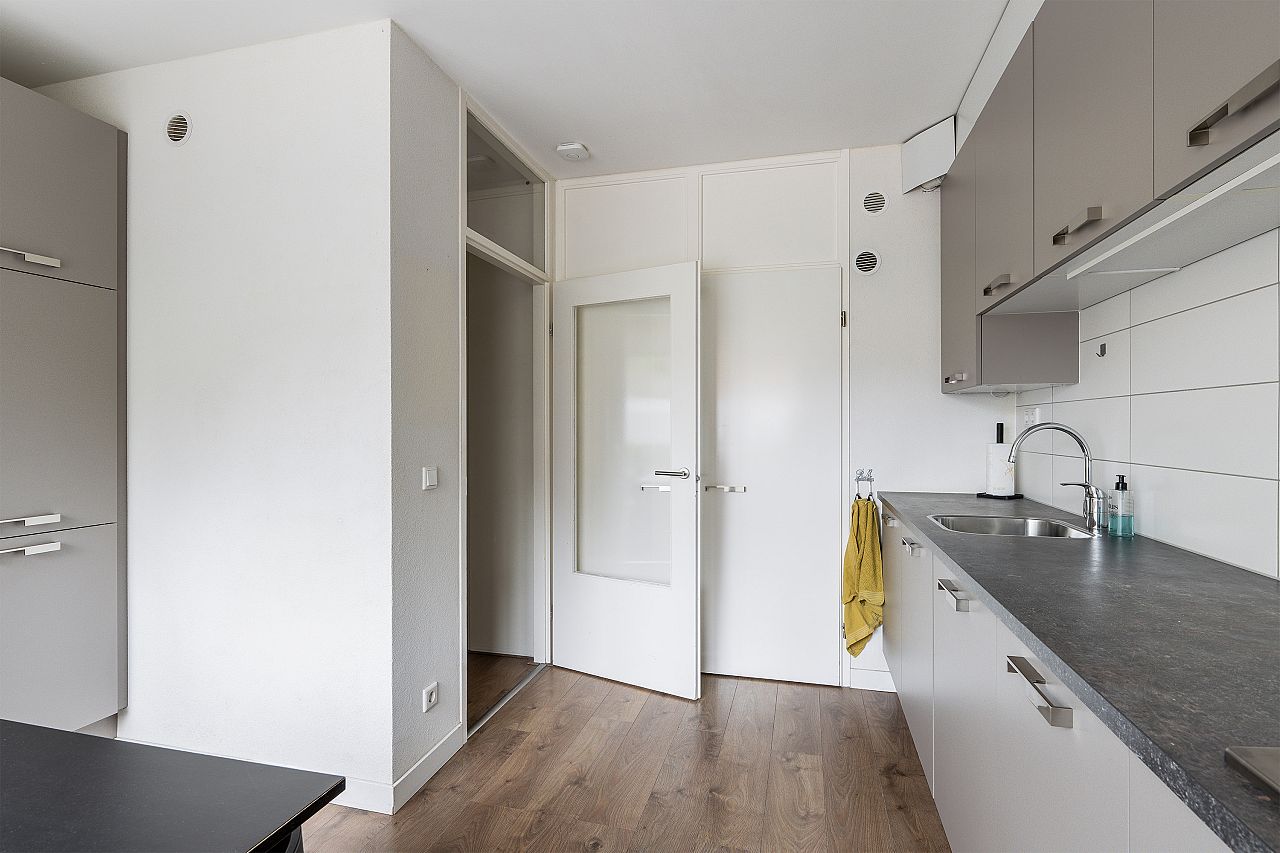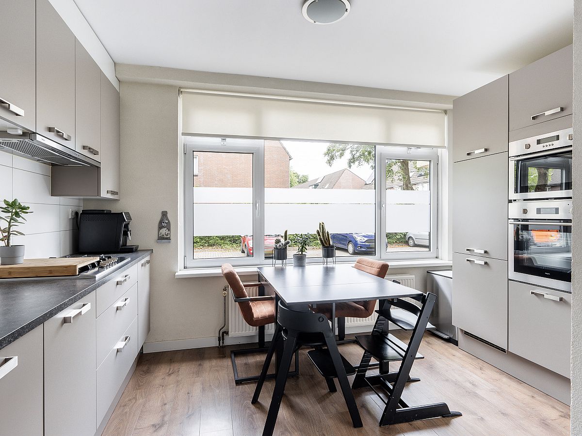 De woonkeuken ligt aan de voorzijde van de woning en de keuken heeft een taupe frontinrichting met kunststof aanrechtblad en is uitgerust met een gaskookplaat, afzuigkap, koel/vriescombinatie, heteluchtoven, magnetron, aansluiting voor de wasmachine en is voorzien van aluminium kozijnen met dubbel glas. Opstelplaats c.v. ketel Remeha uit 2019.