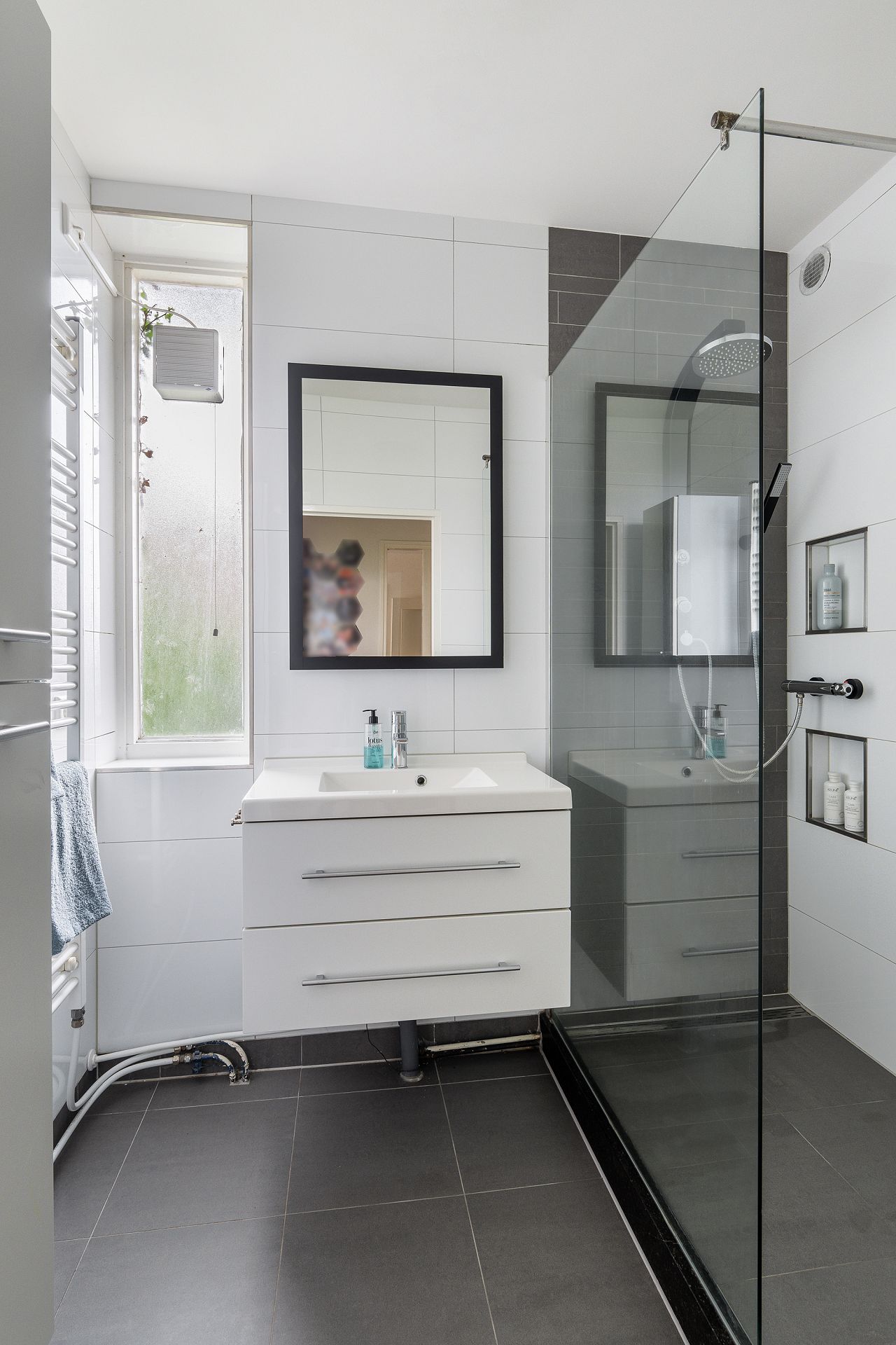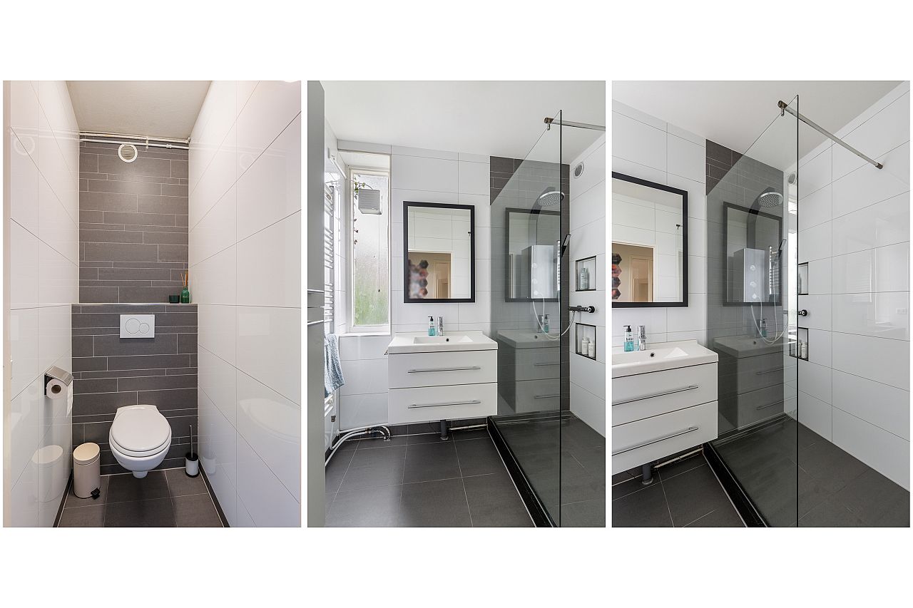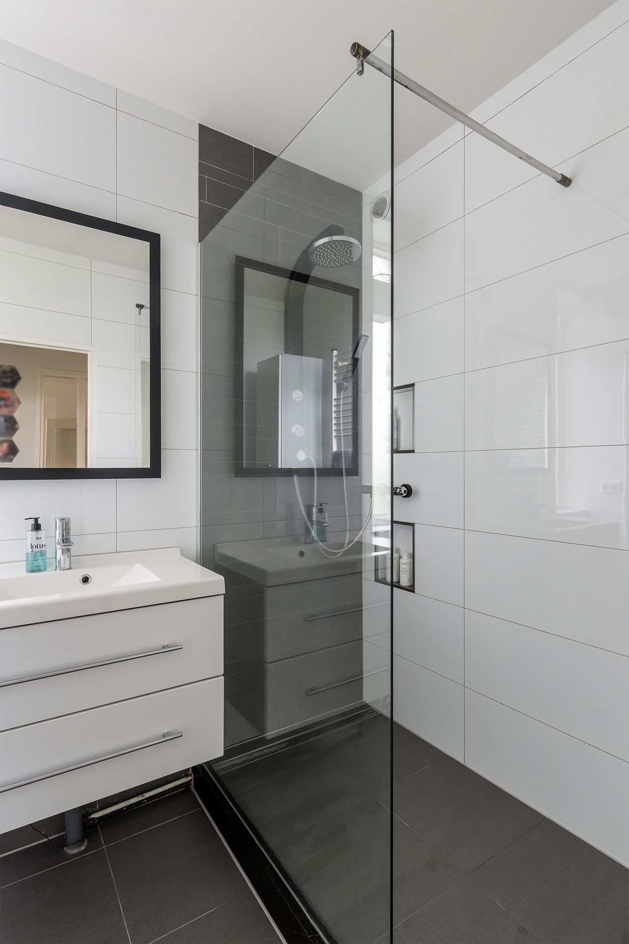 Badkamer in wit/grijze kleurinstelling met inloopdouche en wastafelmeubel.