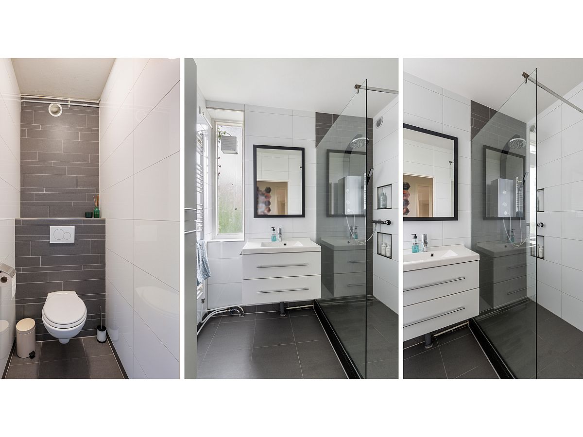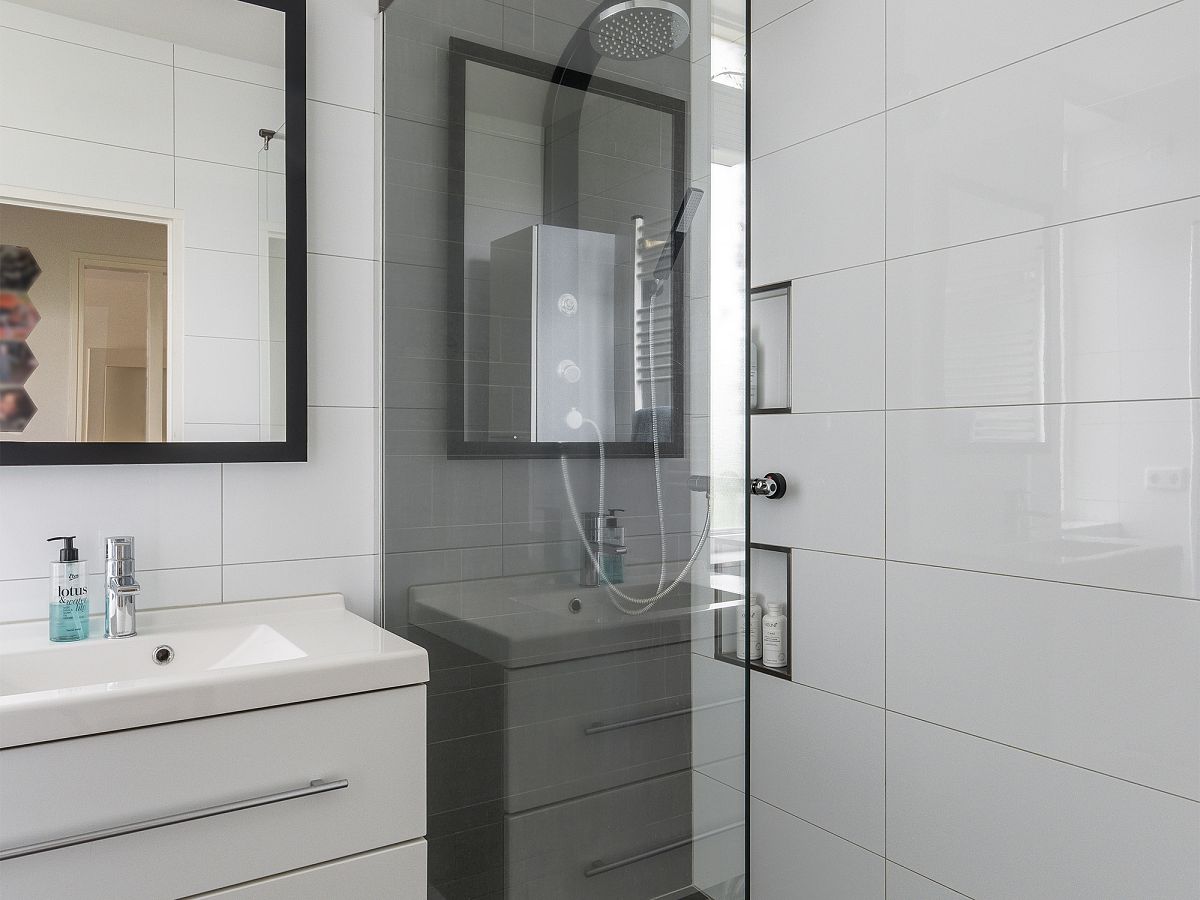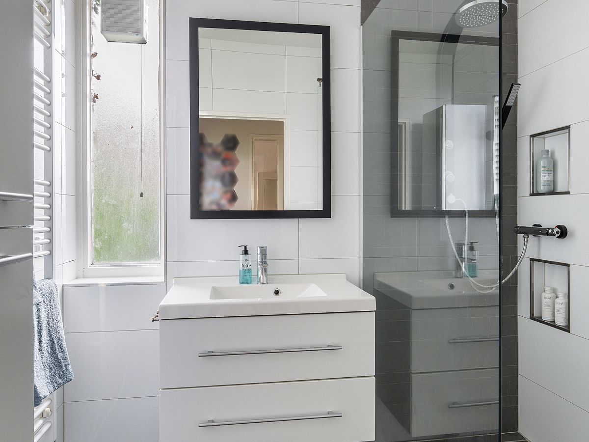 Badkamer in wit/grijze kleurinstelling met inloopdouche en wastafelmeubel.