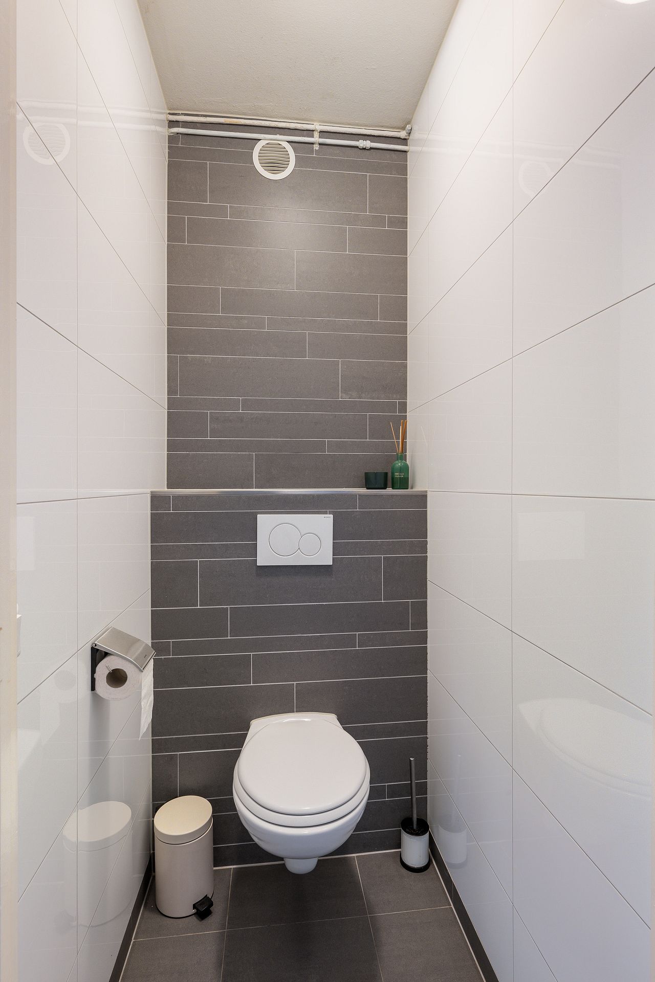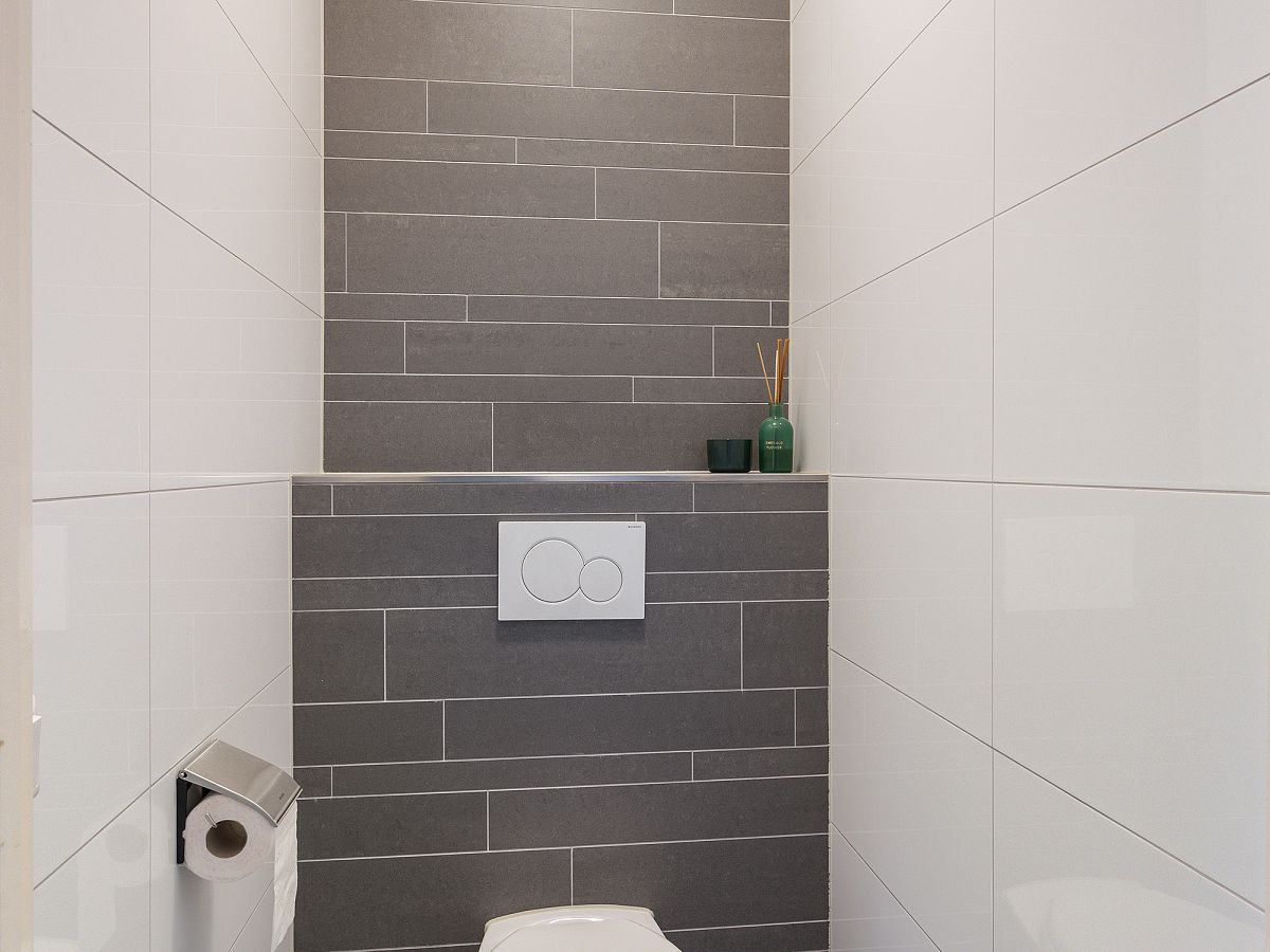 Toiletruimte met wandclosetcombinatie en geheel wit betegelde wanden.