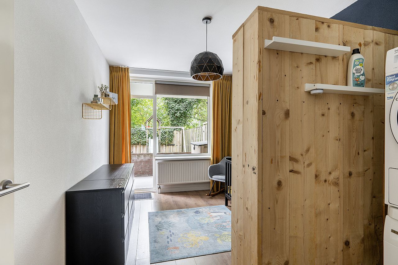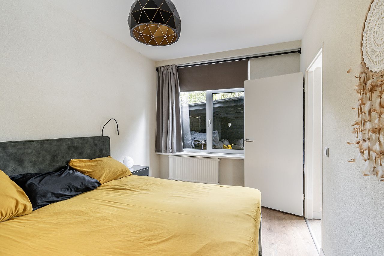 Slaapkamer aan de tuinzijde met aansluiting voor wasmachine en droger en kunststof pui naar de tuin.