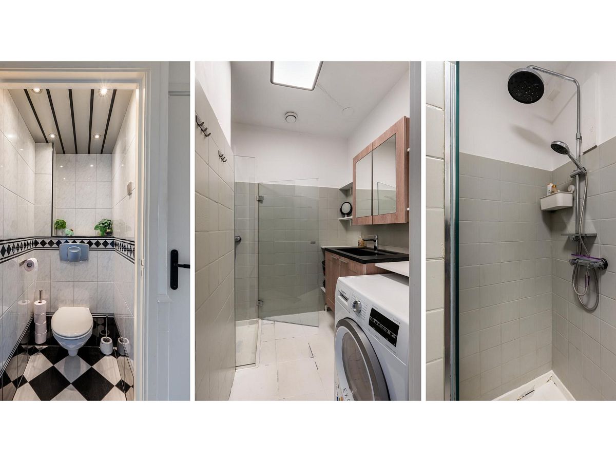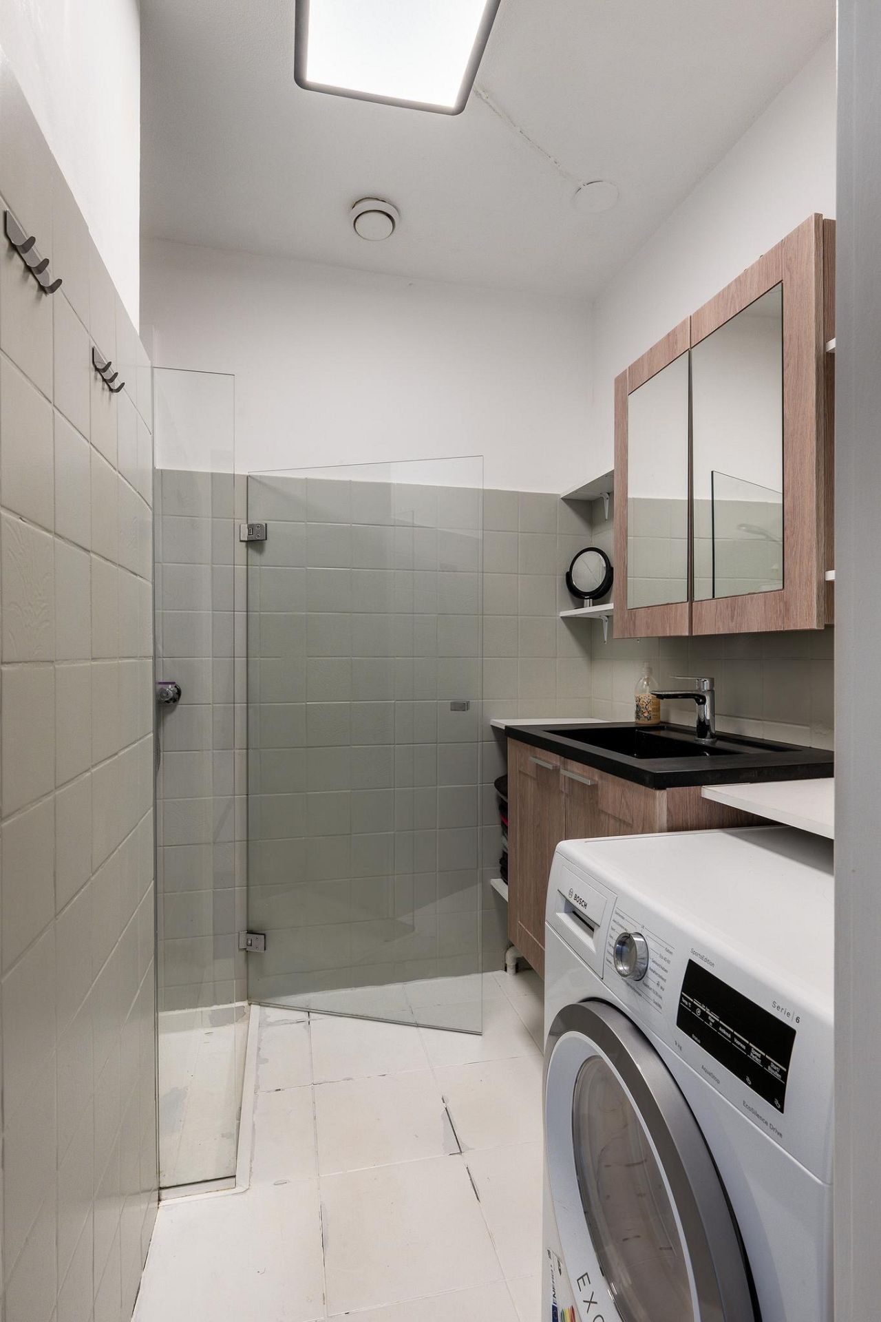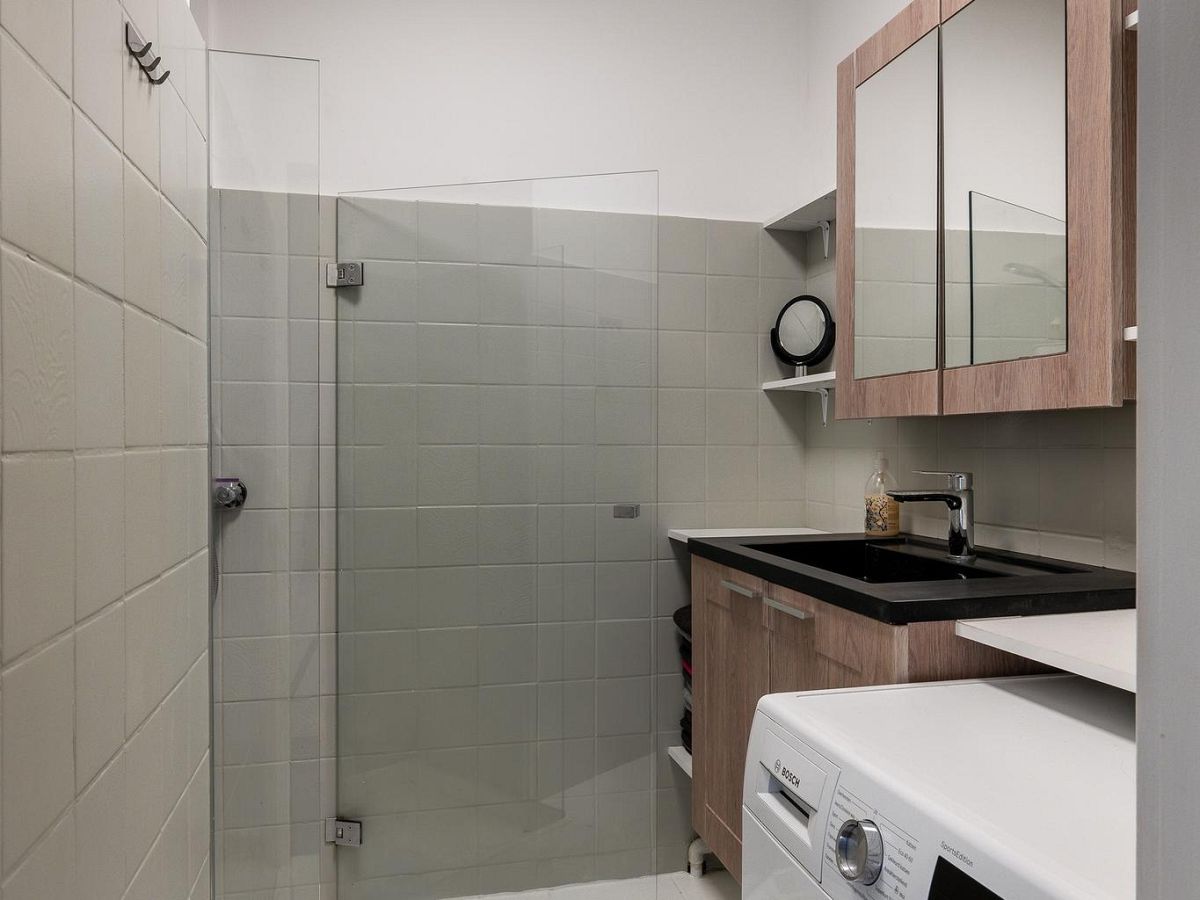 Badkamer met door glazen wand afgescheiden douchehoek, wastafelmeubel en opstelling wasmachine.
