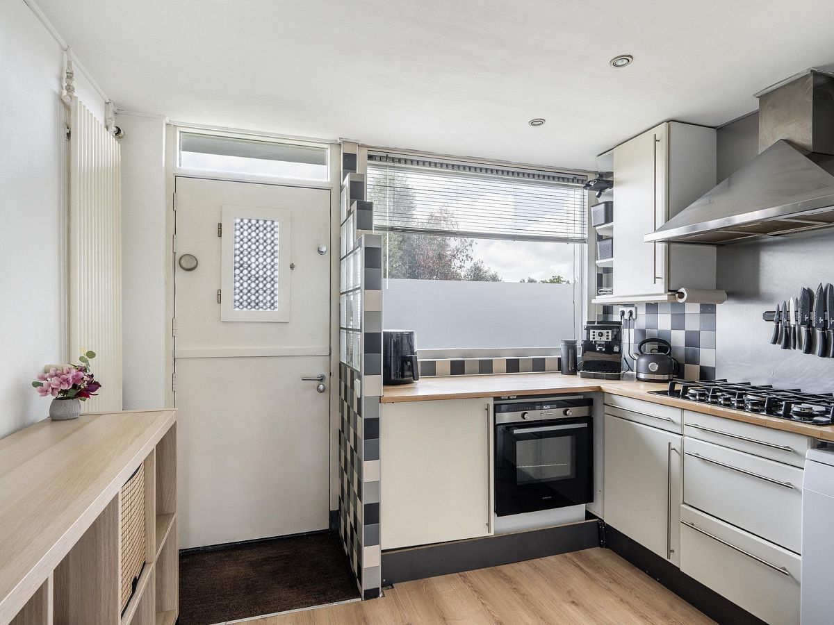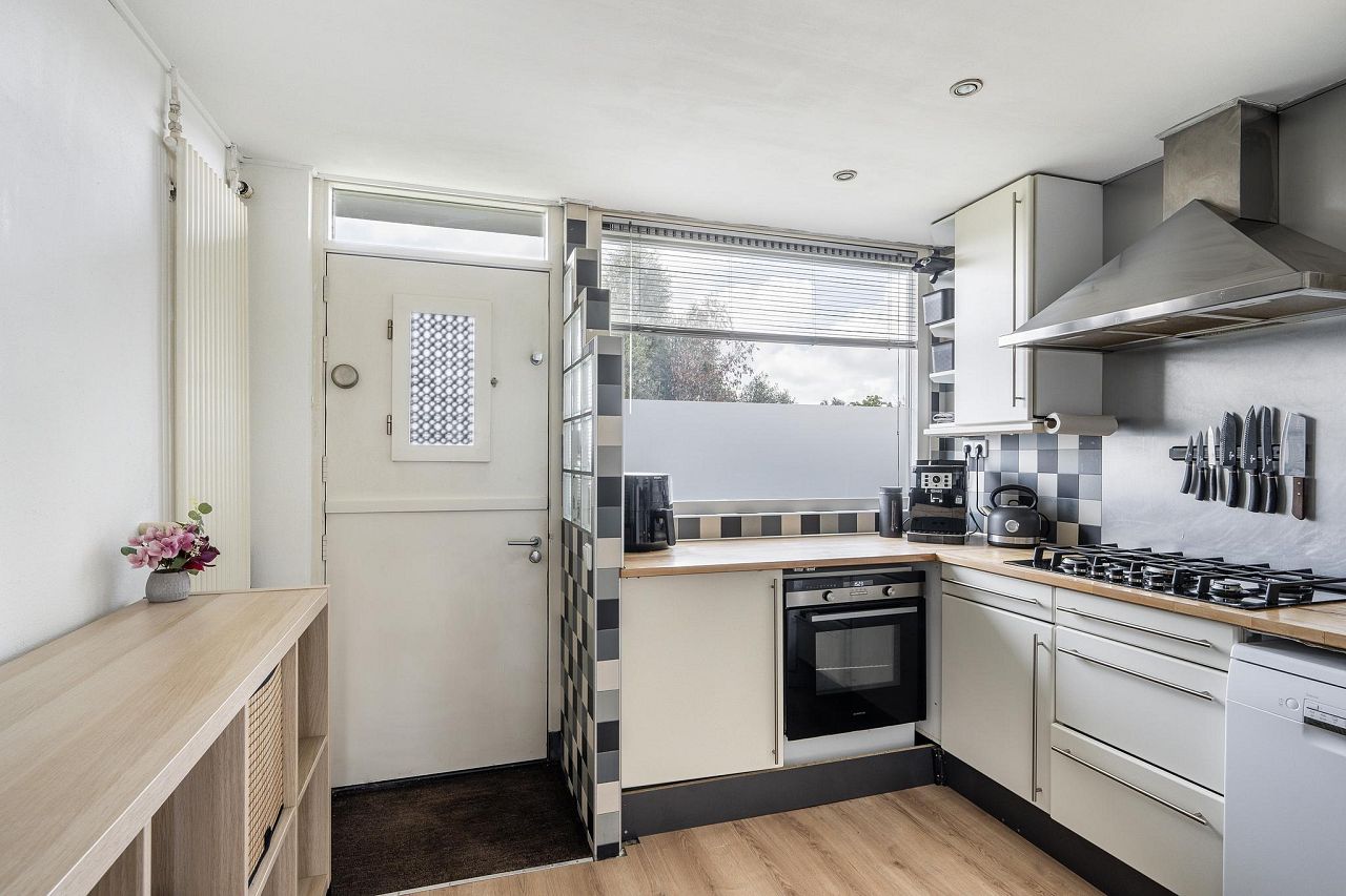 Keuken in U-opstelling met houten werkblad en 5-pitsgaskookplaat, afzuigkap, vaatwasser, oven, vriezer. Hier is ook de CV-ketel (Remeha, eigendom, 2021) opgesteld.