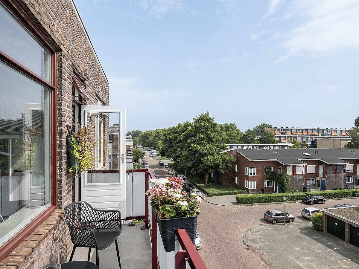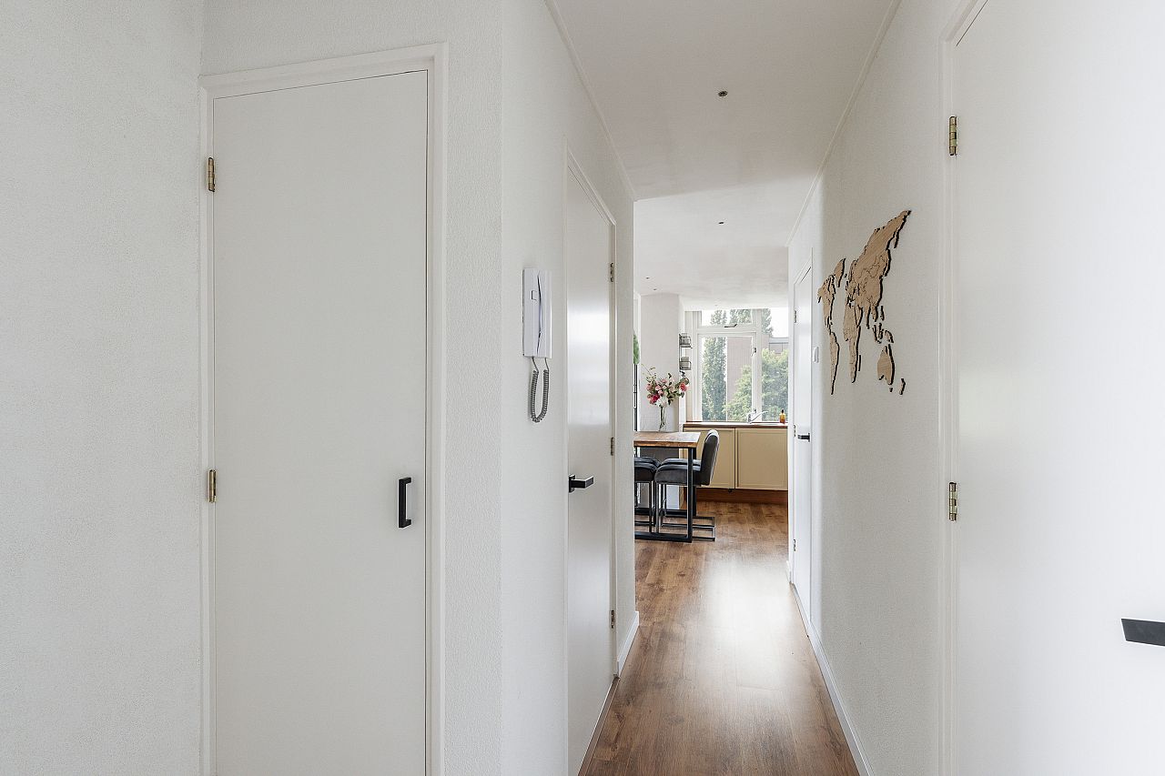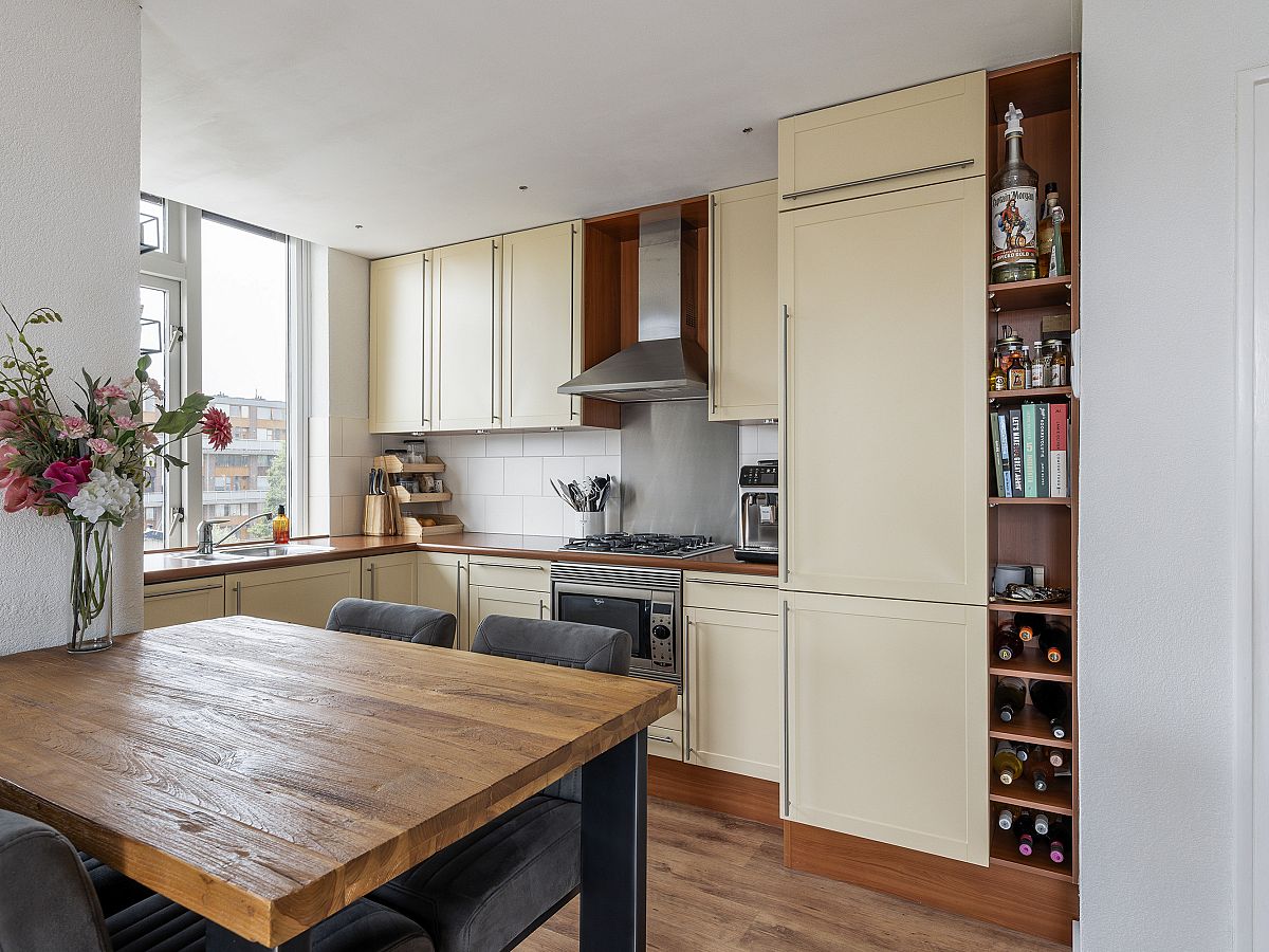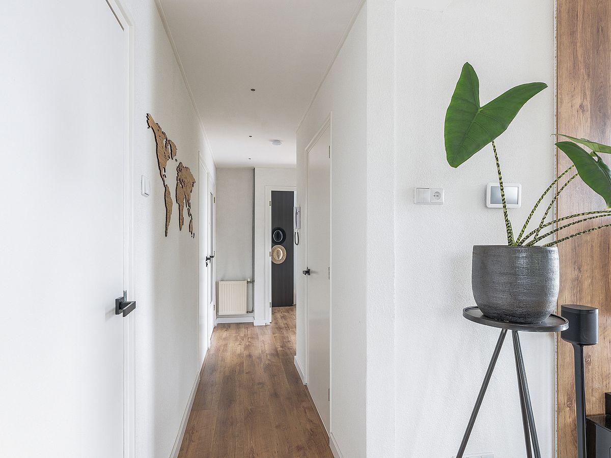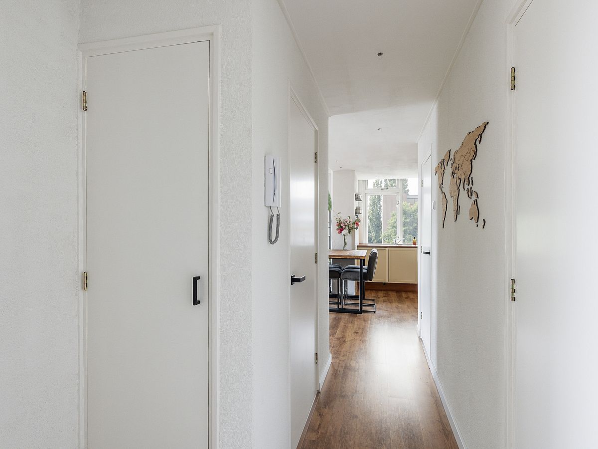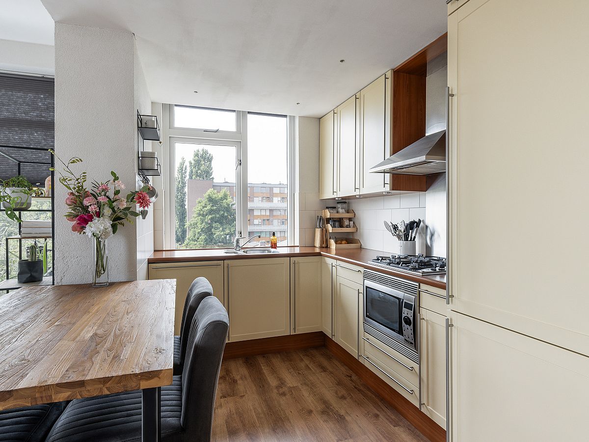 Entree, tochtportaal; vernieuwde meterkast. De woonkamer met open hoekkeuken is praktisch ingedeeld. Vanuit de woonkamer is er toegang tot het balkon. De keuken heeft vanille kleurige fronten en een houtlook aanrechtblad en is uitgerust met een combimagnetron, koel-vriescombinatie, 4-pits gaskookplaat, afzuigkap en vaatwasser. Aan de zonkant bevinden zich screens voor de ramen.