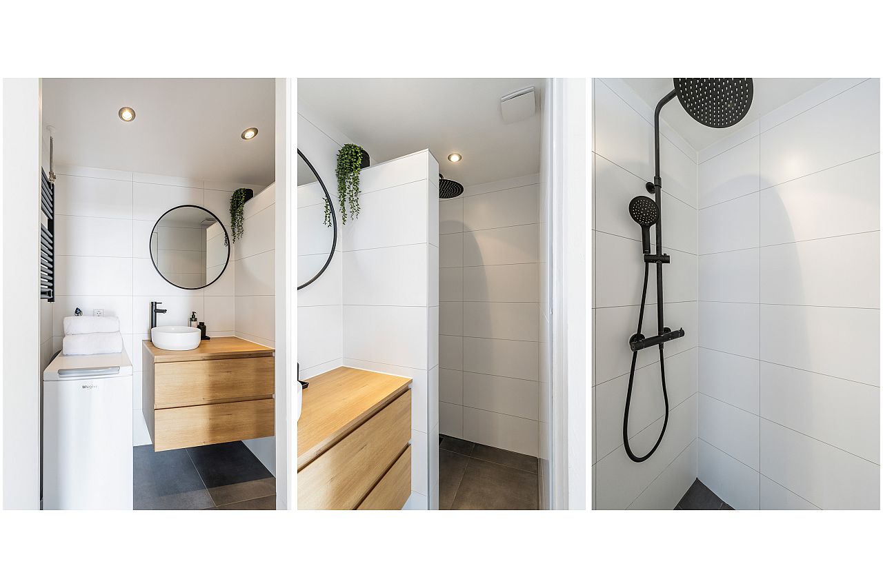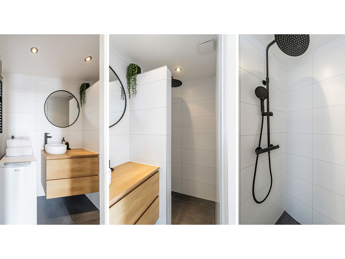 De badkamer dateert uit 2024 en is grijs/wit betegeld met douche, wastafelmeubel en aansluiting voor de wasmachine.