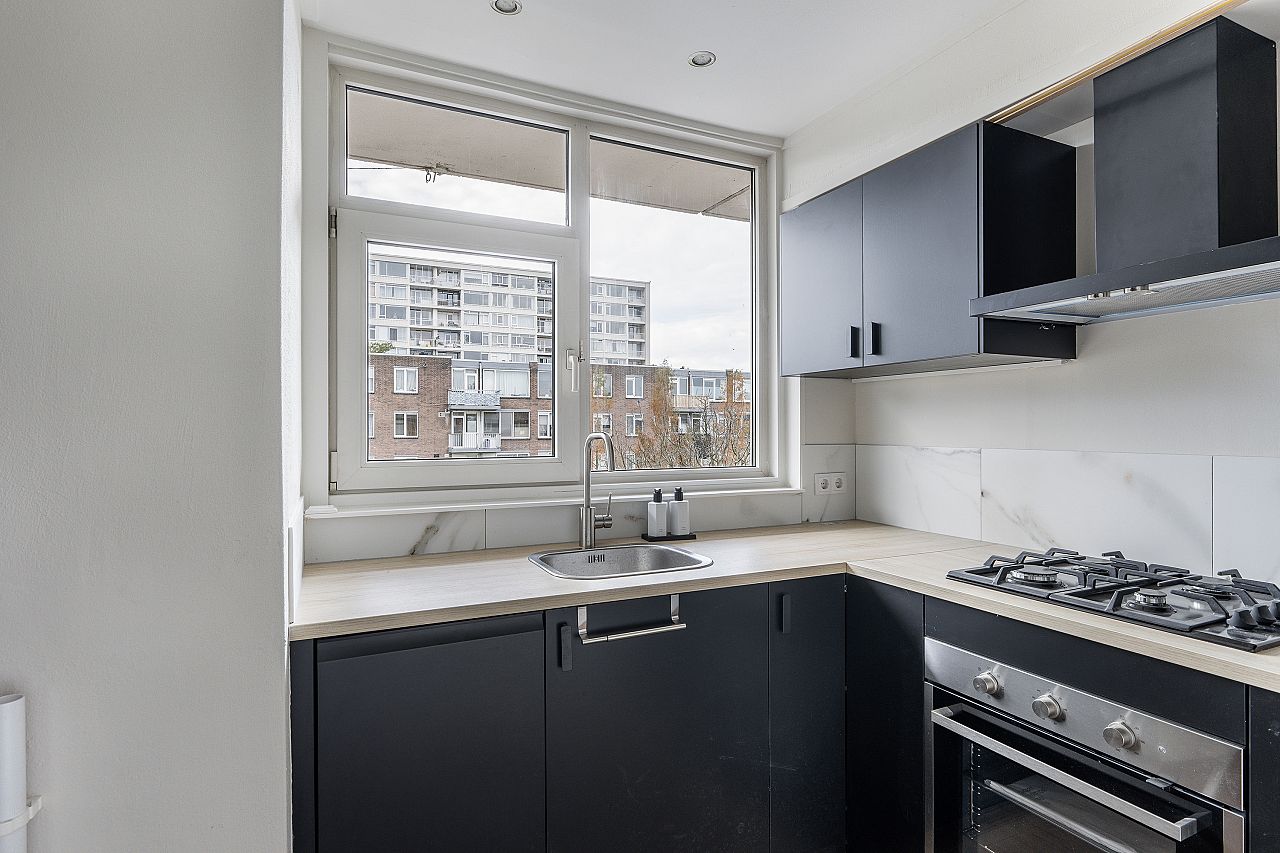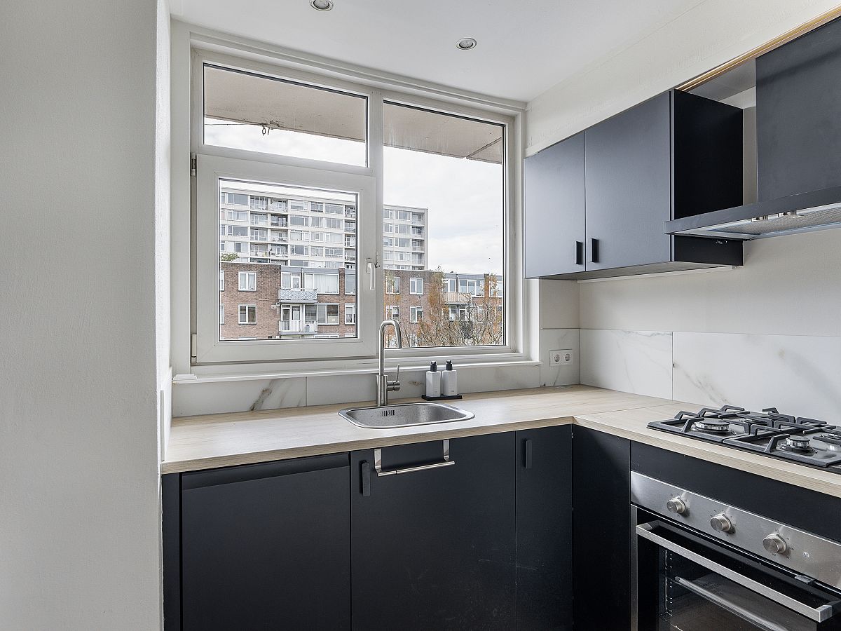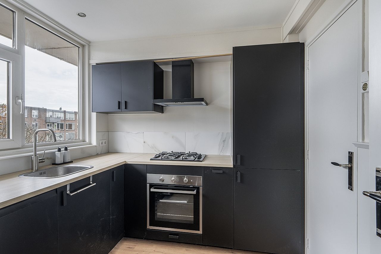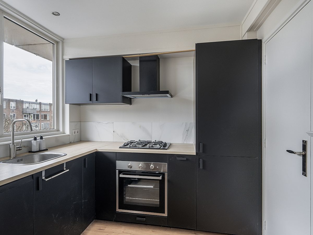 De keuken is in 2024 nieuw geplaatst en heeft een houtlook aanrechtblad, zwarte fronten en is voorzien van gaskookplaat, afzuigkap, oven, vaatwasser en koel/vriescombinatie. In de keuken is tevens de aansluiting voor een smalle wasmachine.