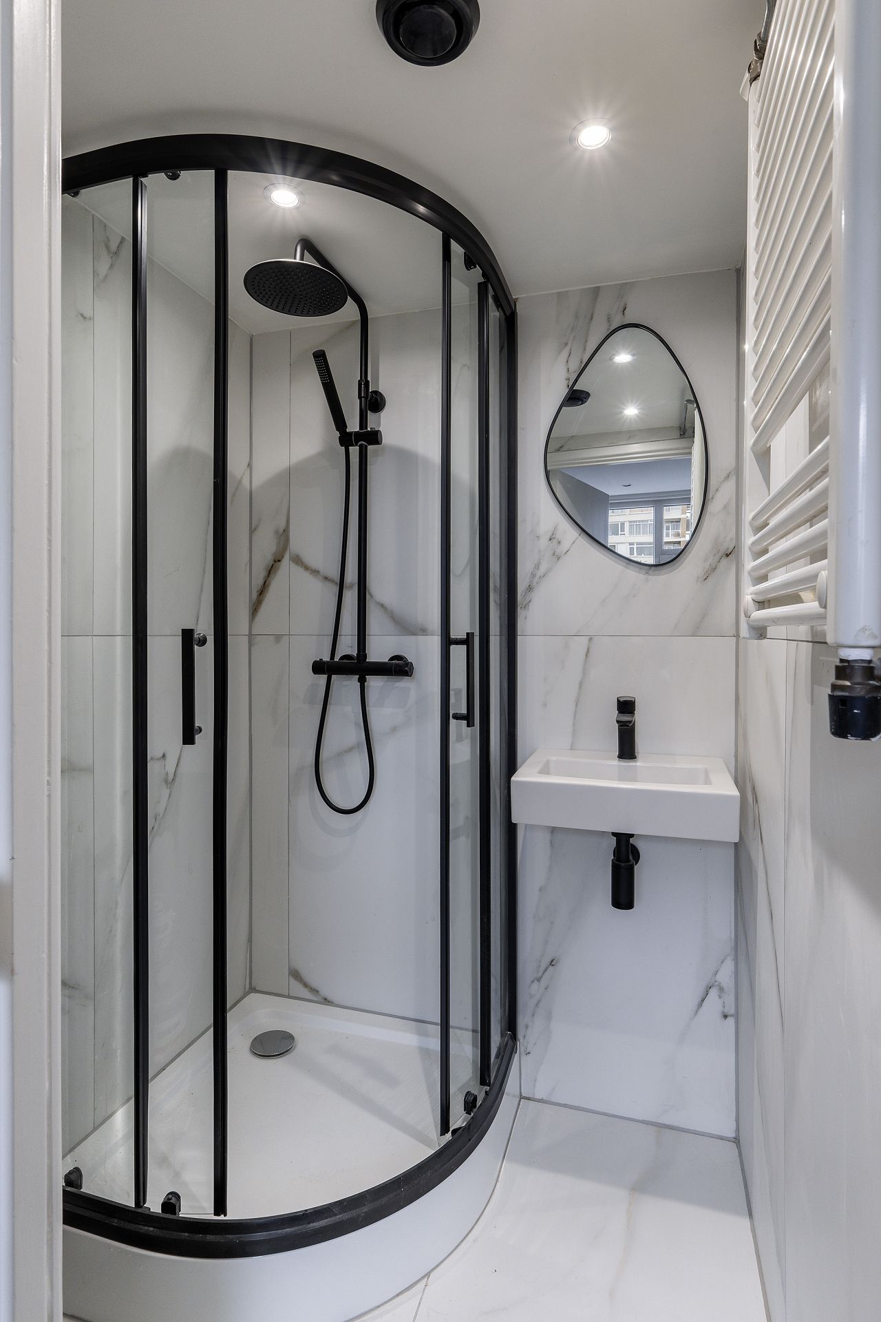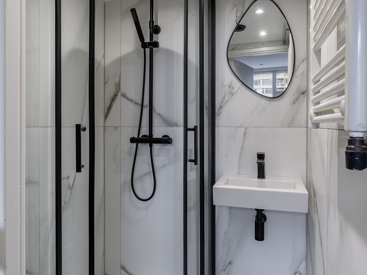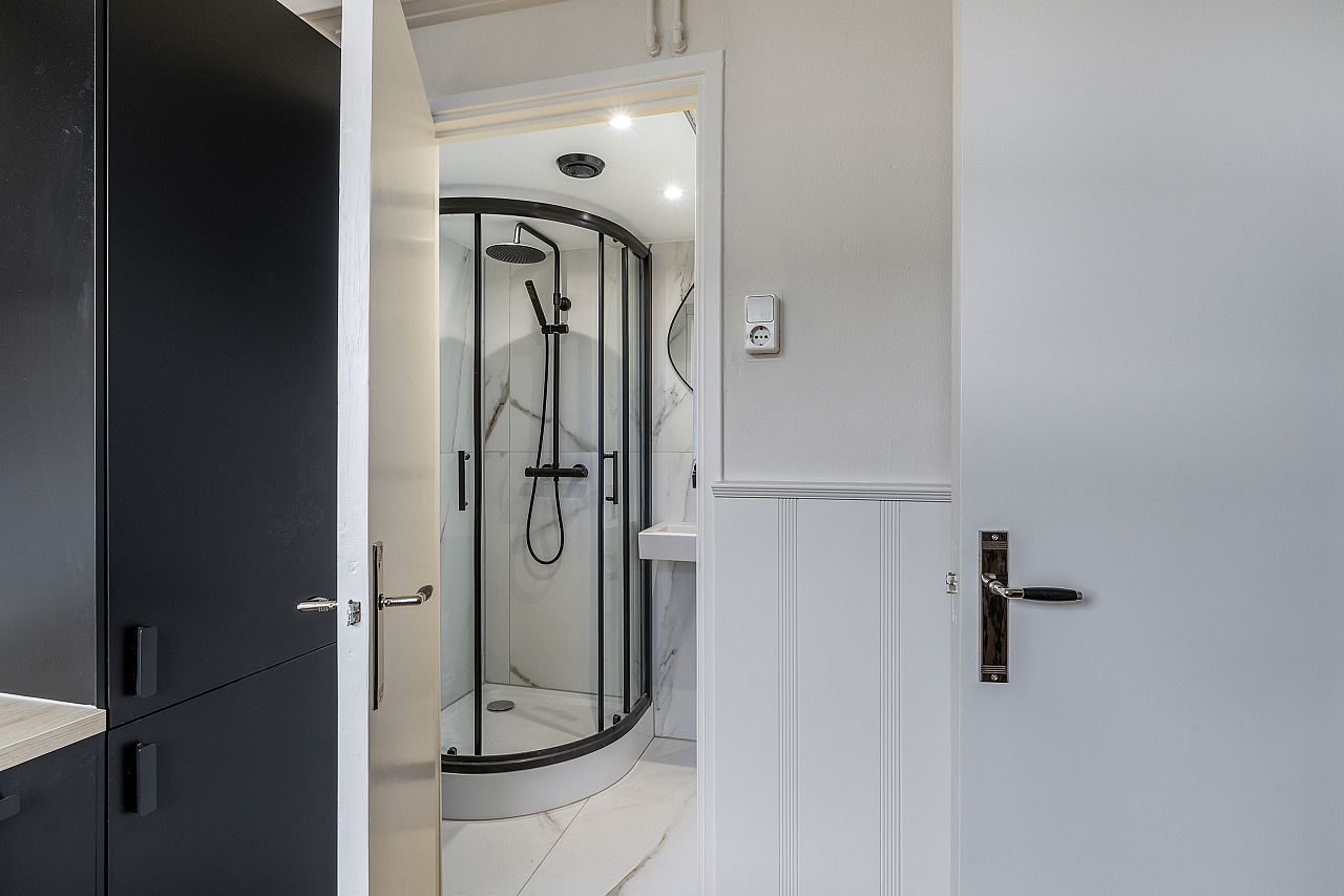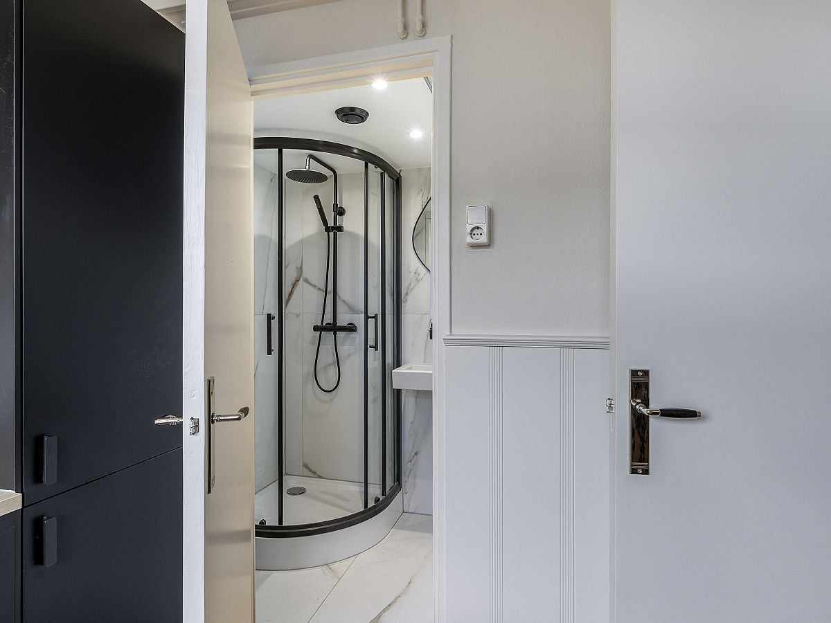 Toegang tot de badkamer. Deze is ook in 2024 vernieuwd, heeft een douchehoek en wastafel en is afgewerkt met marmerlook tegels en zwarte accessoires.