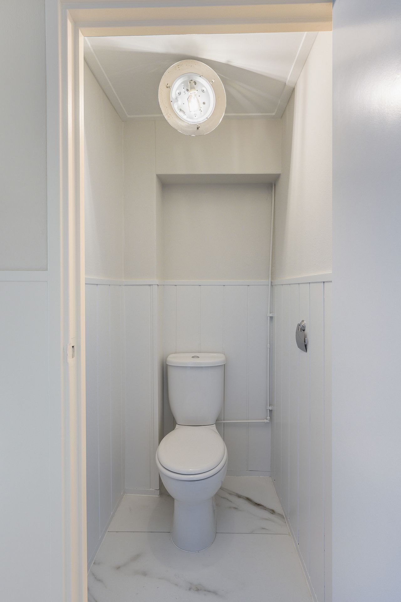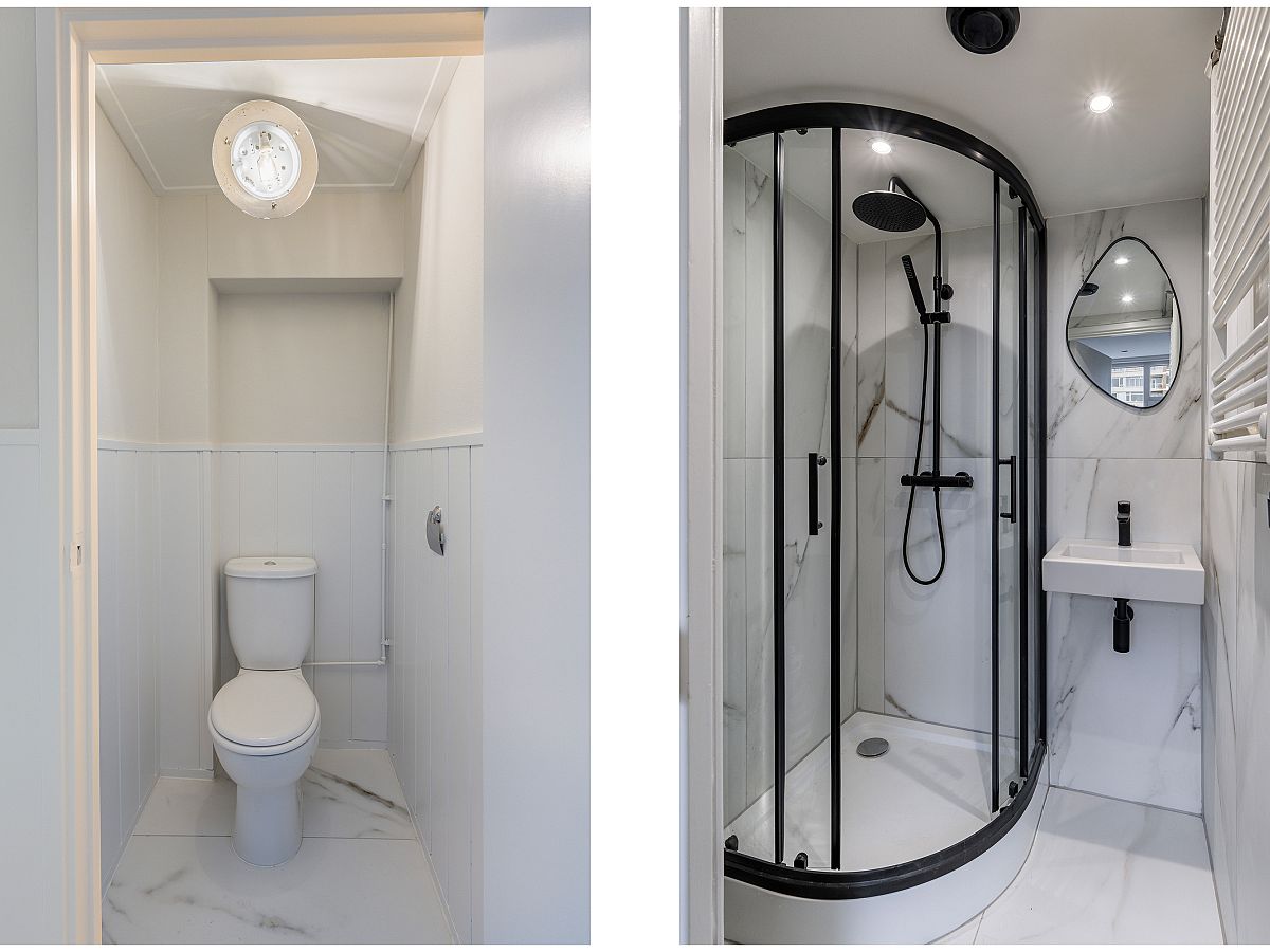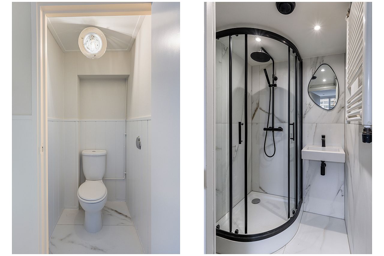 Toegang tot de badkamer. Deze is ook in 2024 vernieuwd, heeft een douchehoek en wastafel en is afgewerkt met marmerlook tegels en zwarte accessoires.